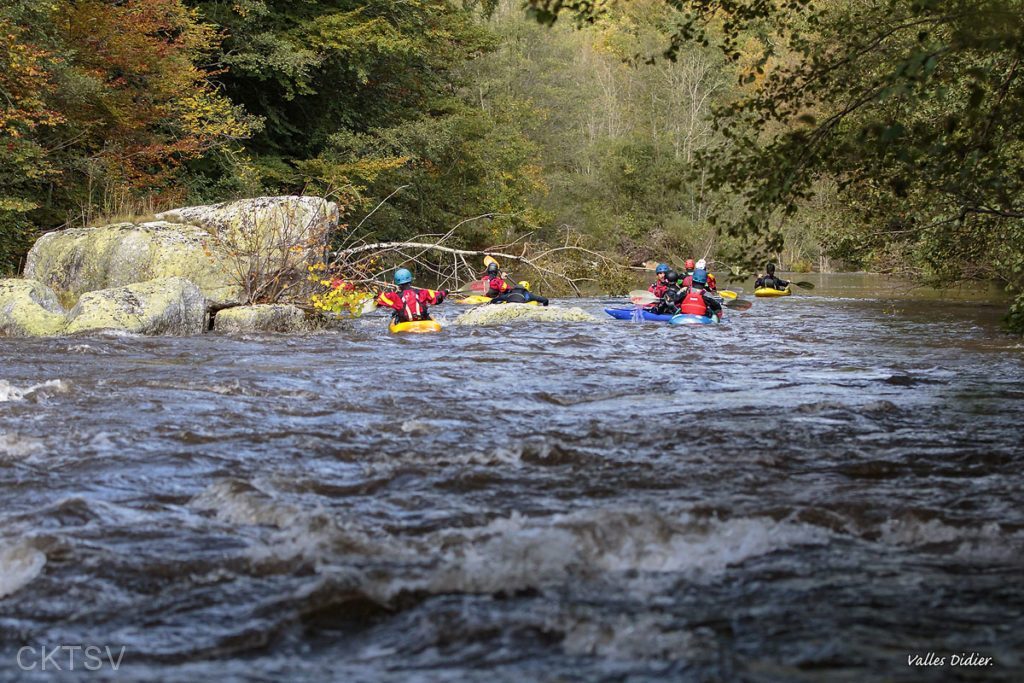 A peine le temps de reprendre ses esprits que les 1ers seuils arrivent ! Je baigne dès le premier d’ailleurs, ah OK je n’avais pas compris que la fin de la rivière n’était pas de la rigolade même si on avait passé THE rapide ! C’est noté, on va rester plus concentrée… Au rapide suivant, c’est Christelle qui se dévoue pour nous montrer où NE PAS passer, nous la remercions chaleureusement et passons tous bien à droite pour ne pas être coincés là où l’ex-infran rappelle. La fatigue commence à se faire sentir (la faim aussi d’ailleurs !), heureusement que l’arrivée approche. Derniers passages traitres, pas de fêlures mais quelques oreilles mouillées, avec une récup à la pointe moins une… Mais c’est la 3ème pagayeuse qui finira bientôt mouillée, jamais deux sans 3 ! Le seuil au niveau de la déviation aura eu raison d’Anna, et failli lui coûter une pagaie qui part jouer à cache-cache… finalement tout et tout le monde est récupéré, on termine la descente avec le passage dans le village et son charmant pont pour débarquer au niveau du camping.