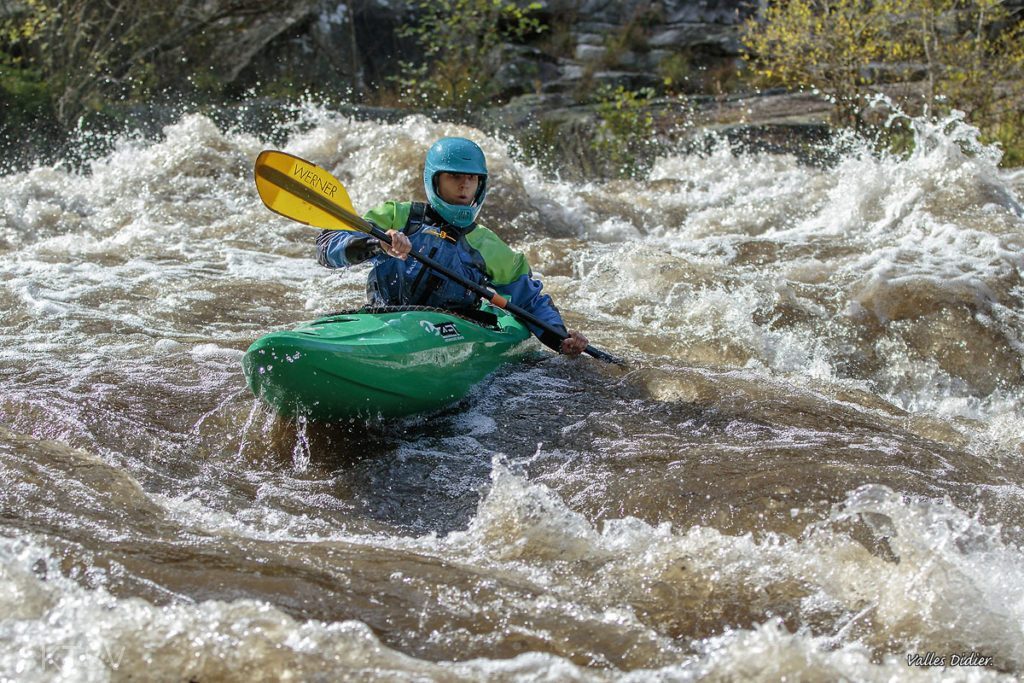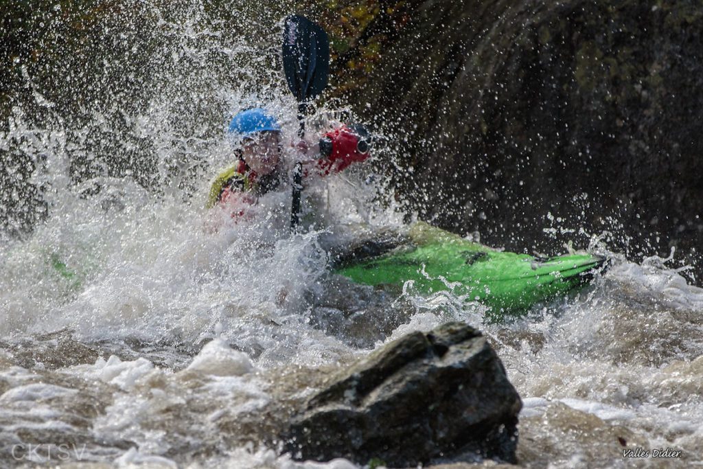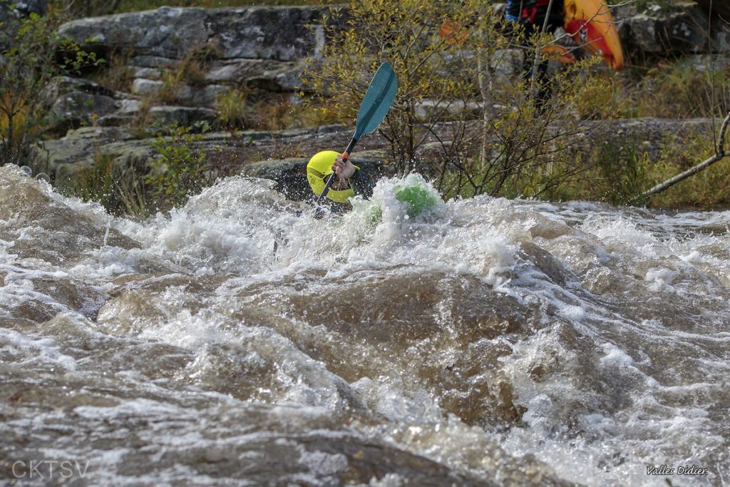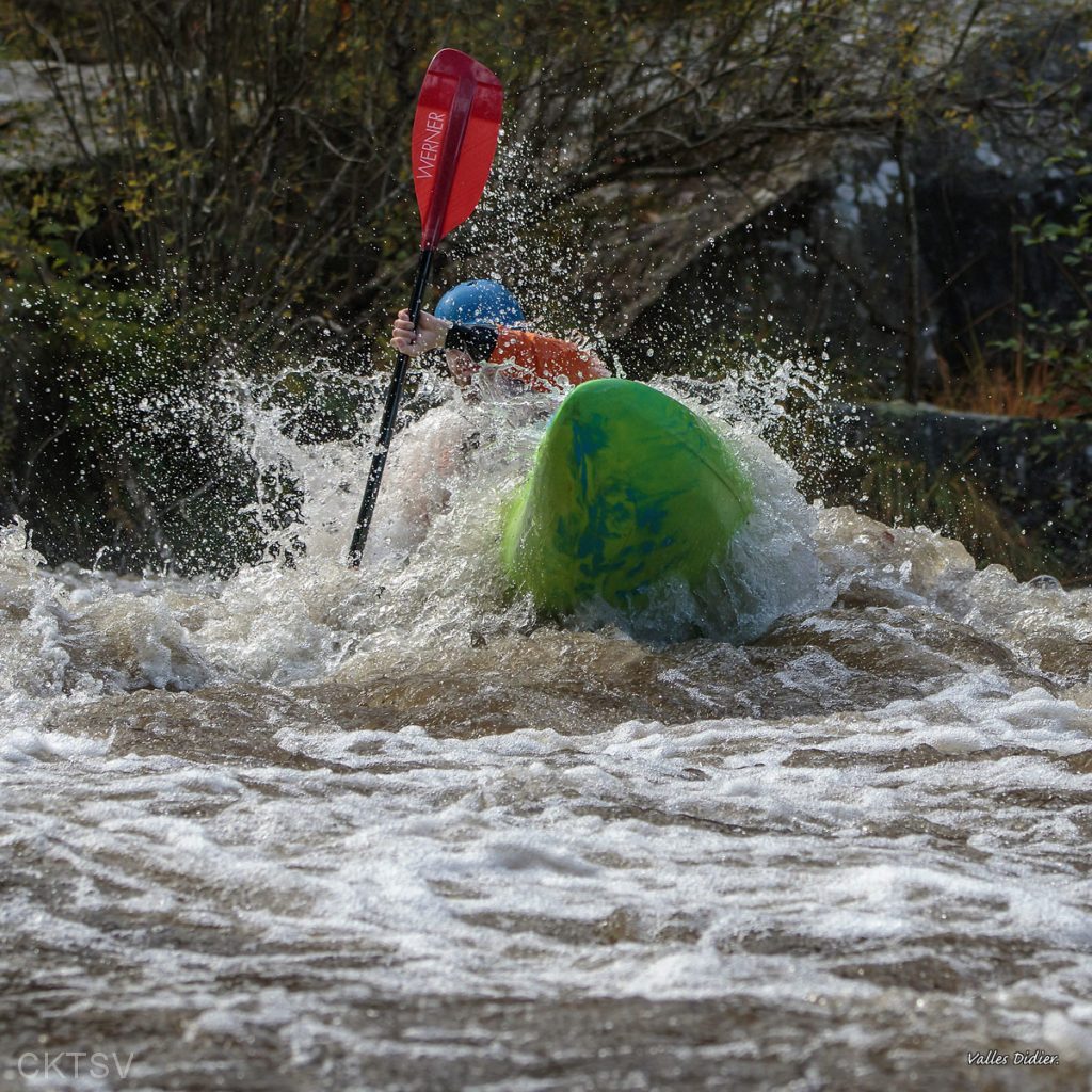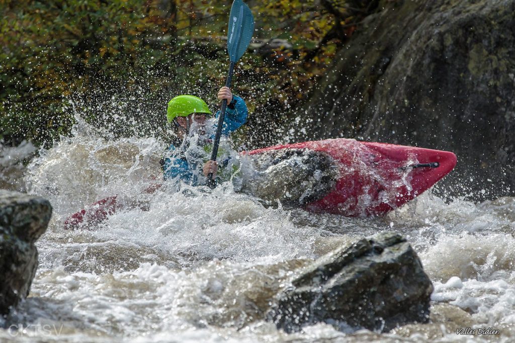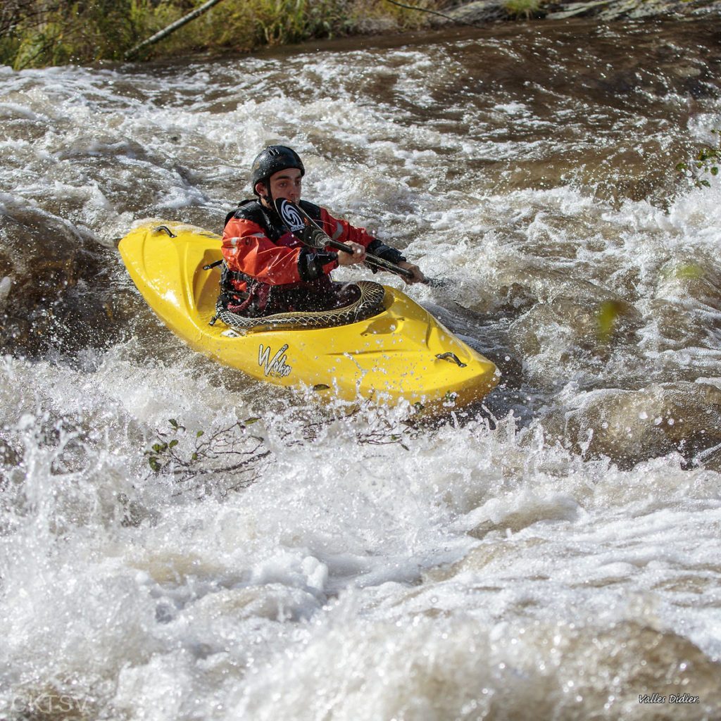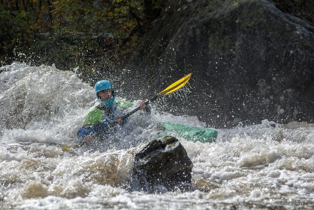 Cette fois, les choses commencent pour de bon, les petits arbustes sont remplacés par des bons gros rochers et de jolies vagues et rouleaux, ça mouille et ça remue mais ça passe ! D’autres rapides s’enchainent, avec quelques surprises – ah ben ça tombe bien que ce rocher soit plat, ça permet un beau slide pour éviter de baigner dans le drossage ! (Bonus= figure artistique involontaire… ) On s’approche de plus en plus du point culminant de la descente, jusqu’à voir un gros attroupement de kayakistes dans un contre… ca y est, le fameux, l’unique !!! Il y a même quelques fous furieux en SUP… il y en a qui en veulent quand même !