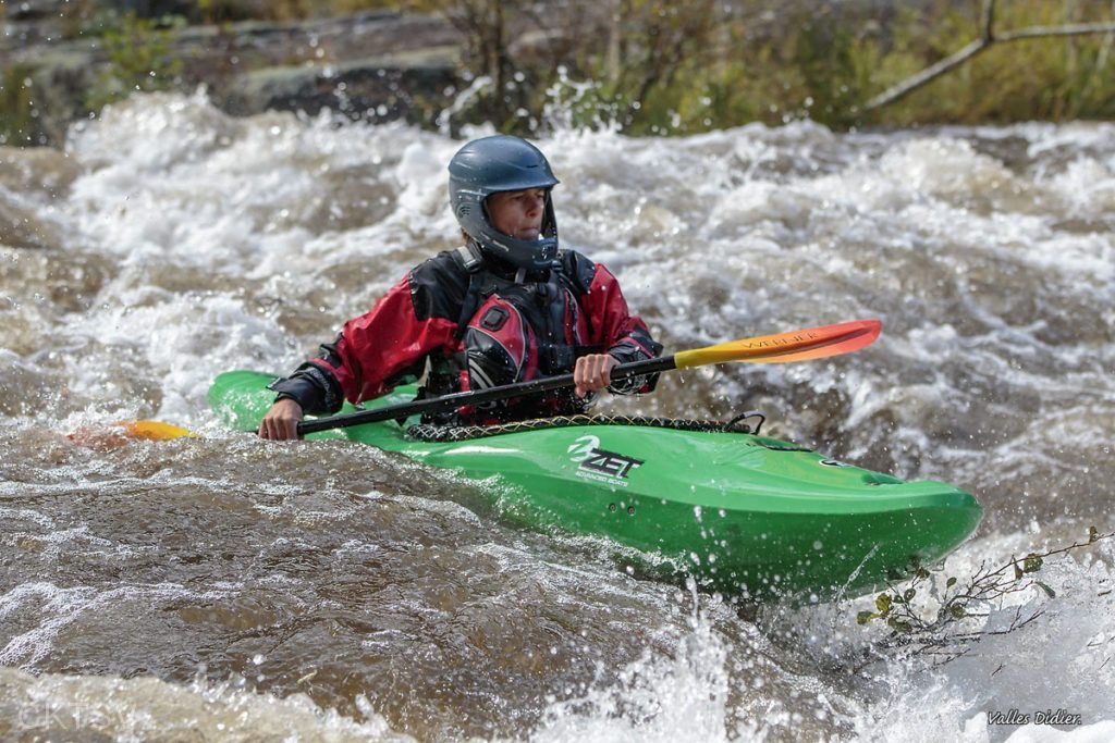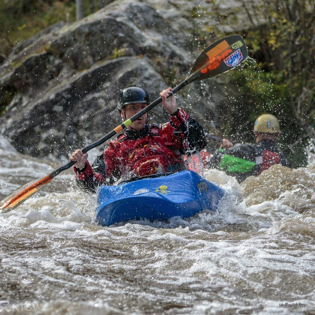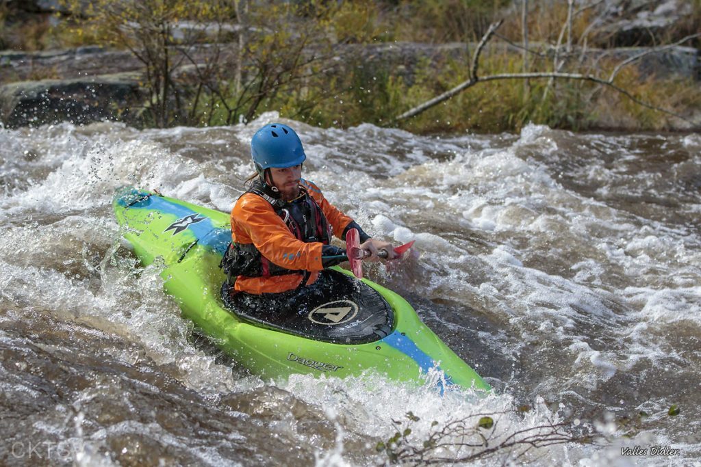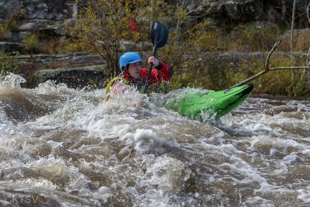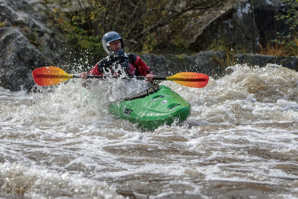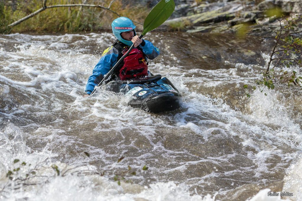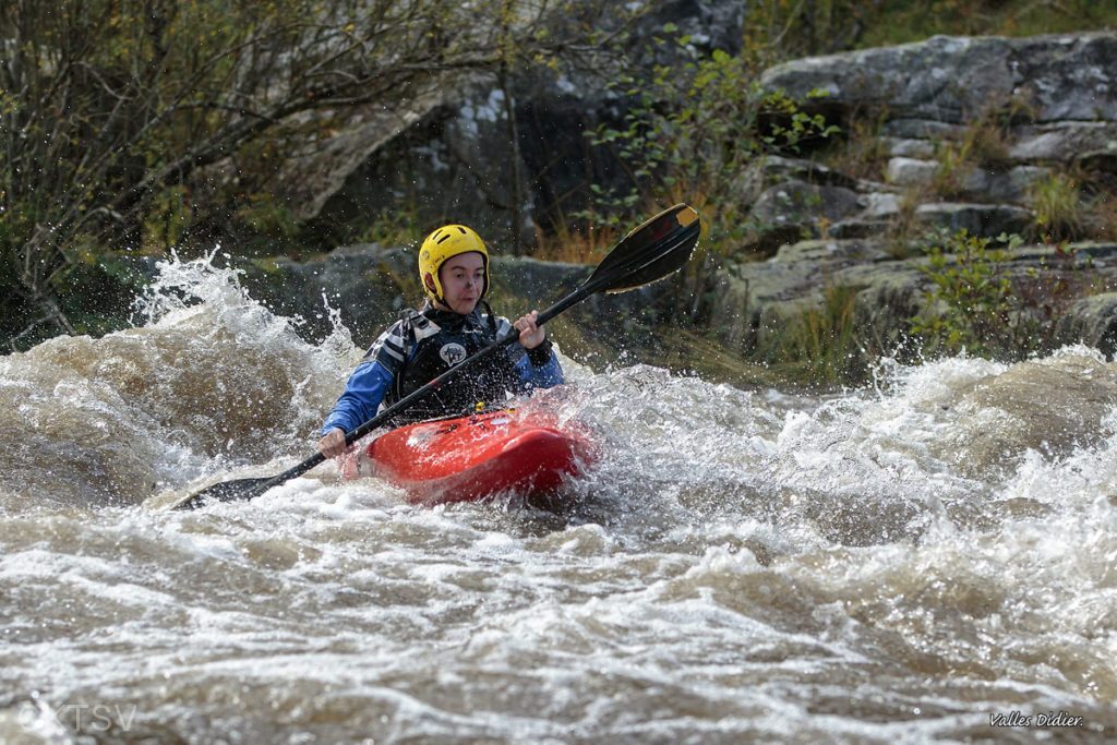 Cette fois, les choses commencent pour de bon, les petits arbustes sont remplacés par des bons gros rochers et de jolies vagues et rouleaux, ça mouille et ça remue mais ça passe ! D’autres rapides s’enchainent, avec quelques surprises – ah ben ça tombe bien que ce rocher soit plat, ça permet un beau slide pour éviter de baigner dans le drossage ! (Bonus= figure artistique involontaire… ) On s’approche de plus en plus du point culminant de la descente, jusqu’à voir un gros attroupement de kayakistes dans un contre… ca y est, le fameux, l’unique !!! Il y a même quelques fous furieux en SUP… il y en a qui en veulent quand même !