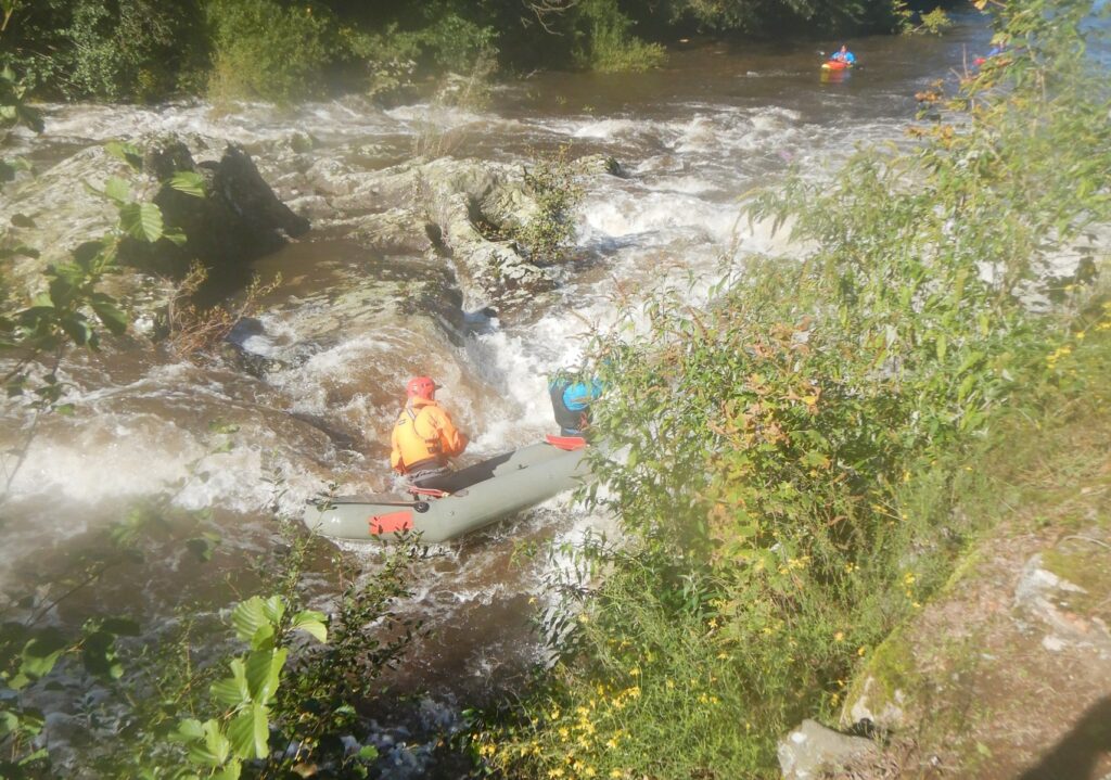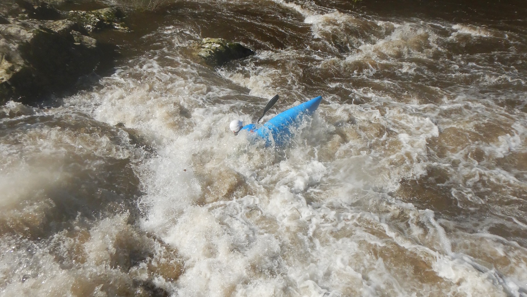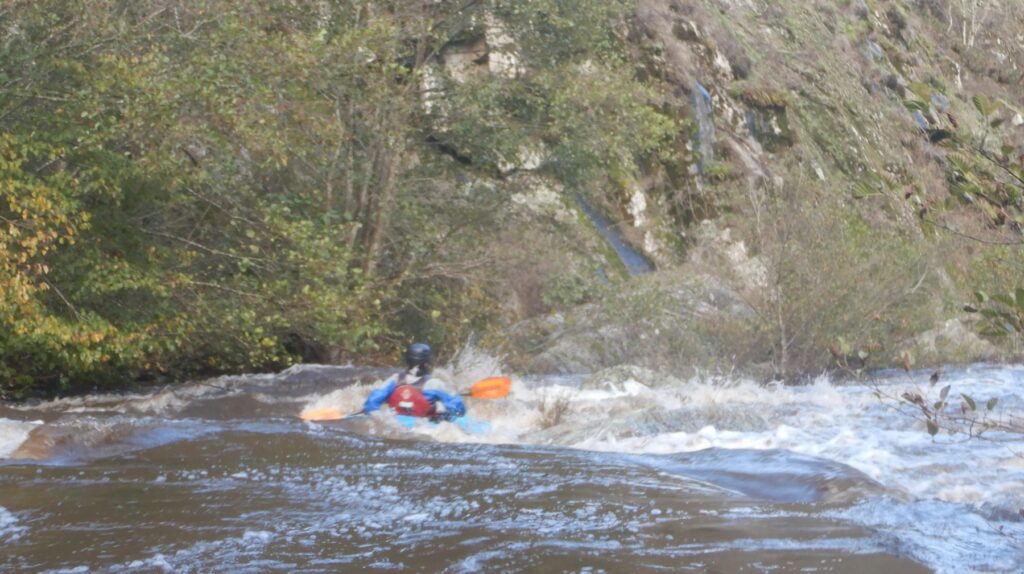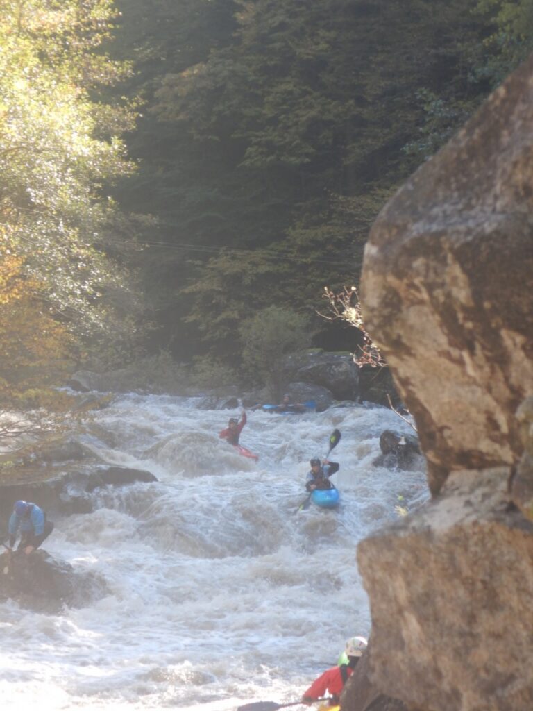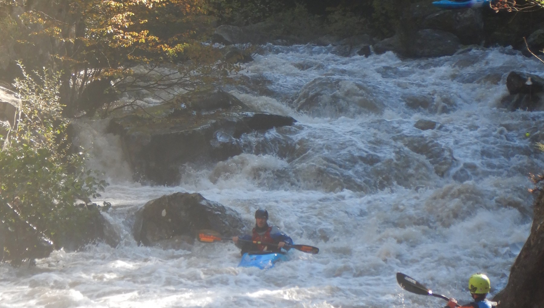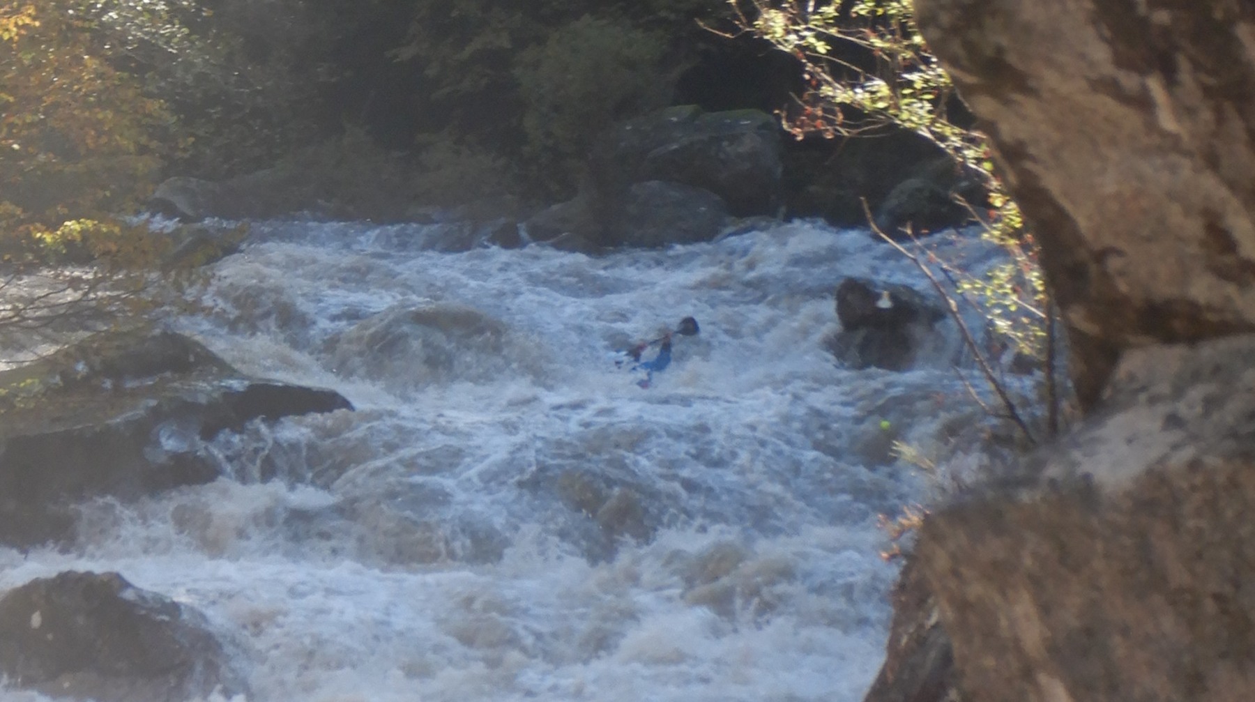 Elle a essayé de passer par-dessus un ENORME pleureur et a fini avalée par celui-ci et mise sur le toit côté gauche. Assez courageuse, elle n’est pas sortie de son kayak mais pas suffisamment gonflée tout de même pour tenter un tour complet sous son kayak (elle n’esquimaute que du côté droit). A l’envers sous son bateau, elle a attendu une main en l’air la pointe d’un de ses valeureux co-équipiers. Mais à quelques mètres du rapide, les discutions allaient bon train : rénovation de maison, zéro consommation d’énergie, éoliennes de Jojo… Elle a fini par faire sauter la jupe au bout de 3 mn le visage rubiconde.