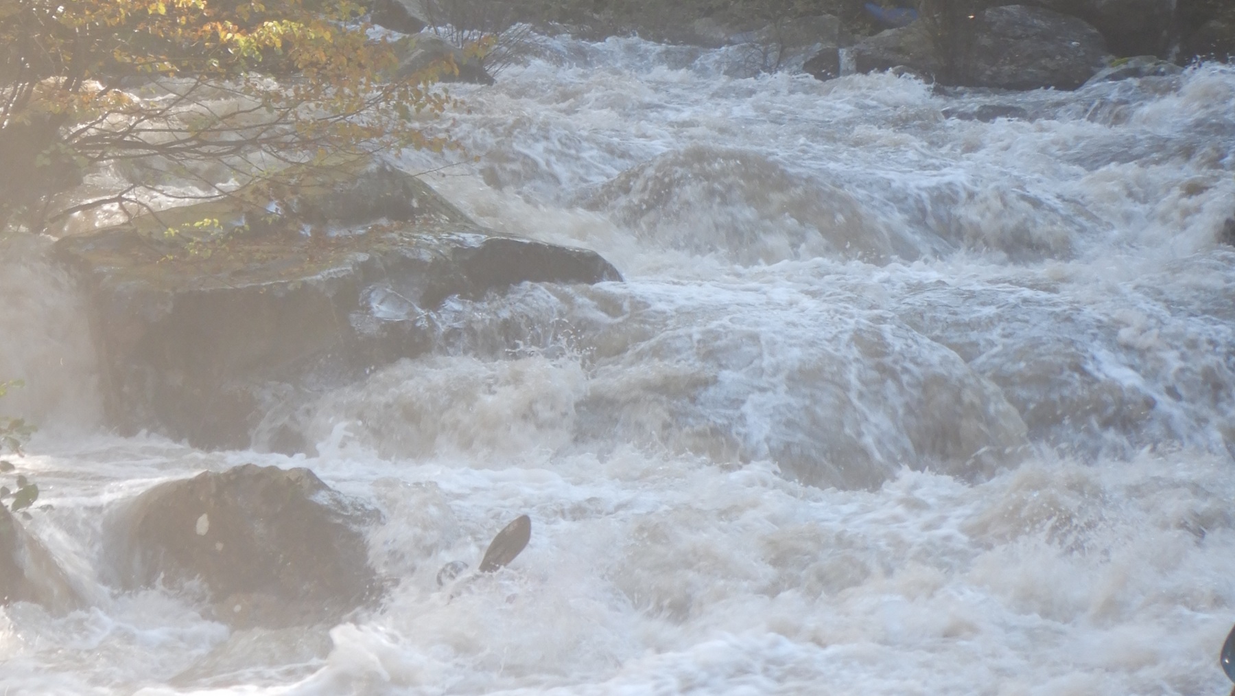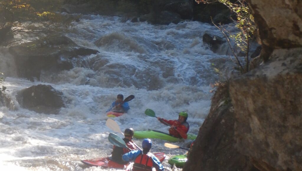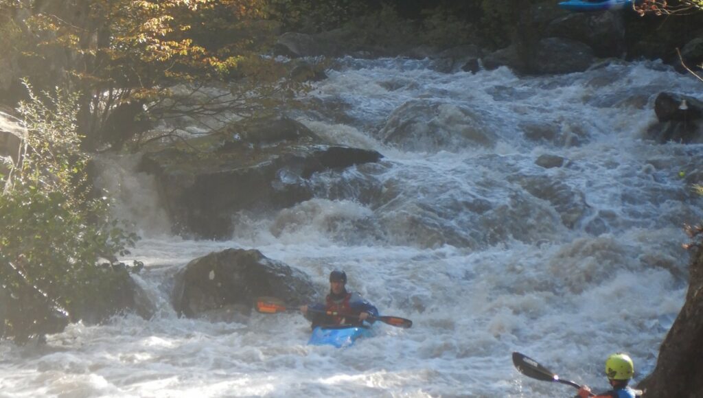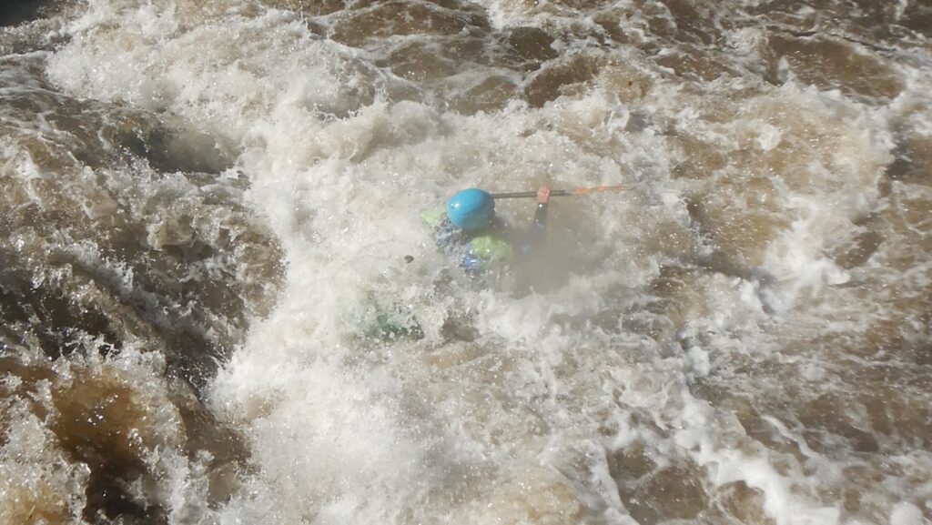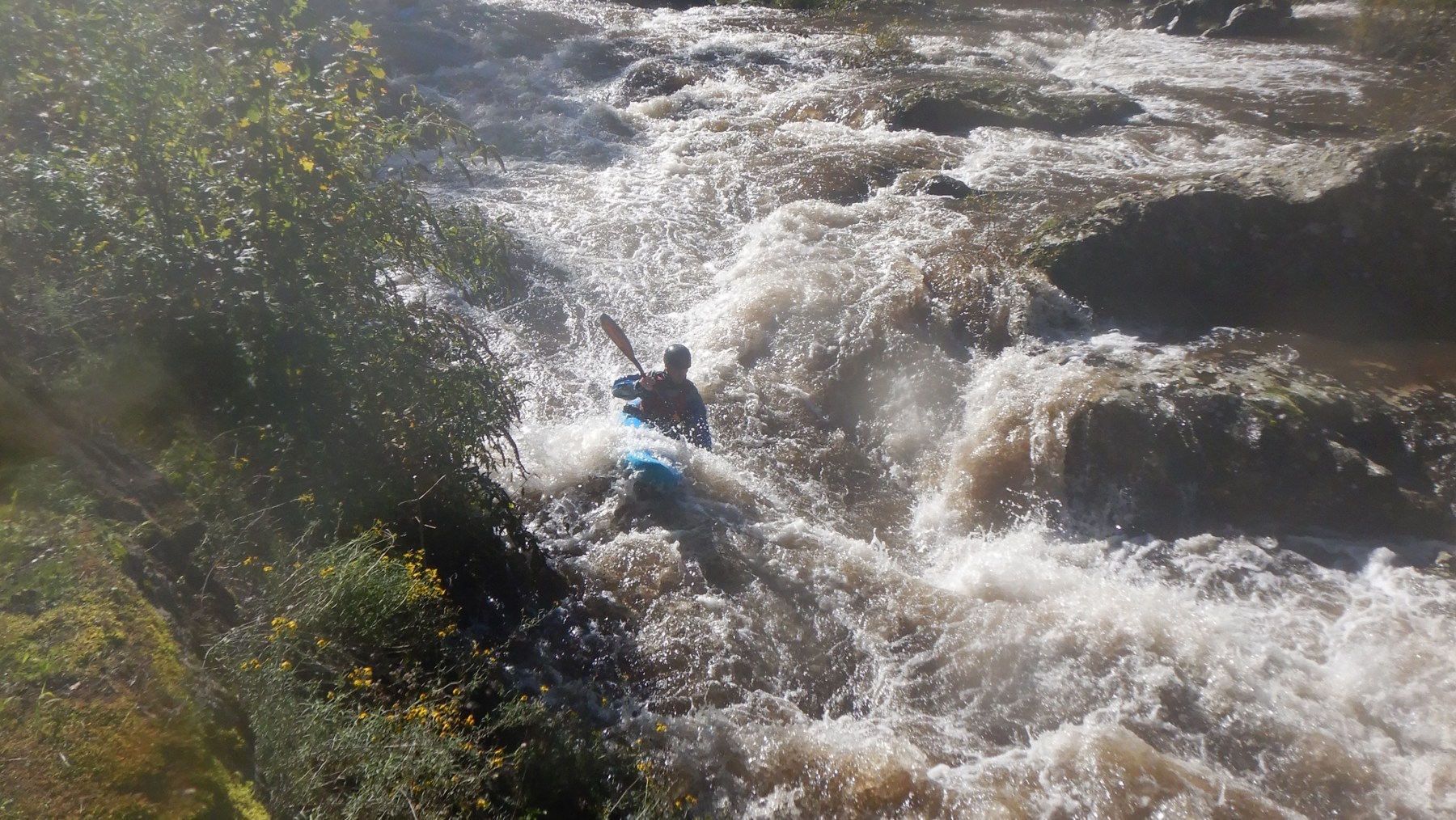 Un petit esquimau de Cricri sur un rapide sans nom. Elle tombe encore du côté gauche mais cette fois-ci elle n’attend pas ses petits potes pour l’aider … Elle s’en sort toute seule mais se fait tout de même sermonner par Jéjé pour le mauvais angle d’attaque du rouleau. Elle reste stoïque.
