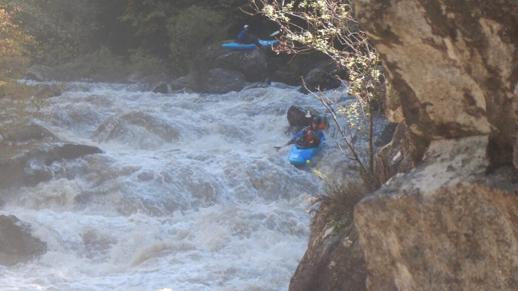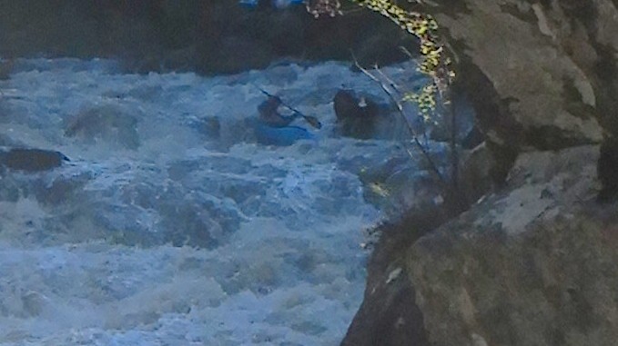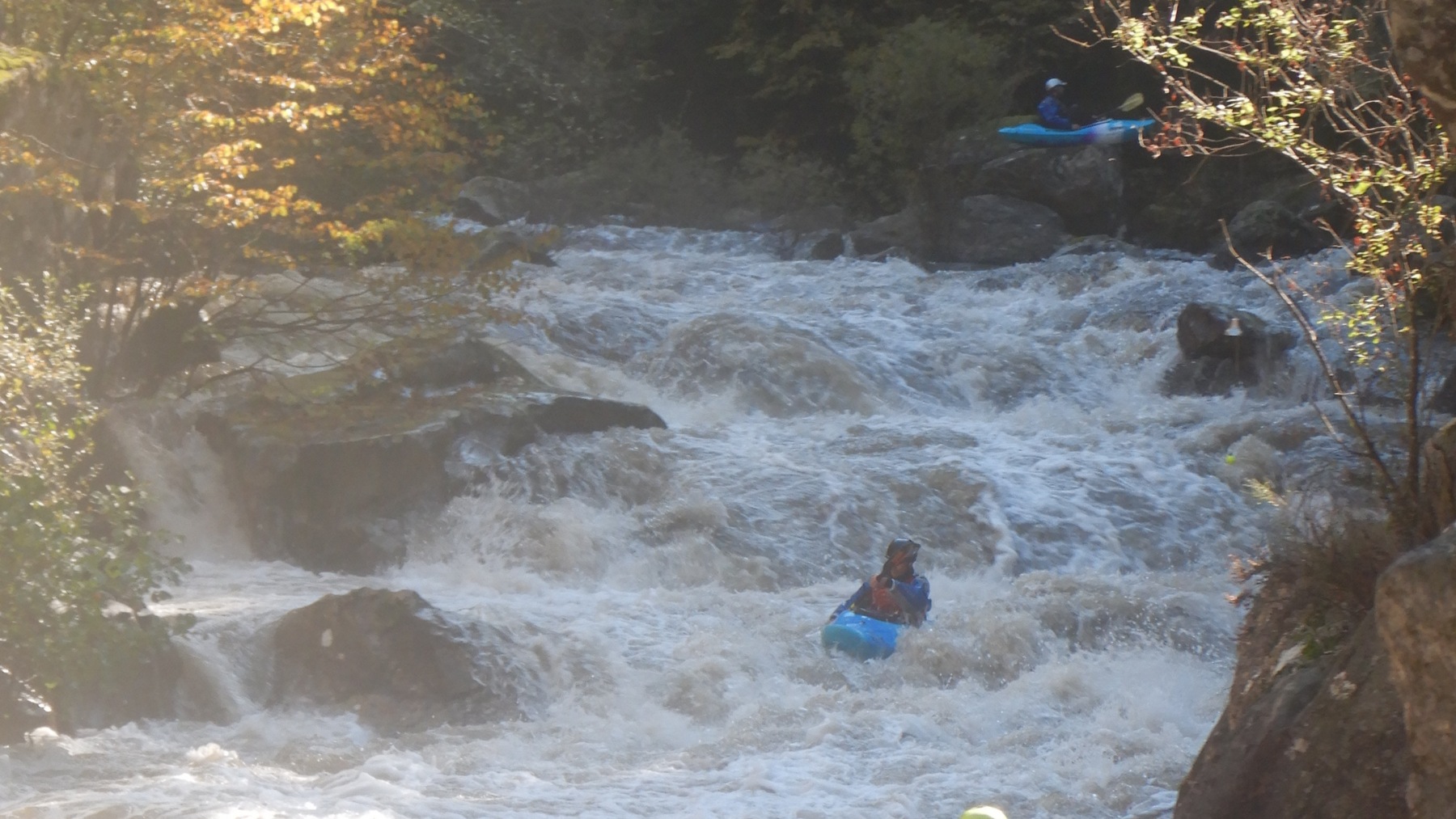 Pour augmenter les chances de réussite du passage, il faut viser la rive gauche. Jéjé, comme la veille, prend cette option. Mais 18 m3 c’est plus violent que 16 m3 et Jéjé s’en voit déstabilisé. Il percute la falaise sur la rive gauche et se retrouve à l’envers dans le 2 ème seuil. Il s’éjecte de son kayak et finit le rapide en étoile de mer. Il sort de l’eau et monte sur un rocher pour photographier ses copains qui attendent leur jugement dans le contre.