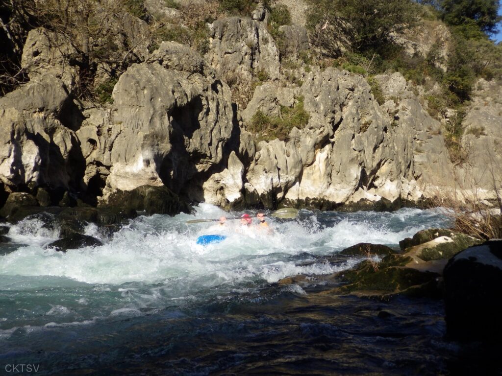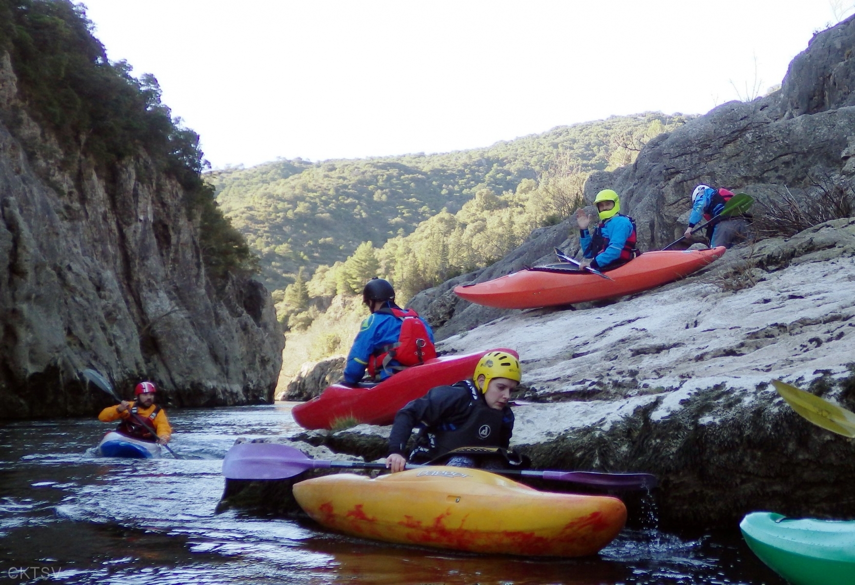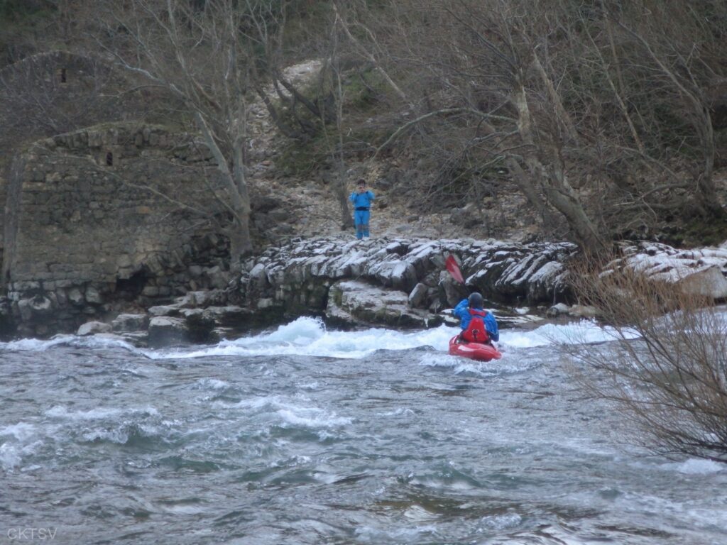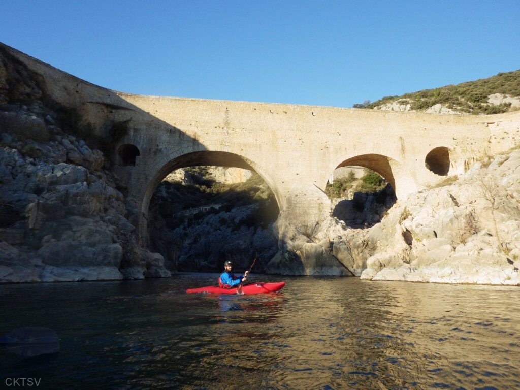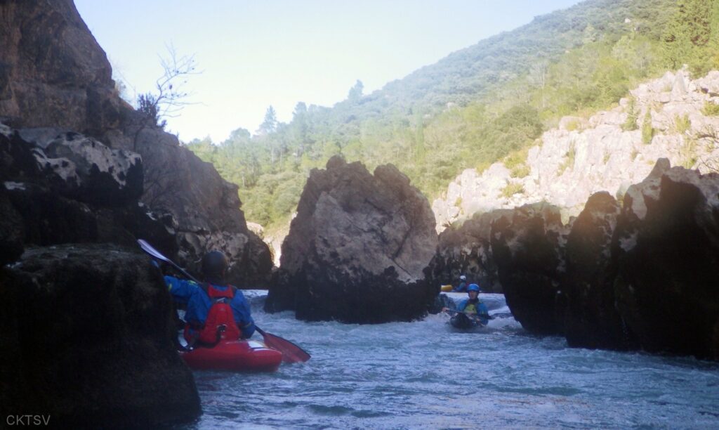 C’est l’histoire d’un kayakiste qui déprime. L’hiver qui avait si bien commencé est maintenant désespérément sec. Plus de pluies depuis 1 mois, plus de fontes depuis la dernière Semine. La dèche on vous dit. Mais l’espoir renaît soudainement en secouant désespérément la carte Rivermap : oh, une rivière en eau, là-bas, dans le sud ! Comme une bouteille à la mer, un mail est lancé et, miracle ! des kayakistes répondent ! 1 d’abord, puis 2. A 24h du départ, on est à 3 selon la Police, 4 selon les organisateurs. Le jour J, 9 personnes et 1 chien sont là pour se frotter aux gorges du Diable, énième démonstration expérimentale de la Théorie de la Pomme (se reporter à la publication « Agout 2017 » concernant cette belle découverte, prix Nobel en sciences sociales du kayakiste).
