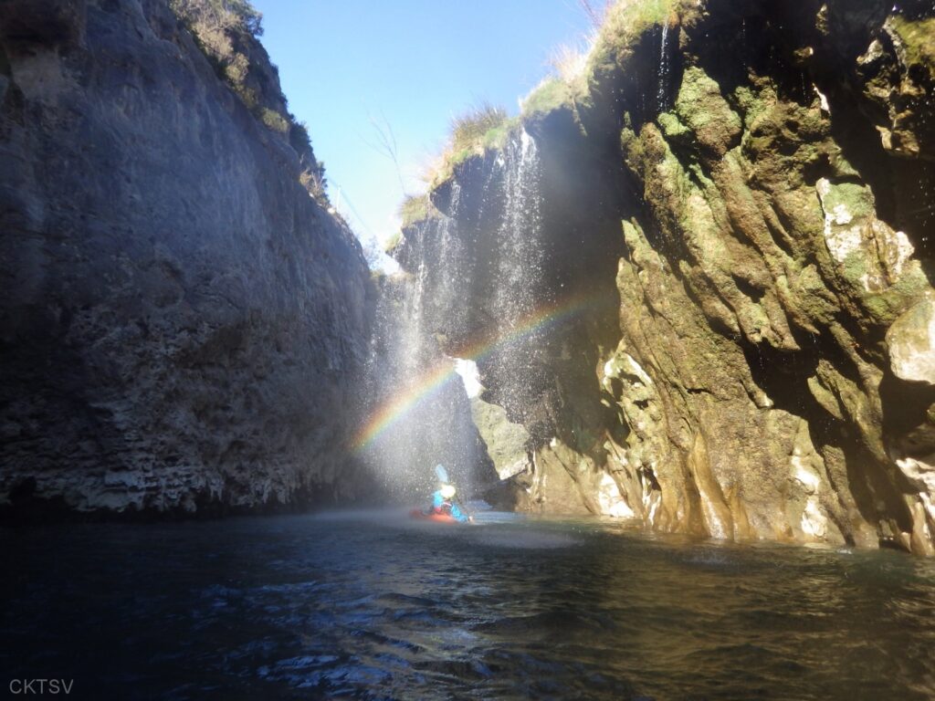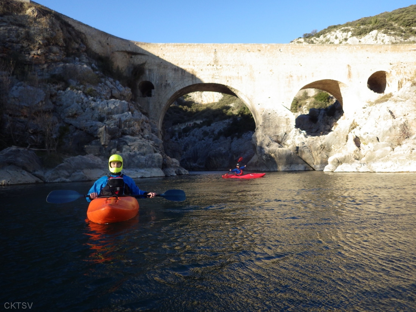 Nos aventuriers doivent braver le Soleil éclatant, les températures clémentes et les décors grandioses, mais ils sont exaltés par le récit mythologique de PY : une histoire de 2 moines, un bouc lubrique et un saint qui construisent un pont indestructible… N’hésitez pas à lui demander, il a bossé son sujet. La descente se déroule donc sans encombre, tout au plus quelques blagues presque volontaires concernant la ligne à suivre.