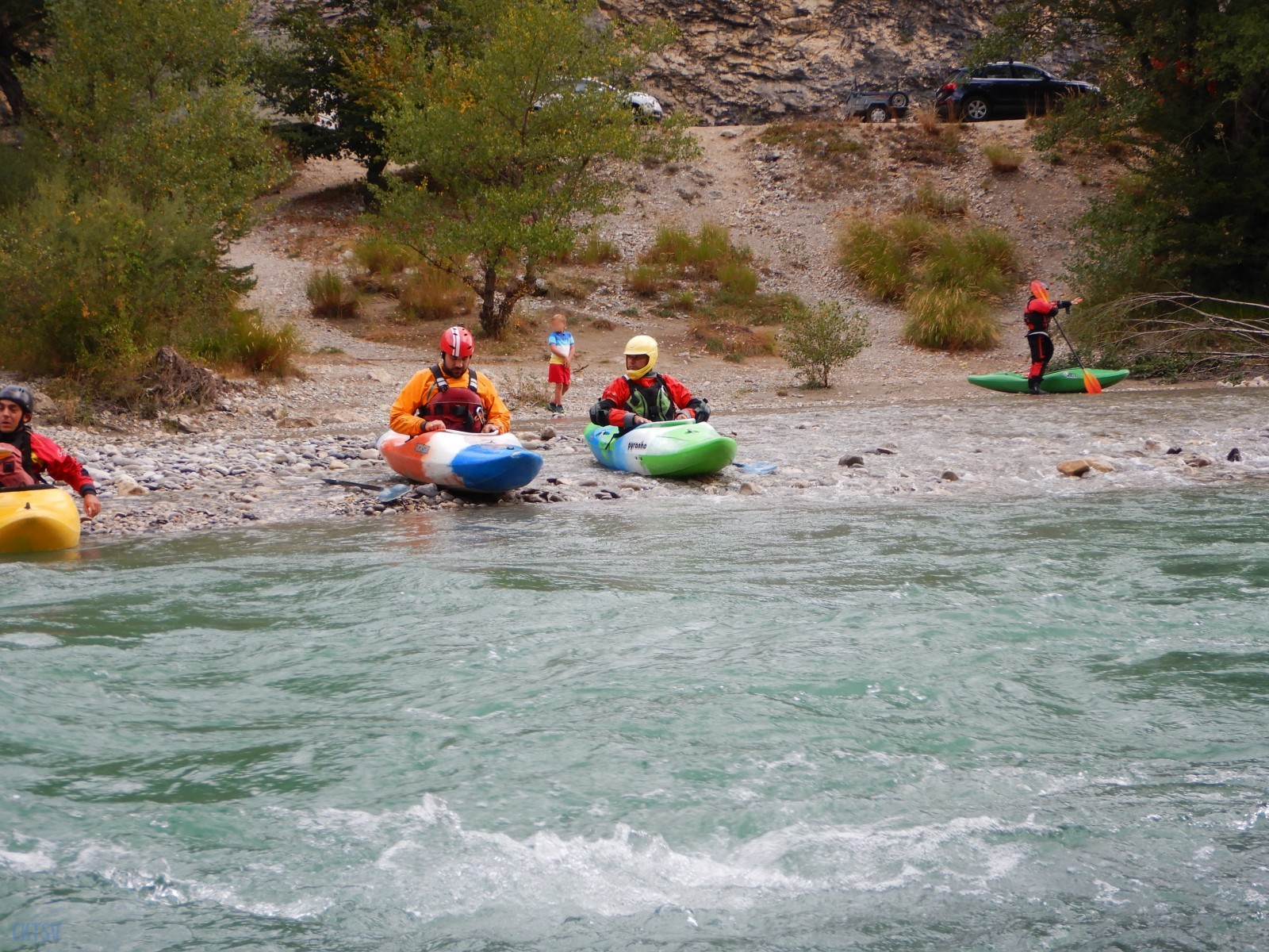 Nous étions 7 du CKTSV, Christelle seule représentante féminine du Club, Raphael, Clément, Luc, Bertrand, Jérome et moi-même, ainsi qu’une connaissance de Raphael, Etienne. Après une navette sur les hauteurs des gorges, nous nous sommes apprêtés a embarquer au pont de Carajuan, non sans nous être libéré du poids de nos angoisses…