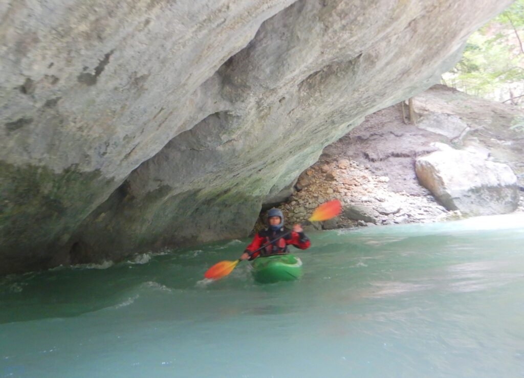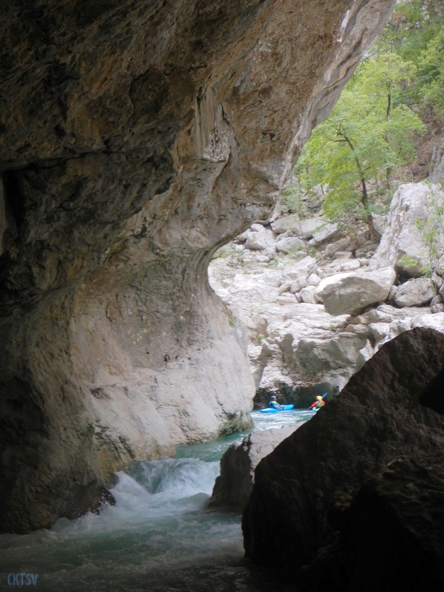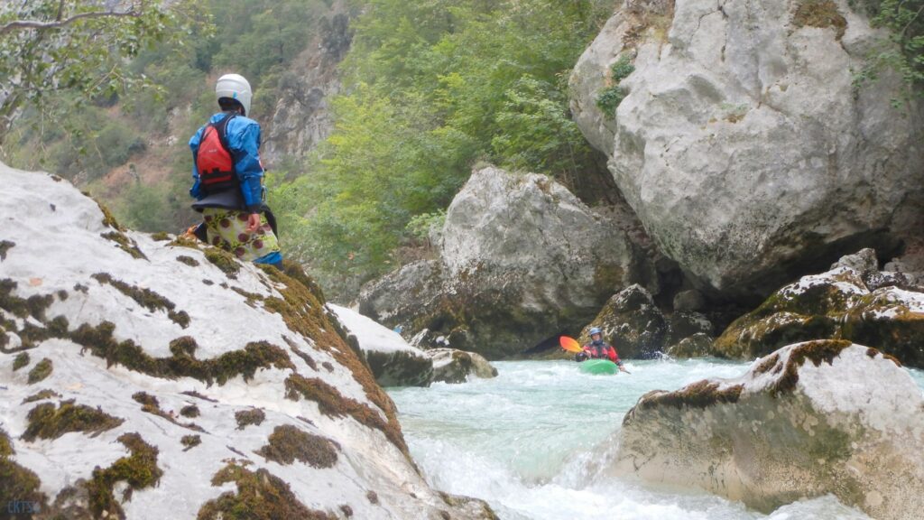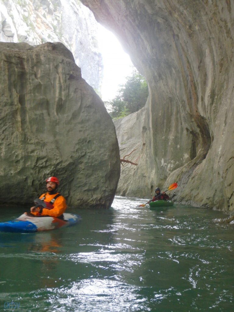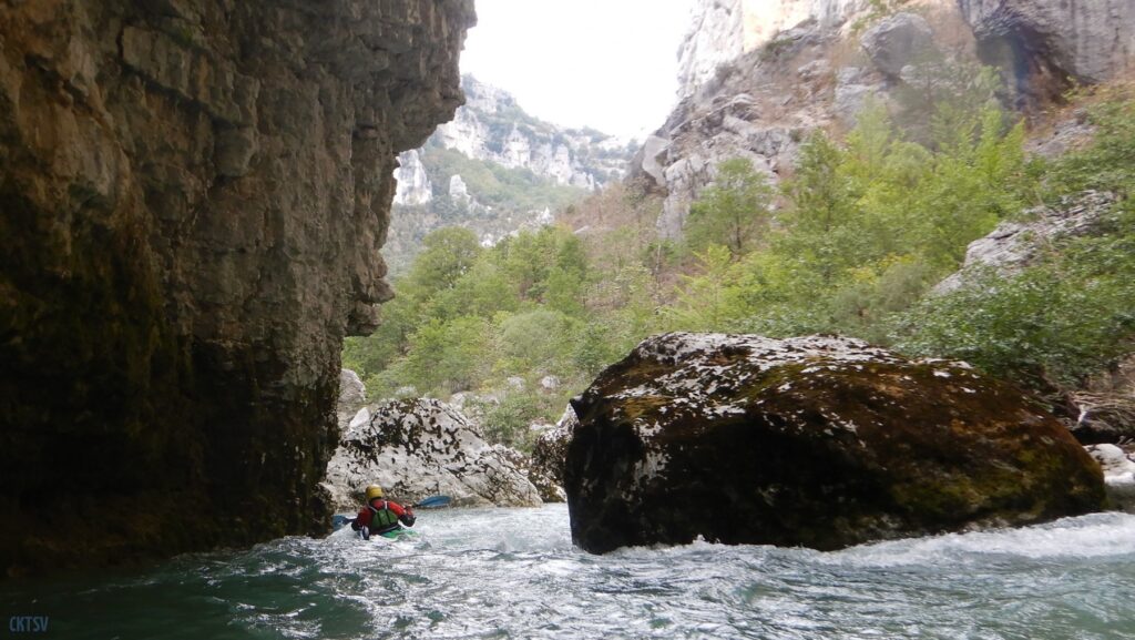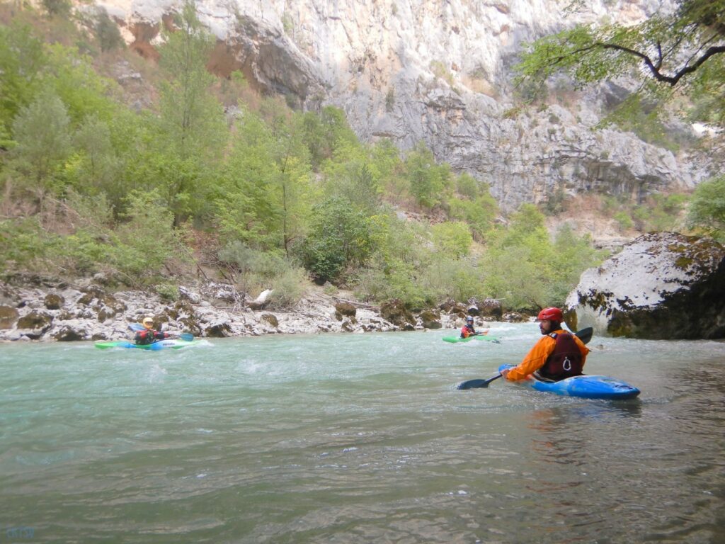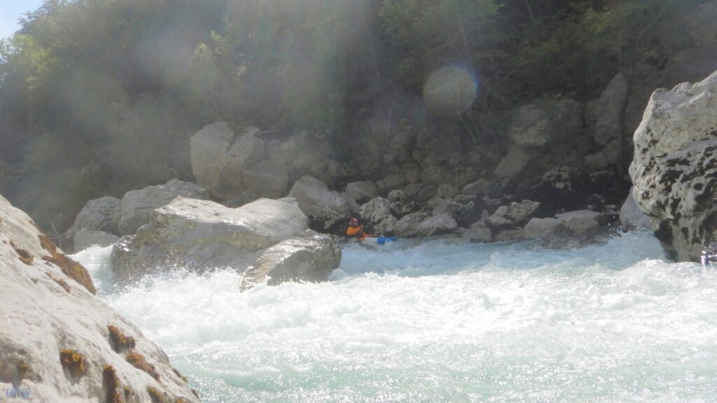 Pourtant, la navigation par ce niveau d’eau est extrêmement agréable, la rivière coule, les sections s’enchaînent, les paysages de calcaires toujours plus surplombant se succèdent et les rapides rencontrés ne sont jamais plus gros que du III, III+. Toutefois sauf a avoir atteint le niveau de zenitude extrême, que seul un grand âge et/ou une grande maitrise de l’art ont donné à Jérôme et Raphael, une petite tension s’installe, source de quelques maladresses.