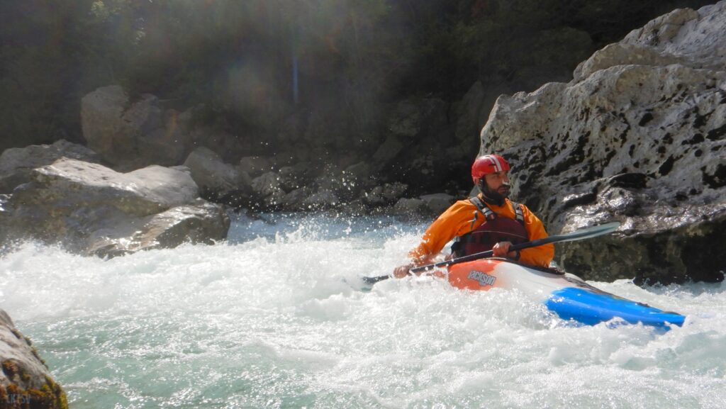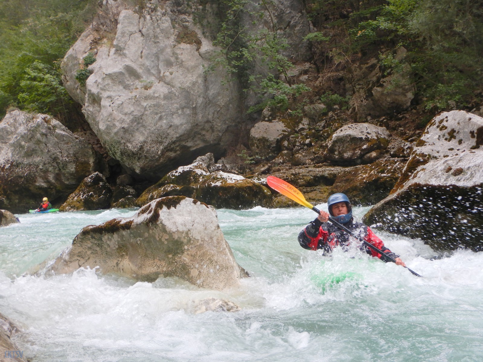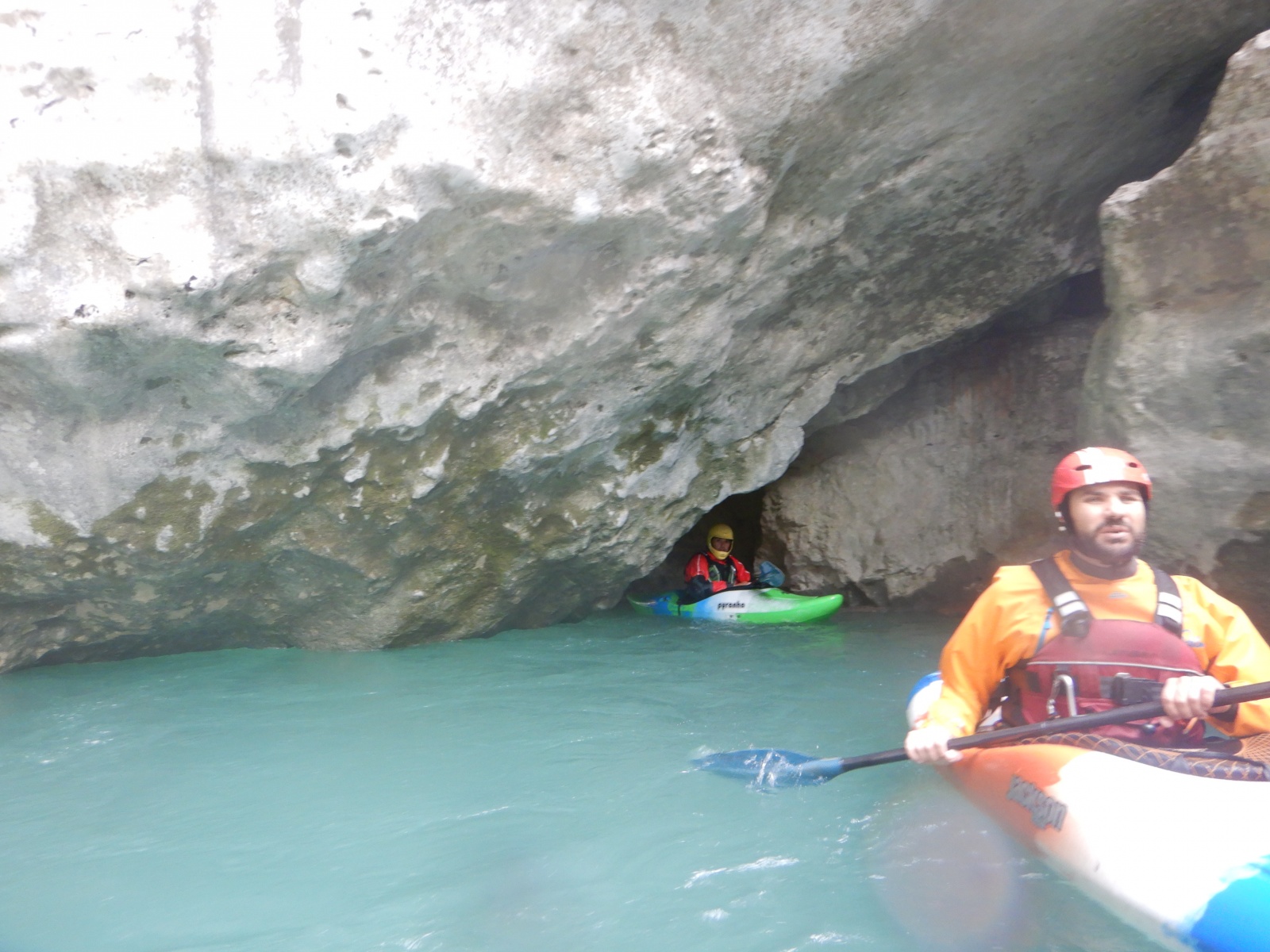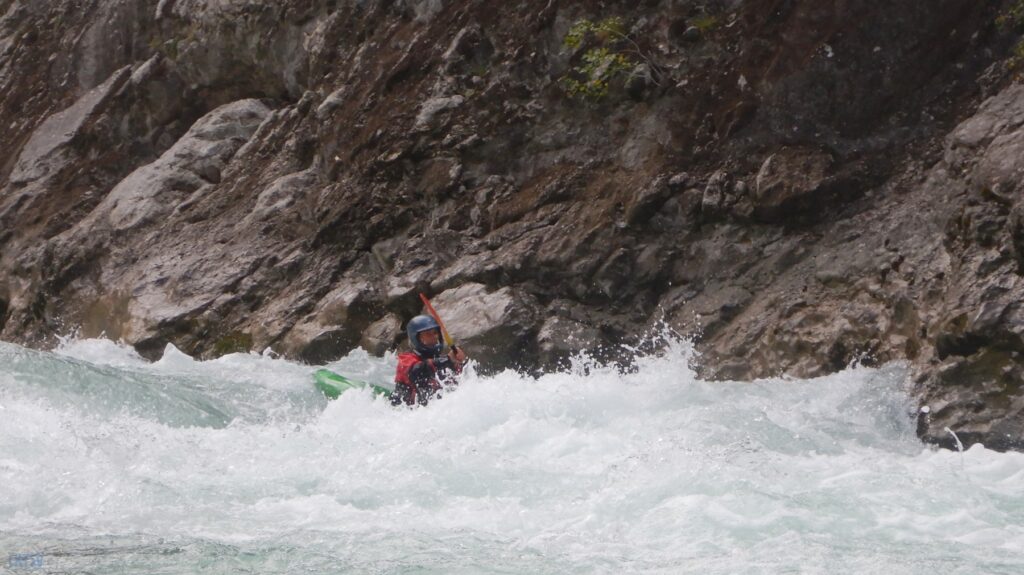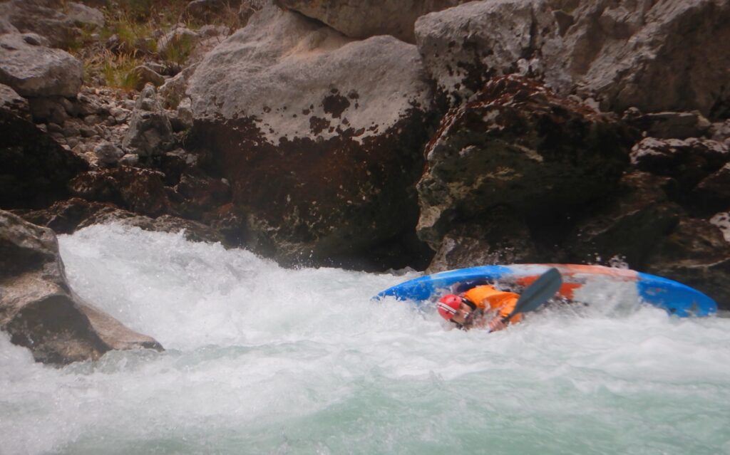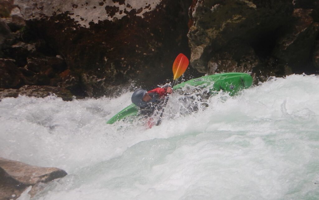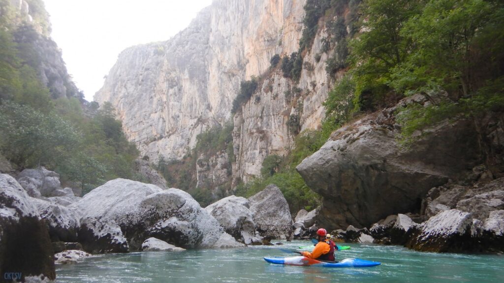Pourtant, la navigation par ce niveau d’eau est extrêmement agréable, la rivière coule, les sections s’enchaînent, les paysages de calcaires toujours plus surplombant se succèdent et les rapides rencontrés ne sont jamais plus gros que du III, III+. Toutefois sauf a avoir atteint le niveau de zenitude extrême, que seul un grand âge et/ou une grande maitrise de l’art ont donné à Jérôme et Raphael, une petite tension s’installe, source de quelques maladresses.