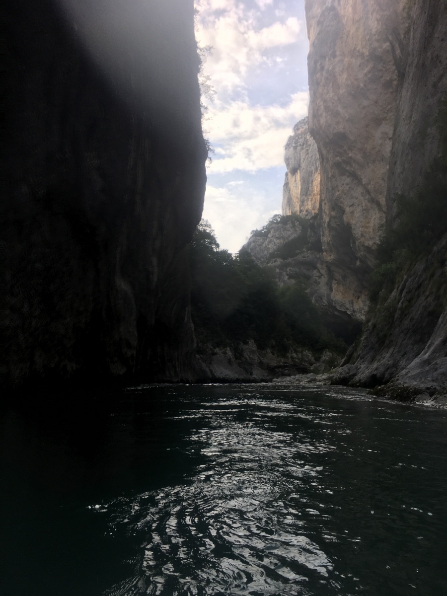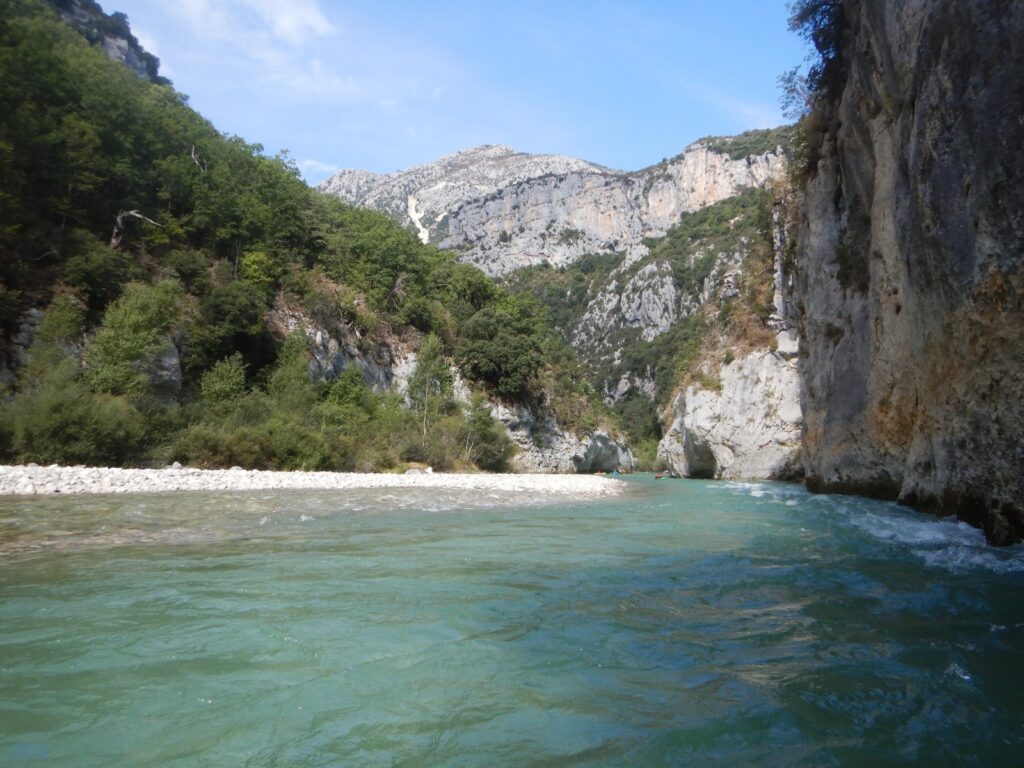 Une fois la lumière du jour retrouvée, nous avions presque fini notre descente des gorges. Les petits rapides s’enchaînaient sans difficultés, jusqu’à la « chatière » du rideau, l’assommoir qui en a assomme au moins 2, puis le long planiol jusqu’à l’entrée du lac et la plage ou nous débarquèrent, 7h après nous être engagés dans cette descente de 25km de long. Certains se sont fait sécher au soleil et au vent provençaux, tandis que 3 courageux allaient chercher les véhicules.