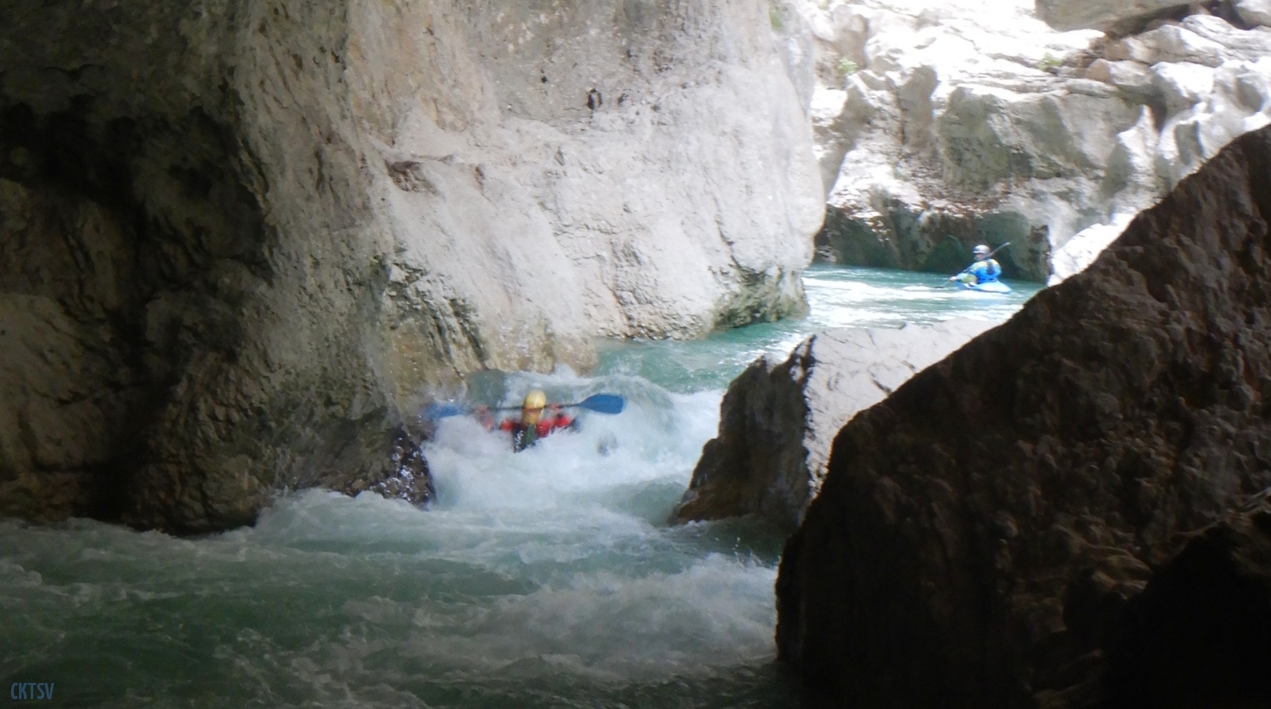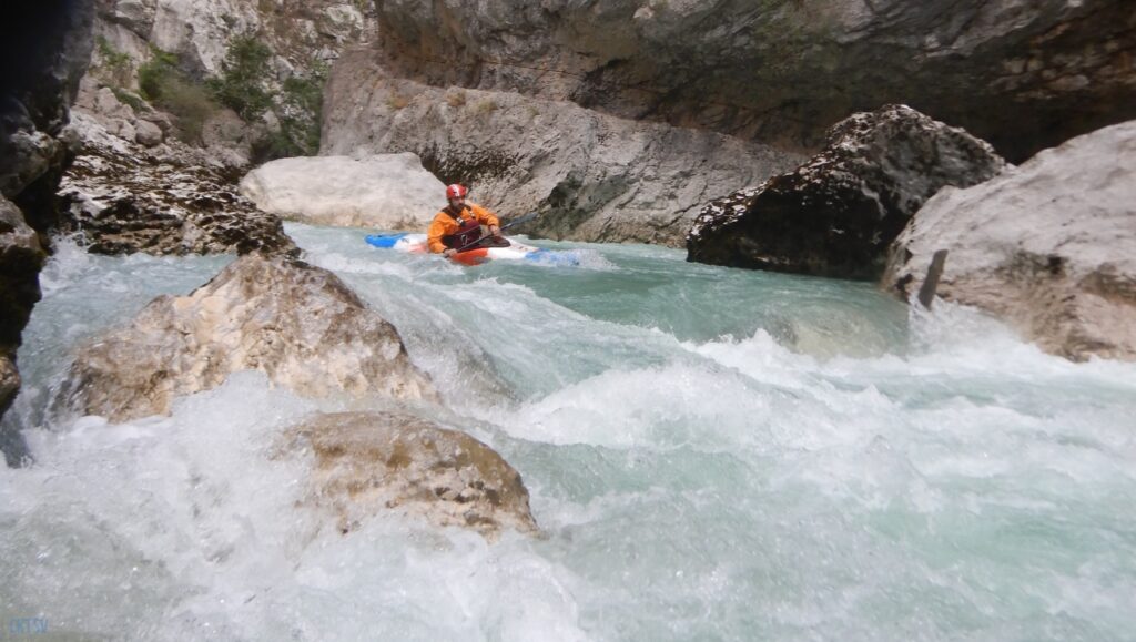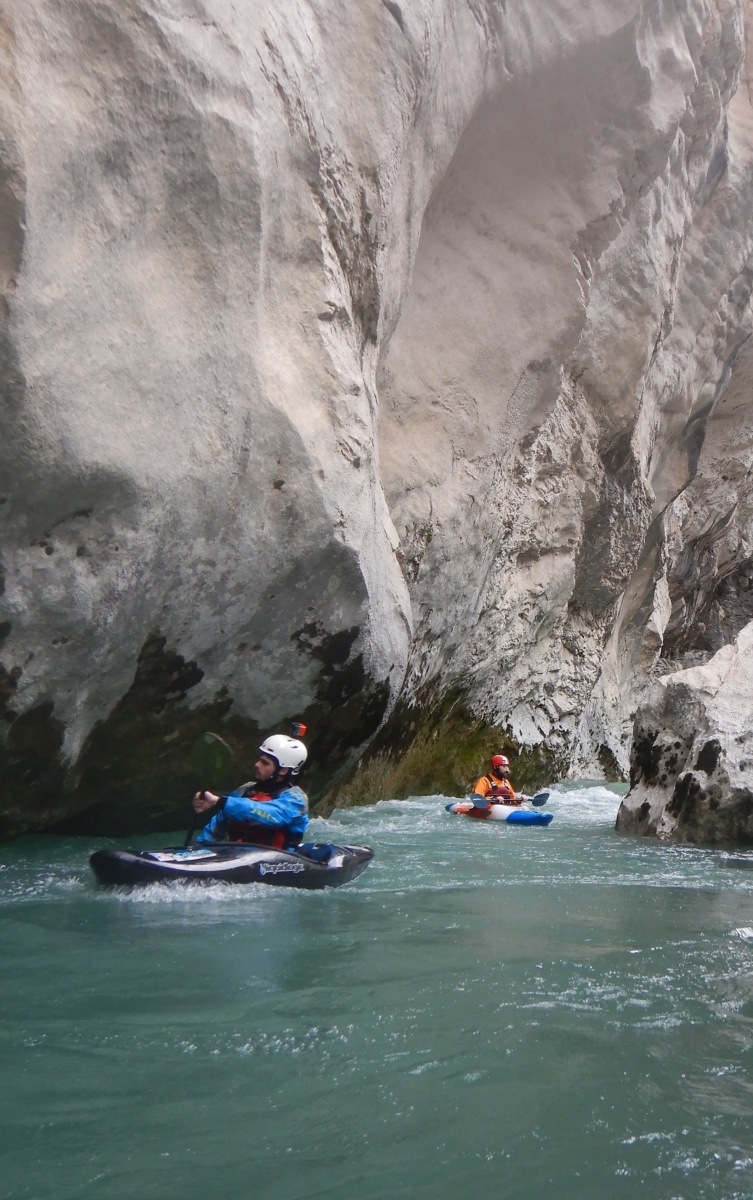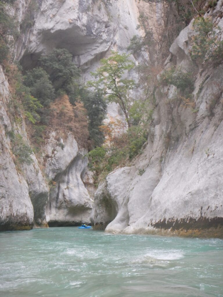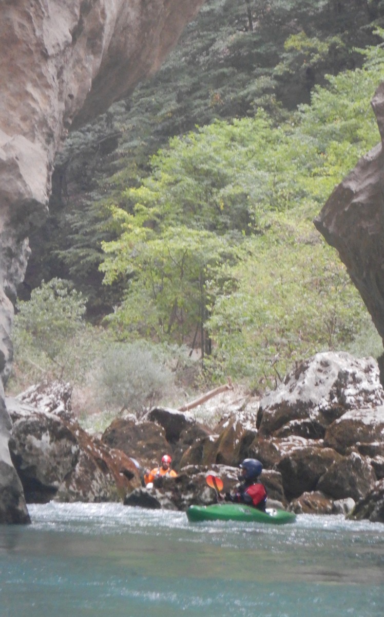 Pour autant pas de « sketch » à déplorer, le solitaire, le couloir Samson et ses labyrinthes, drossages et seuils passent sans histoires à l’exception d’un eskimo ici ou là. L’estelier et la passerelle mythique du sentier Martel seront les témoins du premier bain de la journée. J’ai rarement mis autant d’énergie à regagner la berge dans un rapide. La présence d’un siphon en bout de ligne, est il est vraie une bonne source motivation. A ce stade Imbut à zéro pour le Verdon.