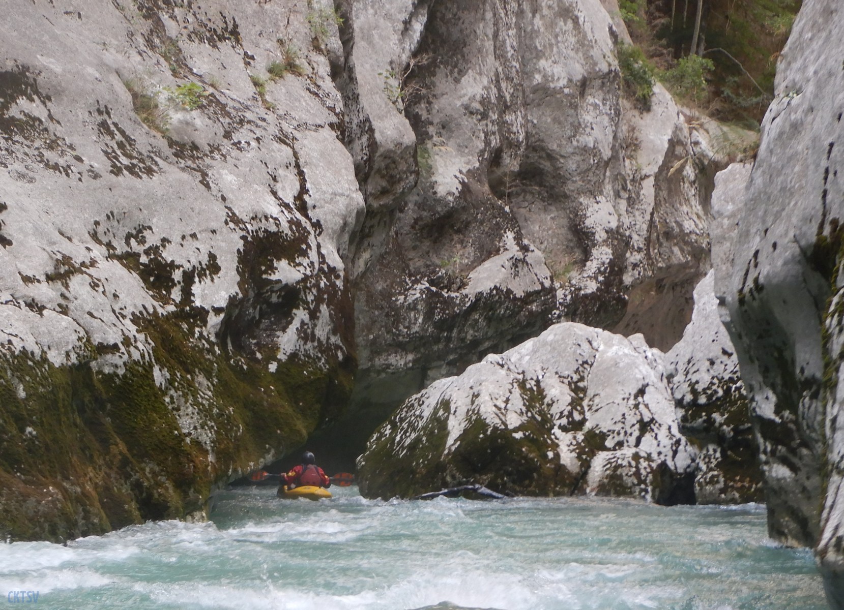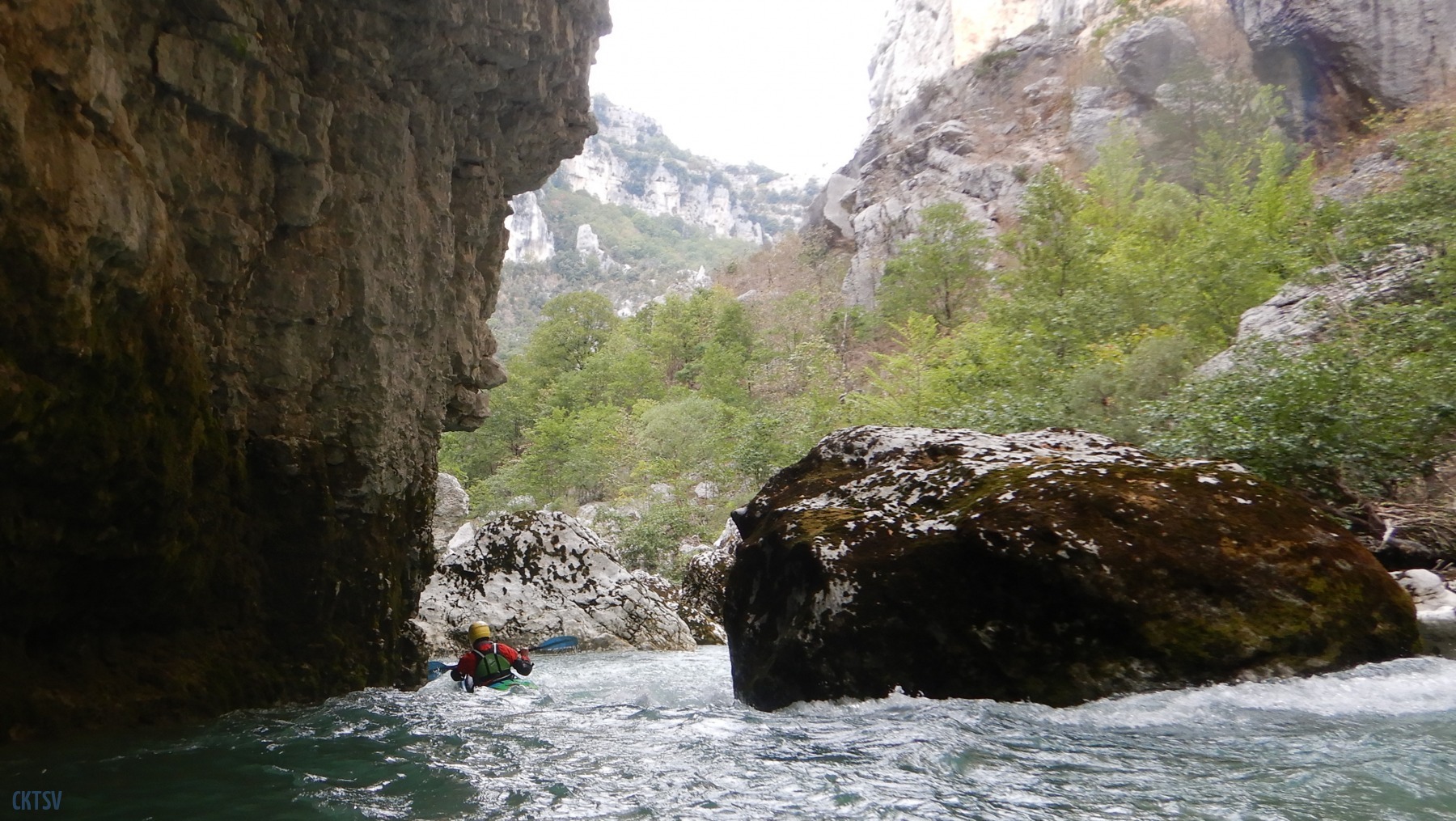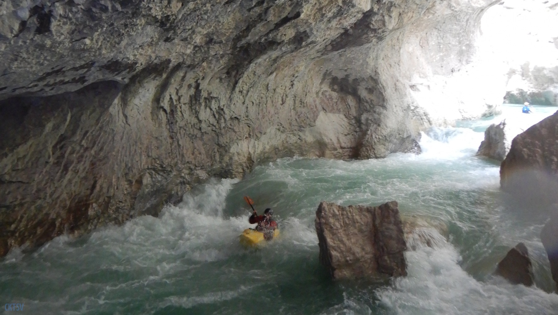 Pour autant pas de « sketch » à déplorer, le solitaire, le couloir Samson et ses labyrinthes, drossages et seuils passent sans histoires à l’exception d’un eskimo ici ou là. L’estelier et la passerelle mythique du sentier Martel seront les témoins du premier bain de la journée. J’ai rarement mis autant d’énergie à regagner la berge dans un rapide. La présence d’un siphon en bout de ligne, est il est vraie une bonne source motivation. A ce stade Imbut à zéro pour le Verdon.