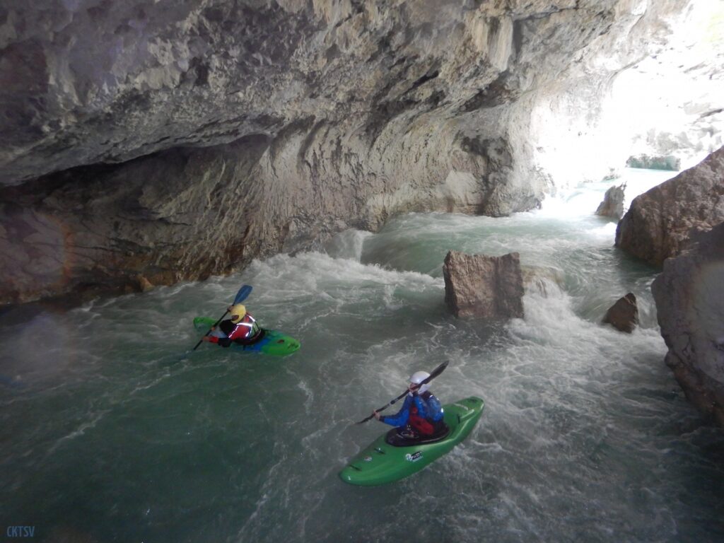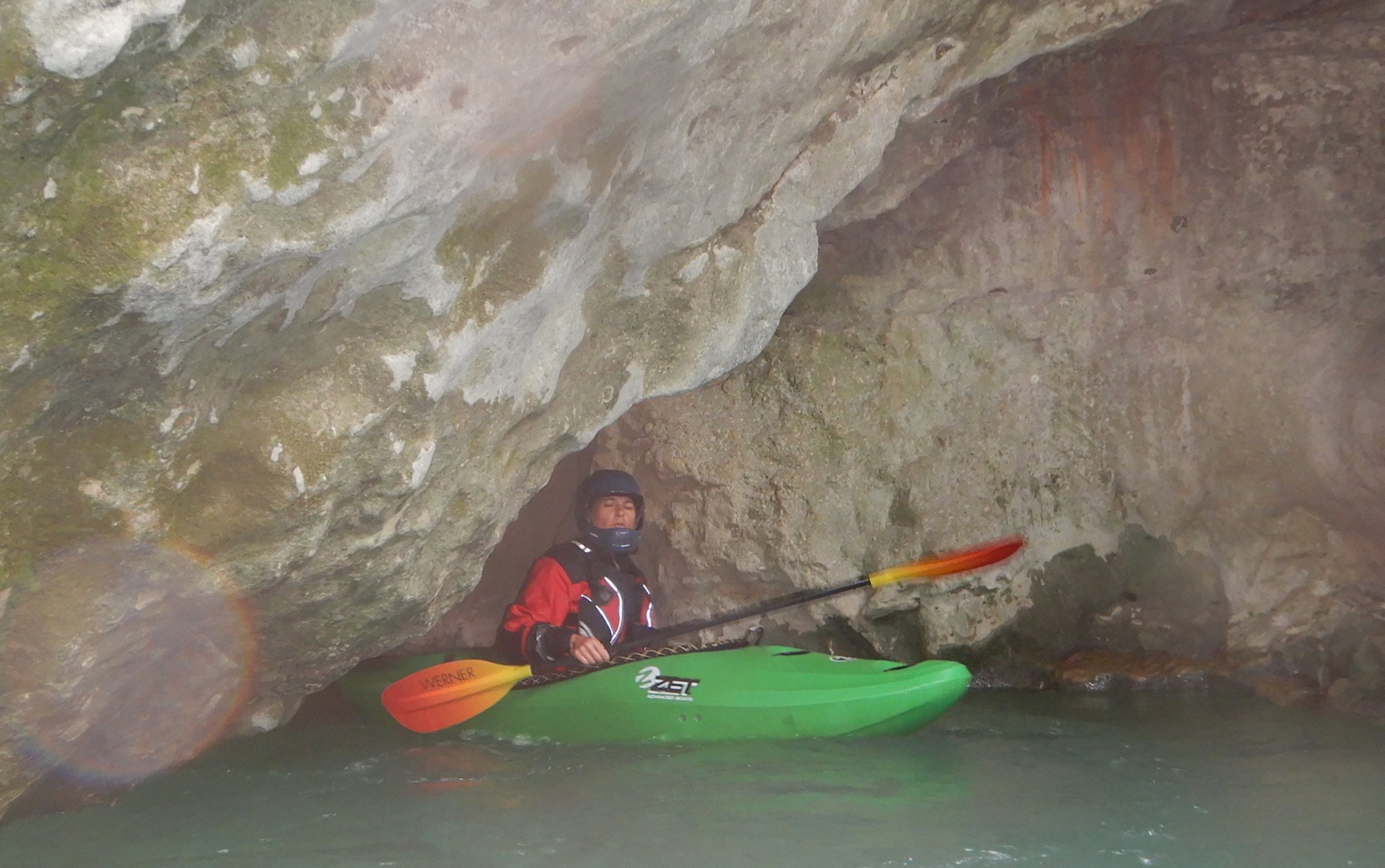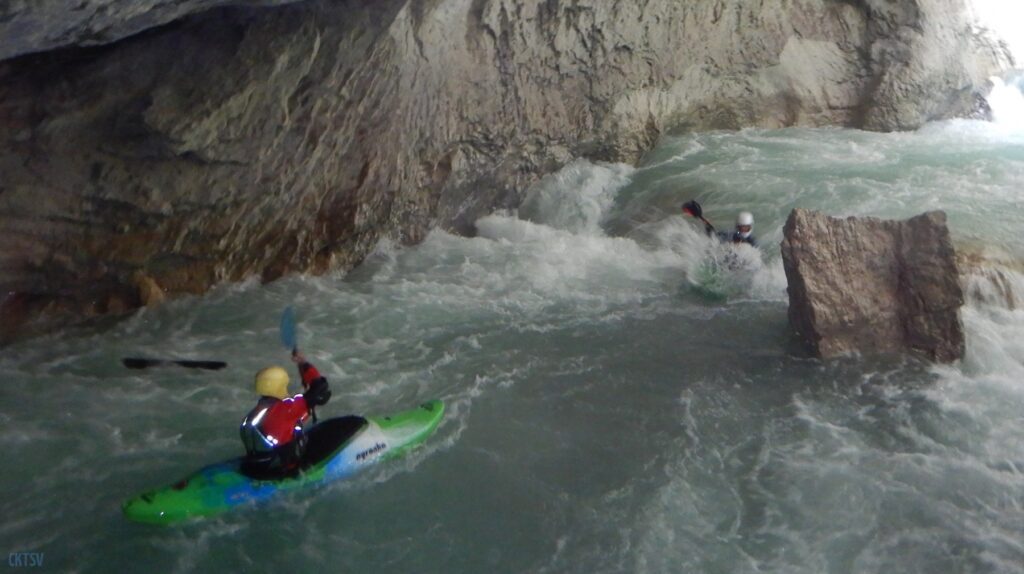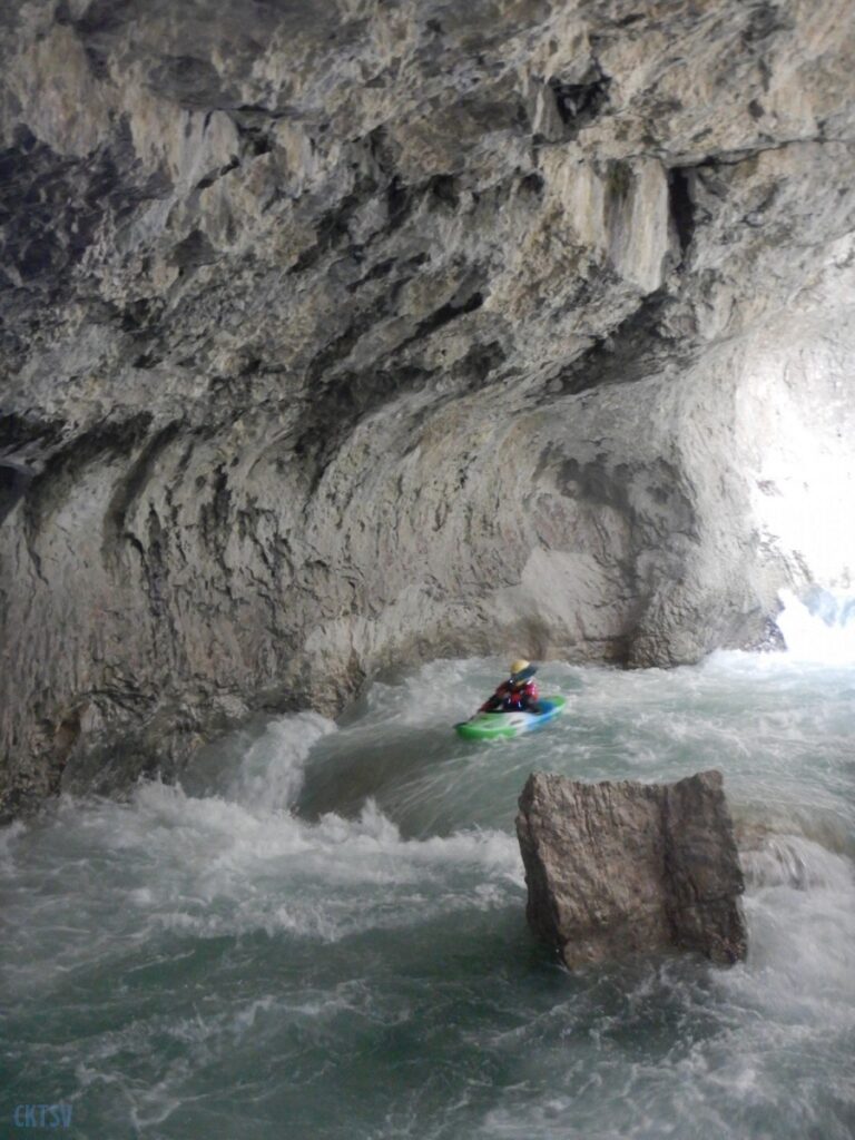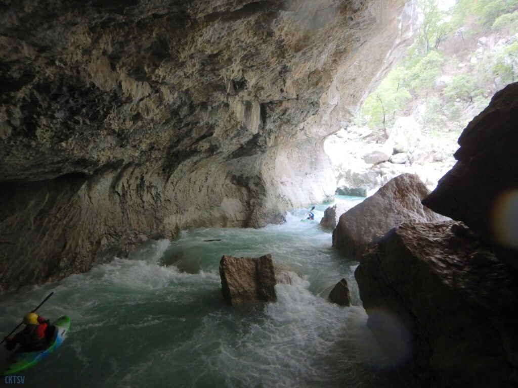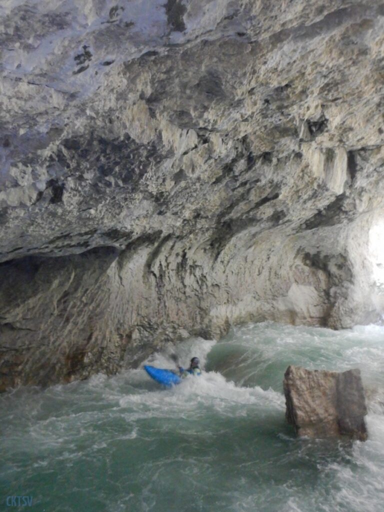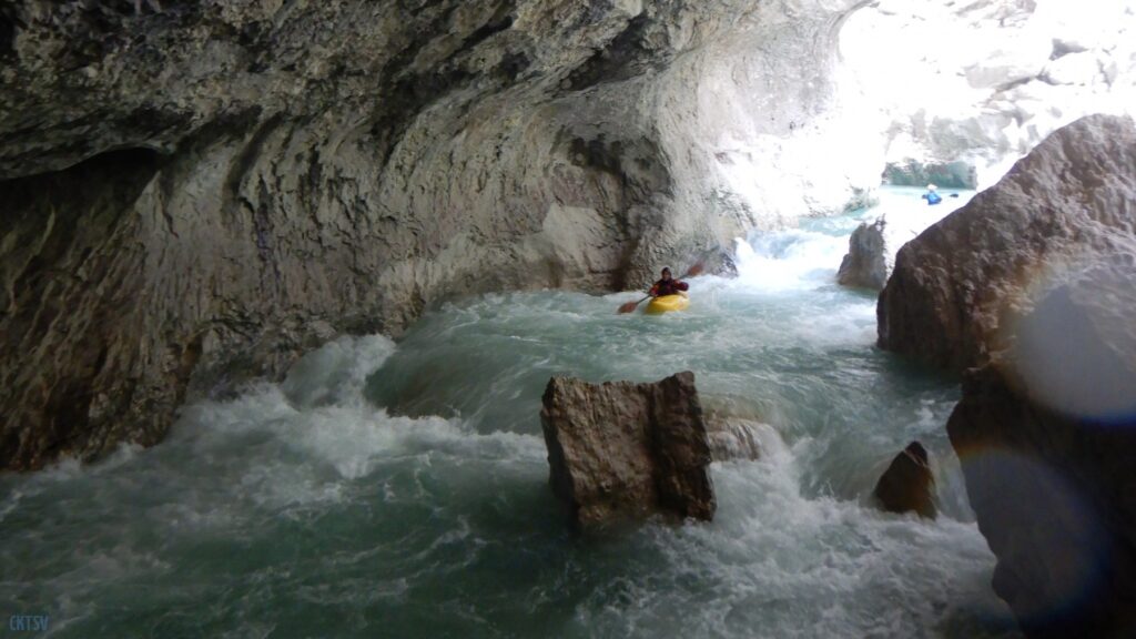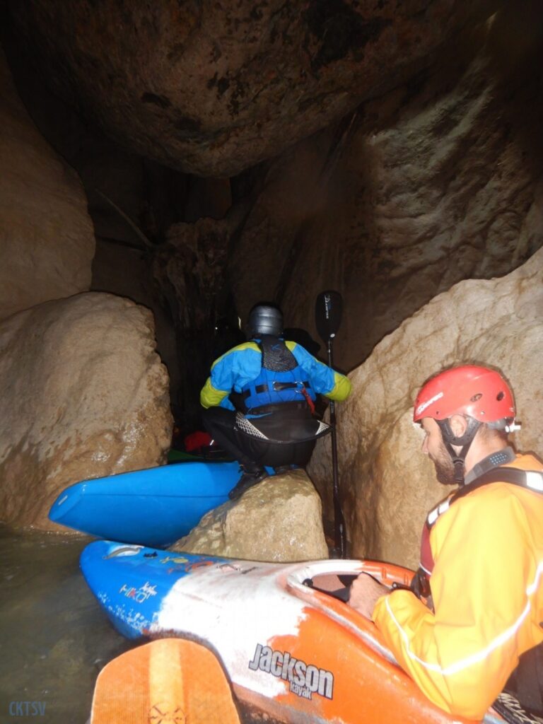 Nous arrivons au Styx, vous savez le fameux fleuve de la mythologie grecque qui sépare le royaume des vivants et des morts, etc. etc. Evidement, vu comme ca, le moral en prend en coup, mais vu de près … encore plus. Car la rivière entre dans une grotte, la lumière disparait et 2 petits seuils se succèdent avant de déboucher sur 1 drossage siphonnant sous la parois de la grotte. Le 1er seuil est un peu « merdique » un pleureur le refermant en portefeuille. S’y mettre une boite, s’est s’assurer un bon coup de stress. Certain portent facilement la difficulté, certains passent sans soucis, enfin l’un d’entre nous est saisi d’un comportement surprenant puisque : il se boite sur sa reprise, prends ses jambes à son cou, et laisse son kayak visiter le siphon (ce qu’il ne fera d’ailleurs pas). Bref, plus de peur que de mal.