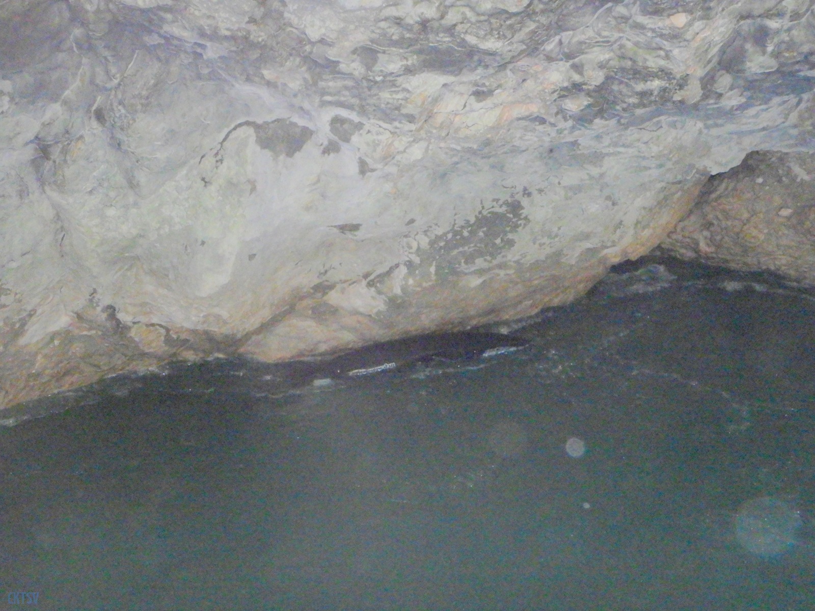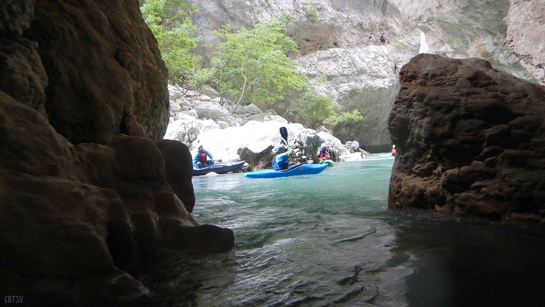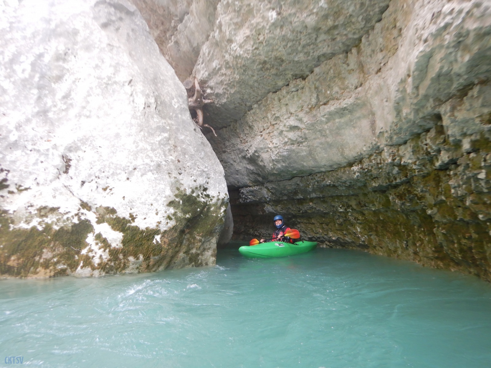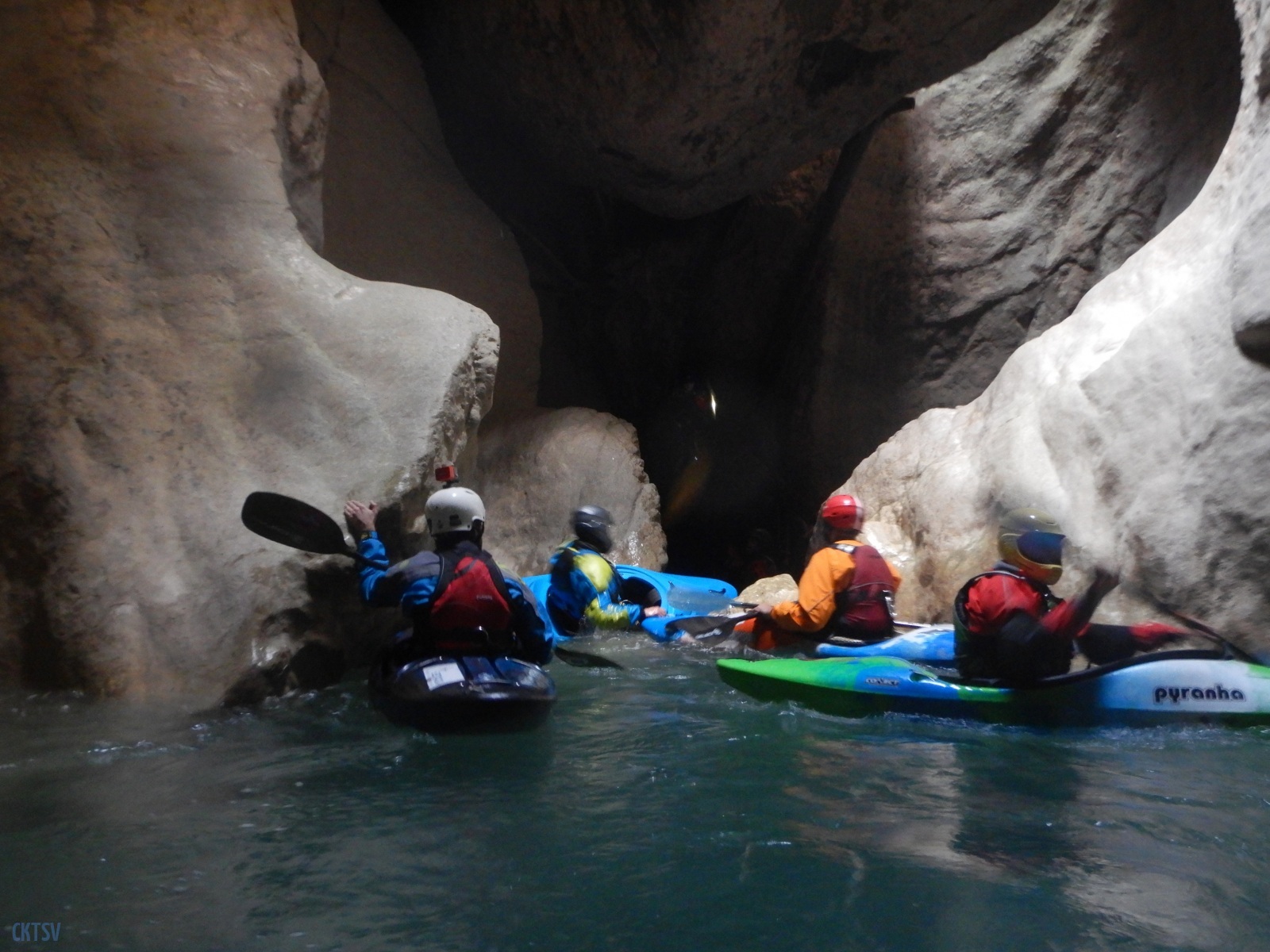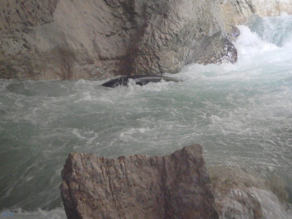 Nous arrivons au Styx, vous savez le fameux fleuve de la mythologie grecque qui sépare le royaume des vivants et des morts, etc. etc. Evidement, vu comme ca, le moral en prend en coup, mais vu de près … encore plus. Car la rivière entre dans une grotte, la lumière disparait et 2 petits seuils se succèdent avant de déboucher sur 1 drossage siphonnant sous la parois de la grotte. Le 1er seuil est un peu « merdique » un pleureur le refermant en portefeuille. S’y mettre une boite, s’est s’assurer un bon coup de stress. Certain portent facilement la difficulté, certains passent sans soucis, enfin l’un d’entre nous est saisi d’un comportement surprenant puisque : il se boite sur sa reprise, prends ses jambes à son cou, et laisse son kayak visiter le siphon (ce qu’il ne fera d’ailleurs pas). Bref, plus de peur que de mal.