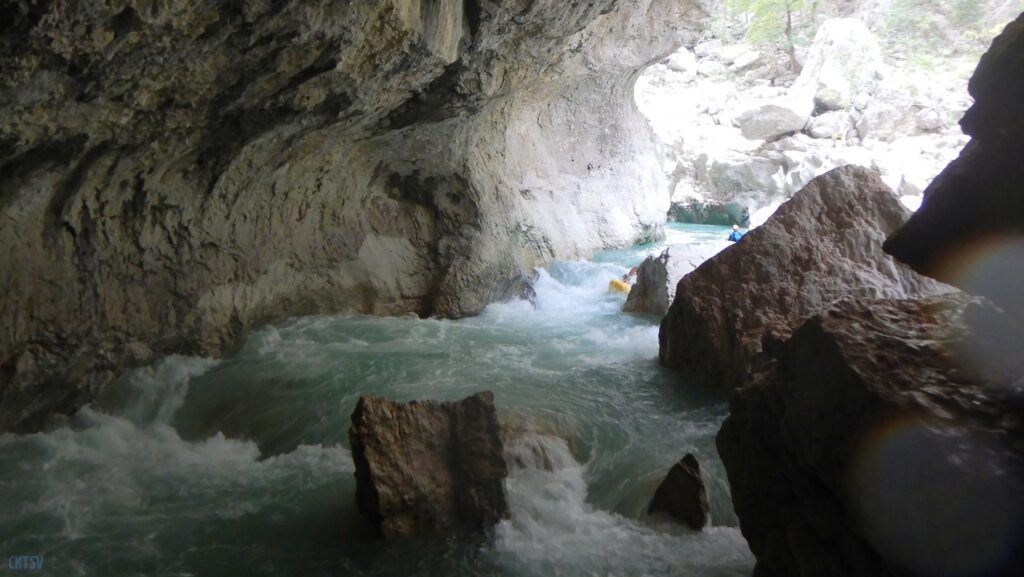 Passé le Styx, nous arrivons à l’Imbut. C’est l’acmée de la descente du Verdon. Toute la rivière s’engouffre dans une brèche de moins de 2m de large, longue d’une centaine de mettre, débouchant sur un éboulis de roche, qu’il faut escalader sur 3m de haut tout en tirant les bateaux à la corde avant un réembarquement à l’américaine un peu rock’n roll. L’approche de l’Imbut est elle-même un peu impressionnante, car elle se présente en une chicane rétrécie, ou le flot s’accélère et vient se fracasser sur un rocher siphonan dont personne n’a jamais vu la sortie….