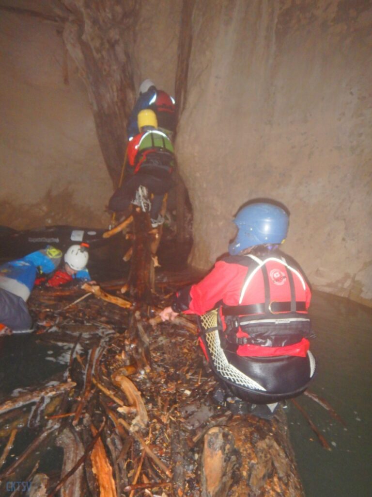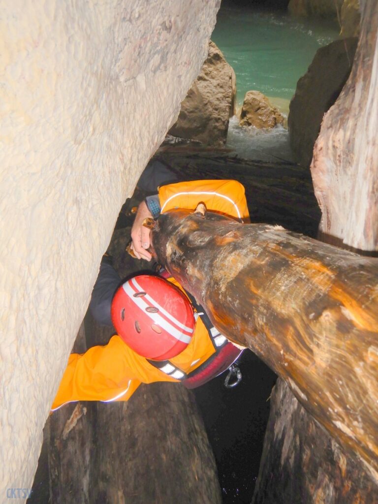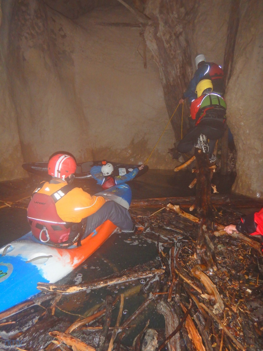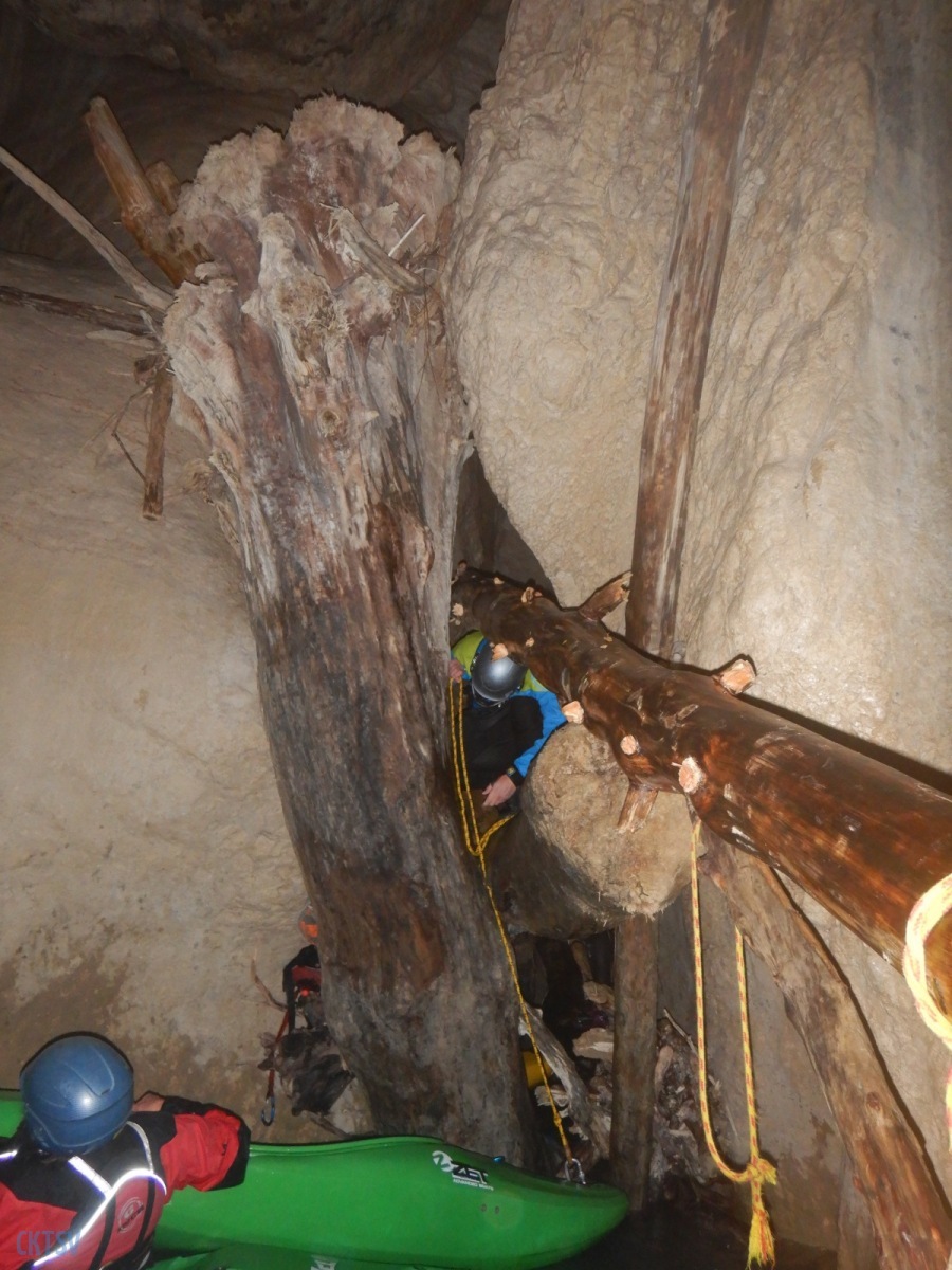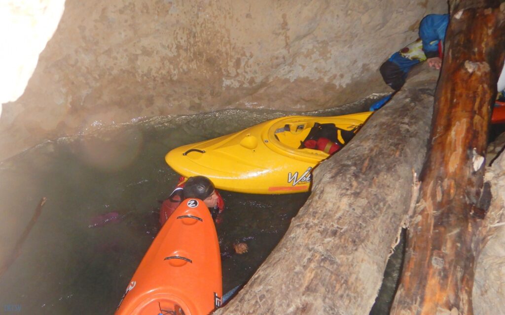 Une fois la petite troupe réunie dans le « plagnol » de l’Imbut, nous constatons la présence de notre groupe d’Italien, empêtré dans un tas de branches et de troncs d’arbres au milieu de l’Imbut. L’ouvreur se serait récrié auprès de Raphael : « Imbut ca passe pas !!!! ». Et en effet, ce fut un long imbroglio de cordes, de kayaks, de kayakistes, de troncs lisses et glissants, pour sortir tant bien que mal de cet embâcle inattendu.