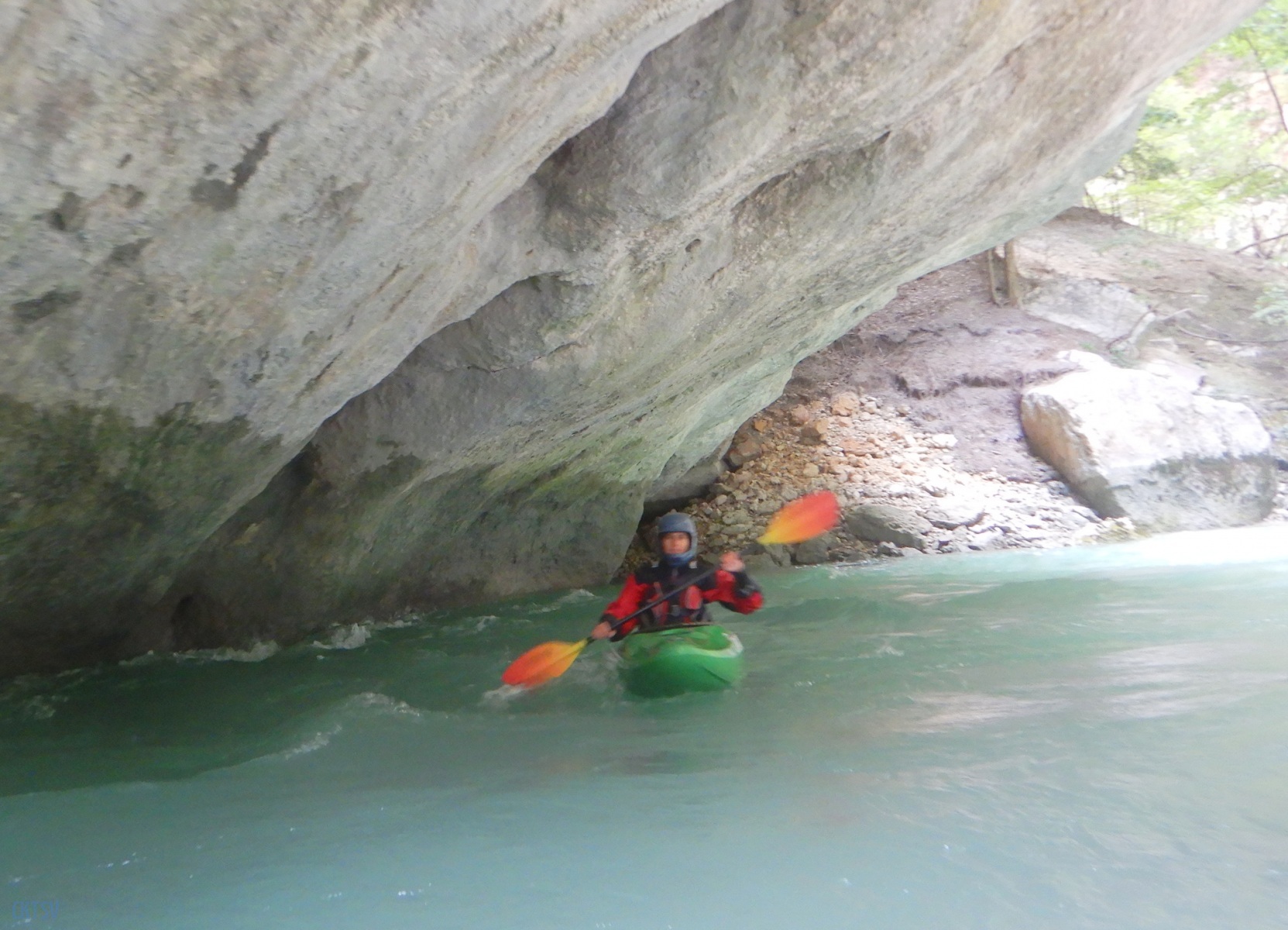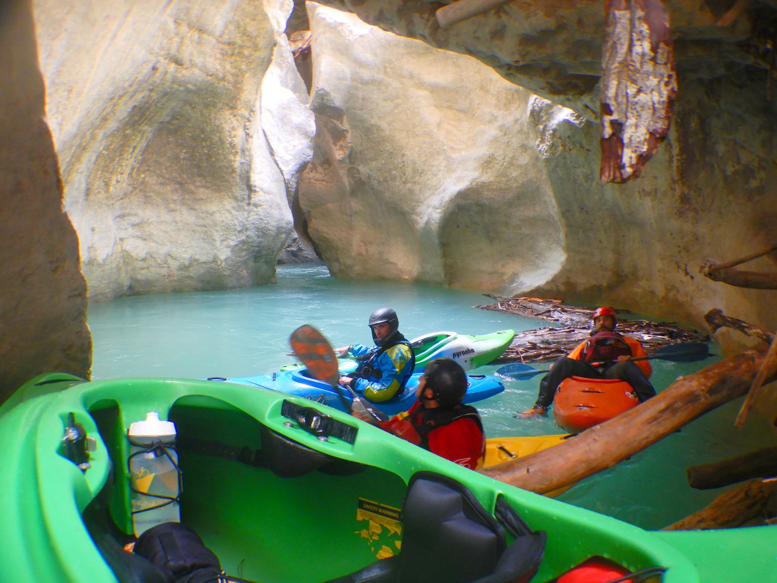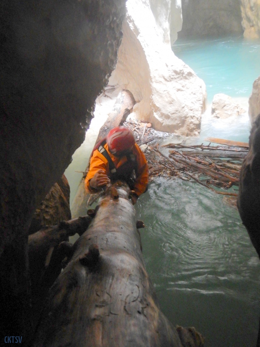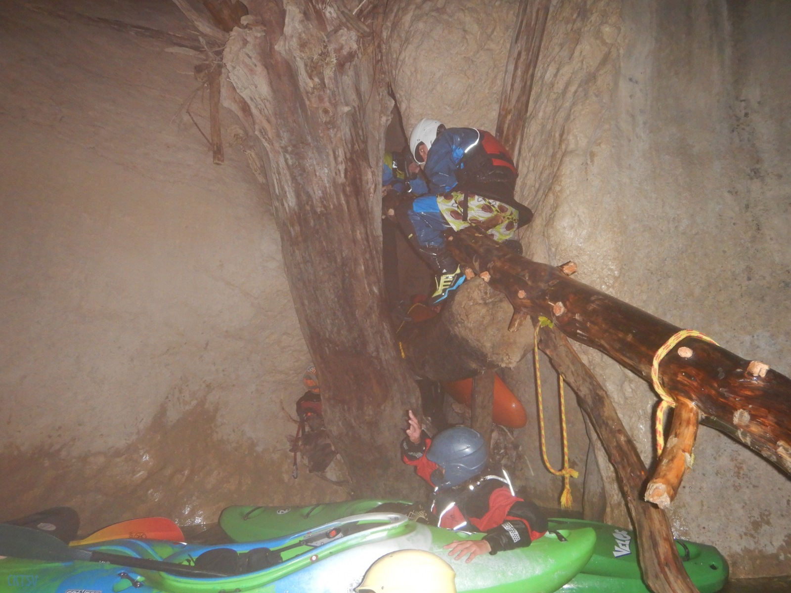 Une fois la petite troupe réunie dans le « plagnol » de l’Imbut, nous constatons la présence de notre groupe d’Italien, empêtré dans un tas de branches et de troncs d’arbres au milieu de l’Imbut. L’ouvreur se serait récrié auprès de Raphael : « Imbut ca passe pas !!!! ». Et en effet, ce fut un long imbroglio de cordes, de kayaks, de kayakistes, de troncs lisses et glissants, pour sortir tant bien que mal de cet embâcle inattendu.