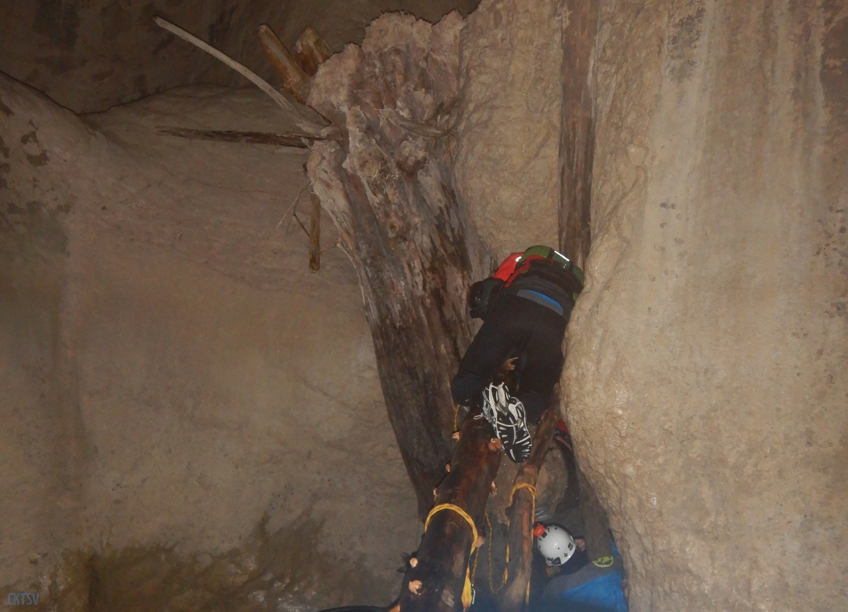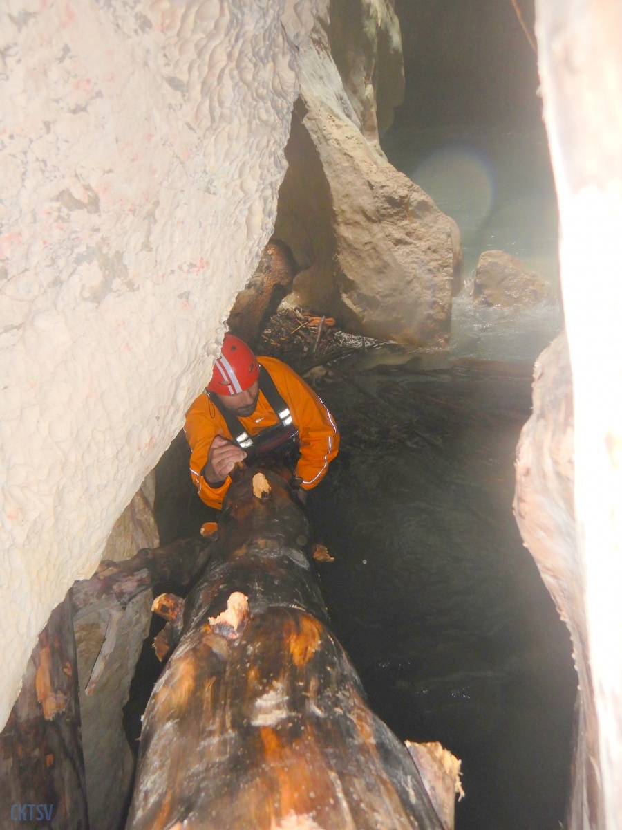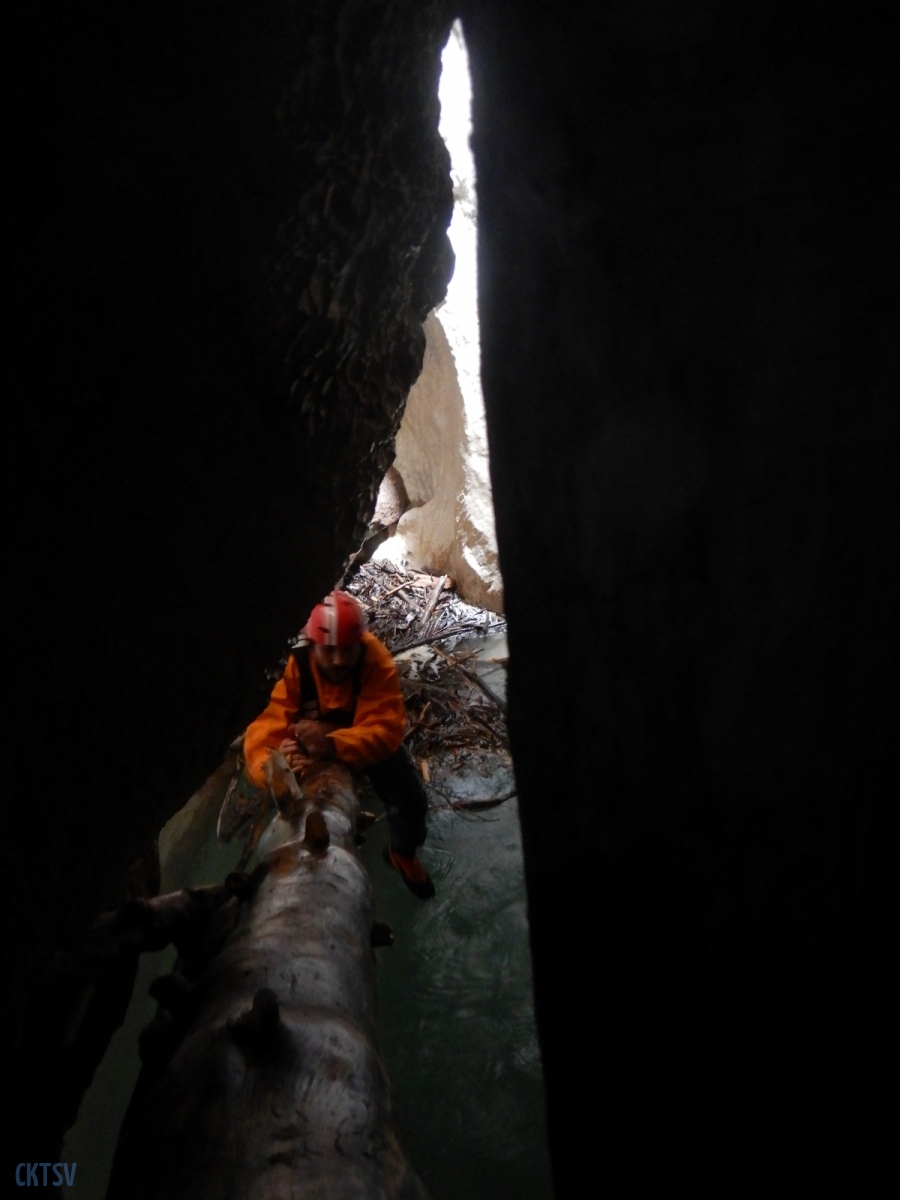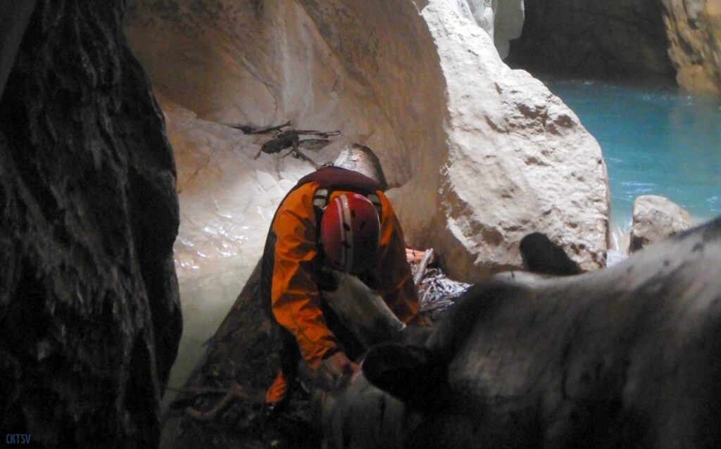 Une fois la petite troupe réunie dans le « plagnol » de l’Imbut, nous constatons la présence de notre groupe d’Italien, empêtré dans un tas de branches et de troncs d’arbres au milieu de l’Imbut. L’ouvreur se serait récrié auprès de Raphael : « Imbut ca passe pas !!!! ». Et en effet, ce fut un long imbroglio de cordes, de kayaks, de kayakistes, de troncs lisses et glissants, pour sortir tant bien que mal de cet embâcle inattendu.