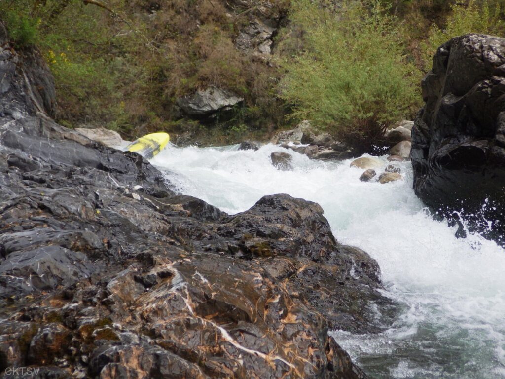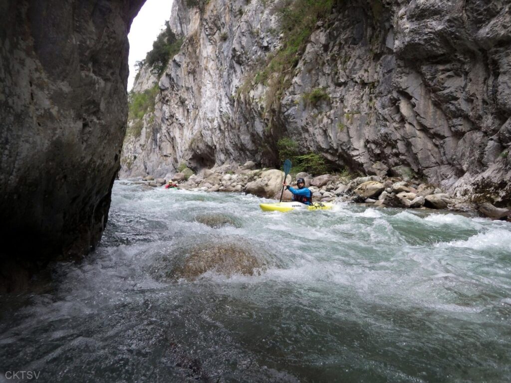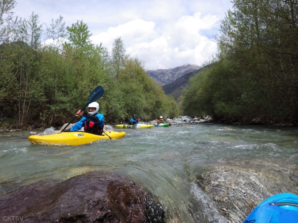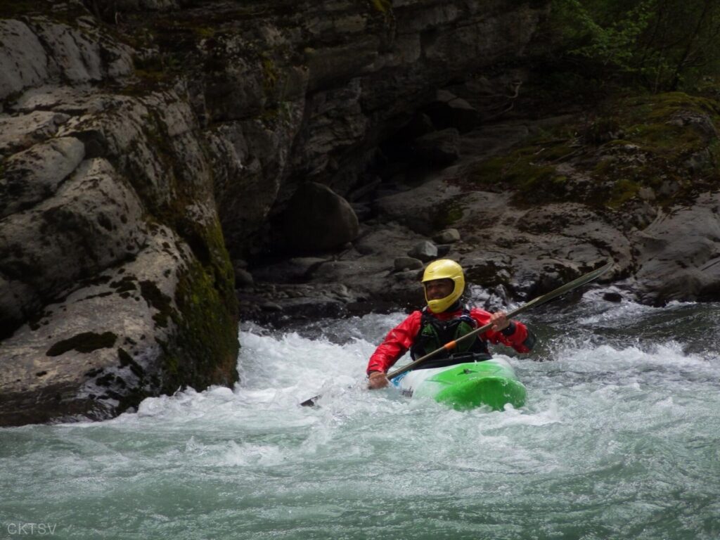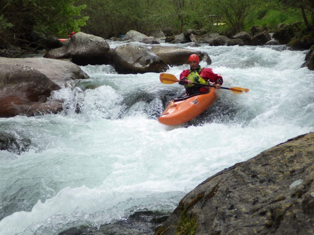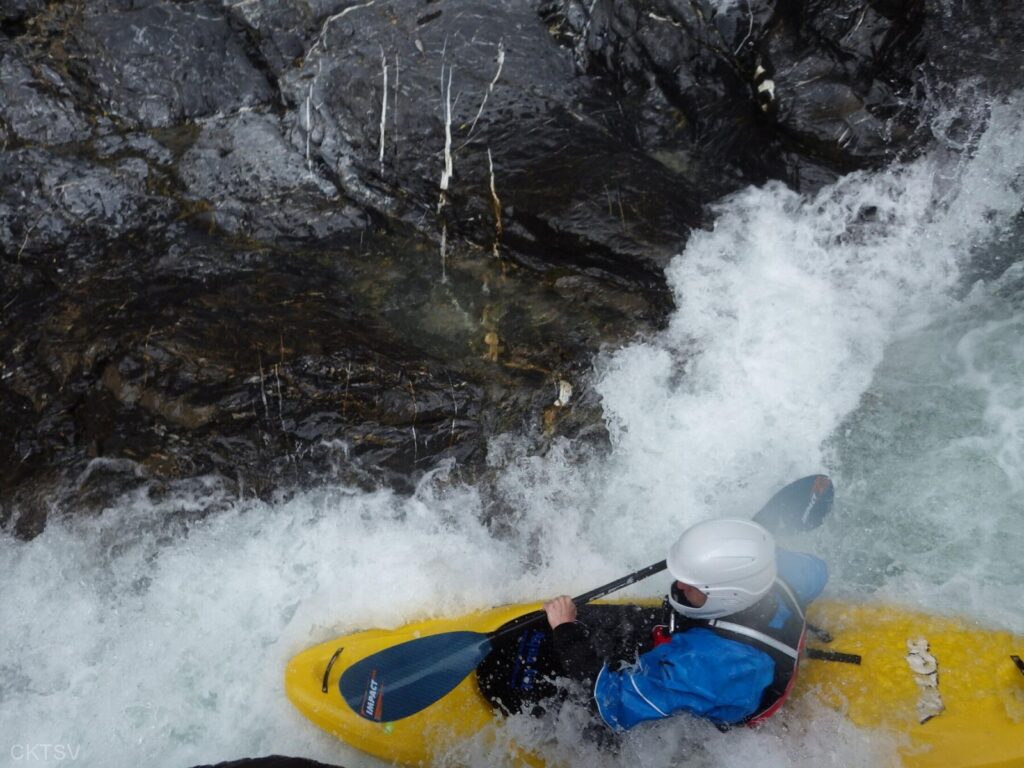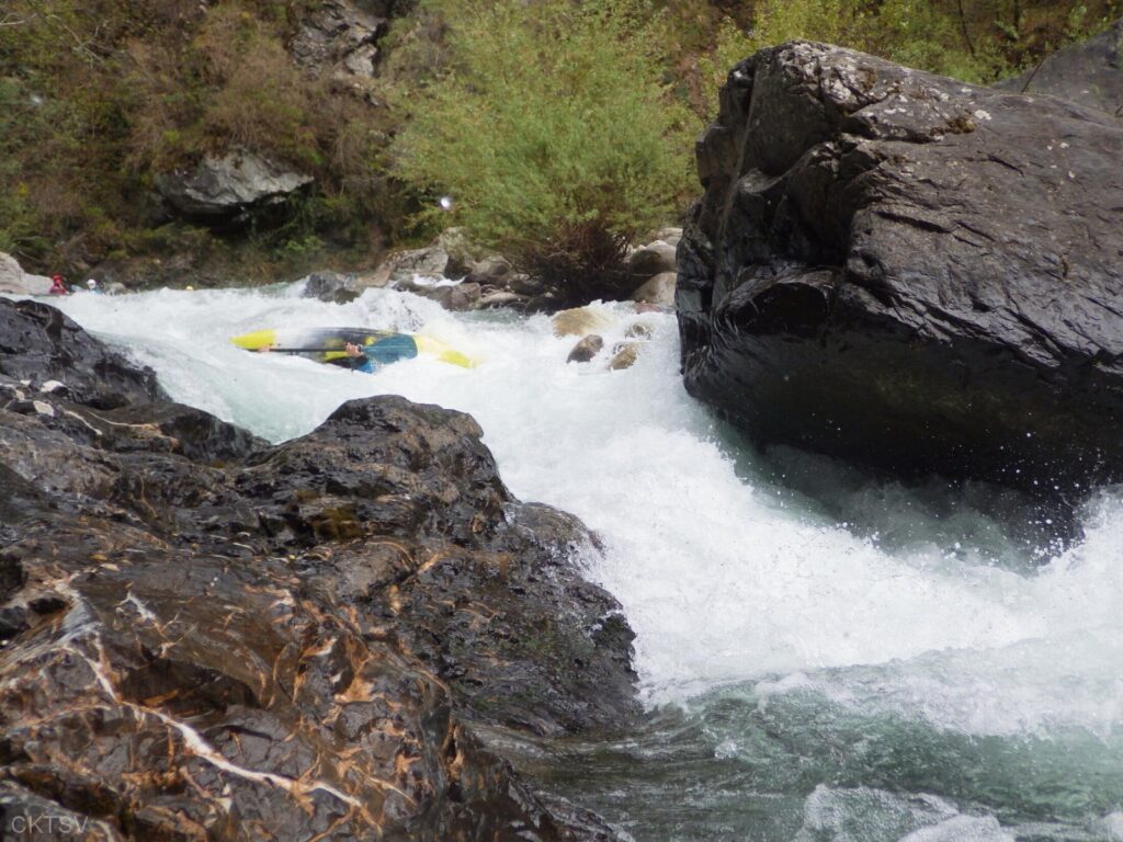 La parcours se déroule sans heurts, jusqu’au moment ou un rocher, un peu fourbe, caché dans un virage, permettra à un kayakiste distrait vraisemblablement par le paysage, de goûter intégralement à la température de l’eau.