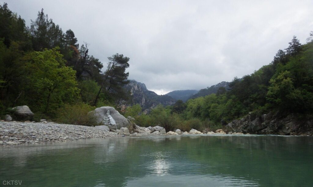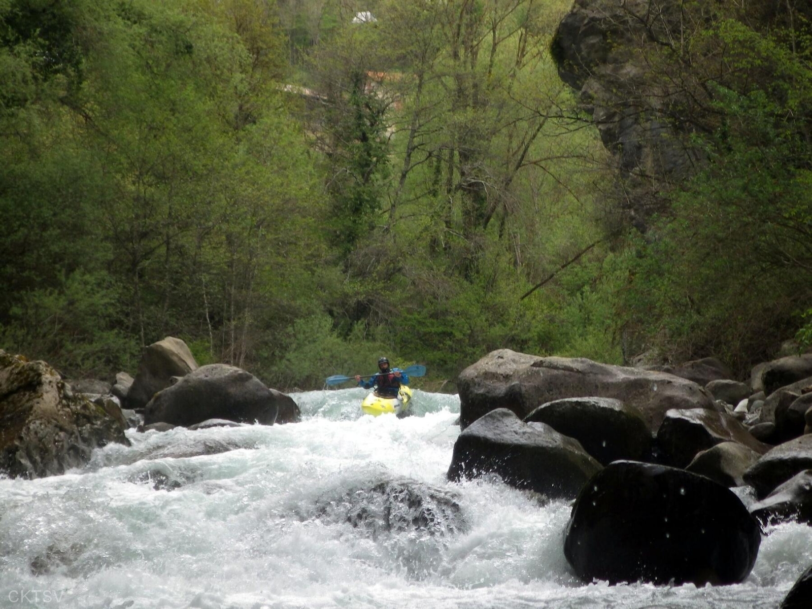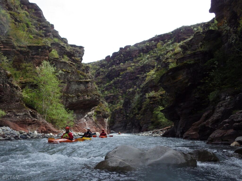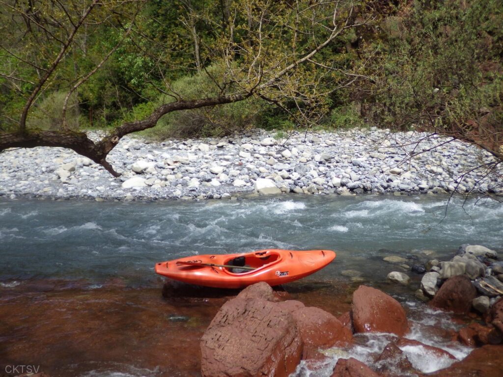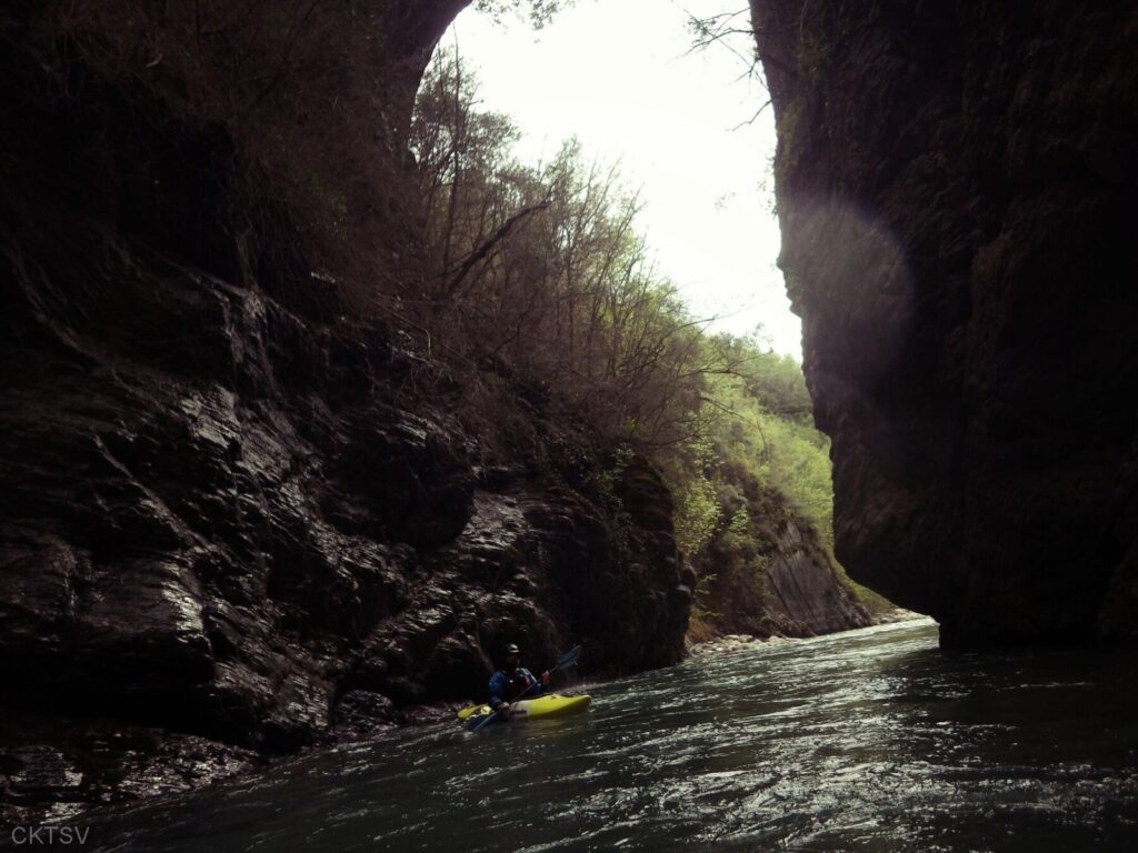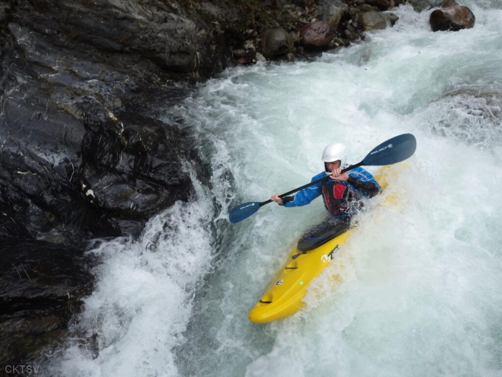 La parcours se déroule sans heurts, jusqu’au moment ou un rocher, un peu fourbe, caché dans un virage, permettra à un kayakiste distrait vraisemblablement par le paysage, de goûter intégralement à la température de l’eau.