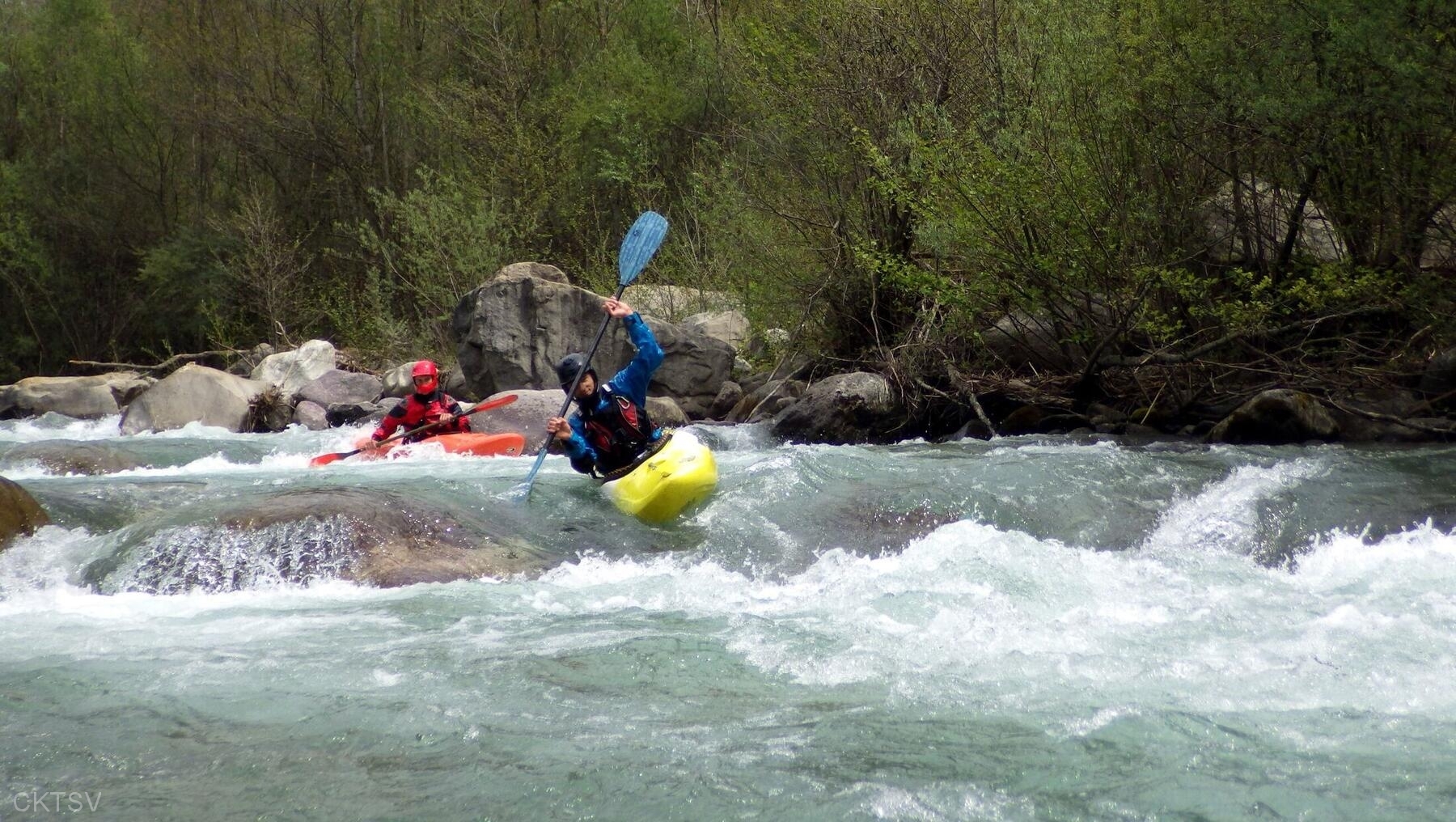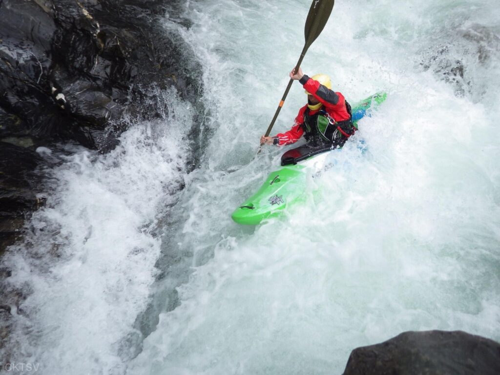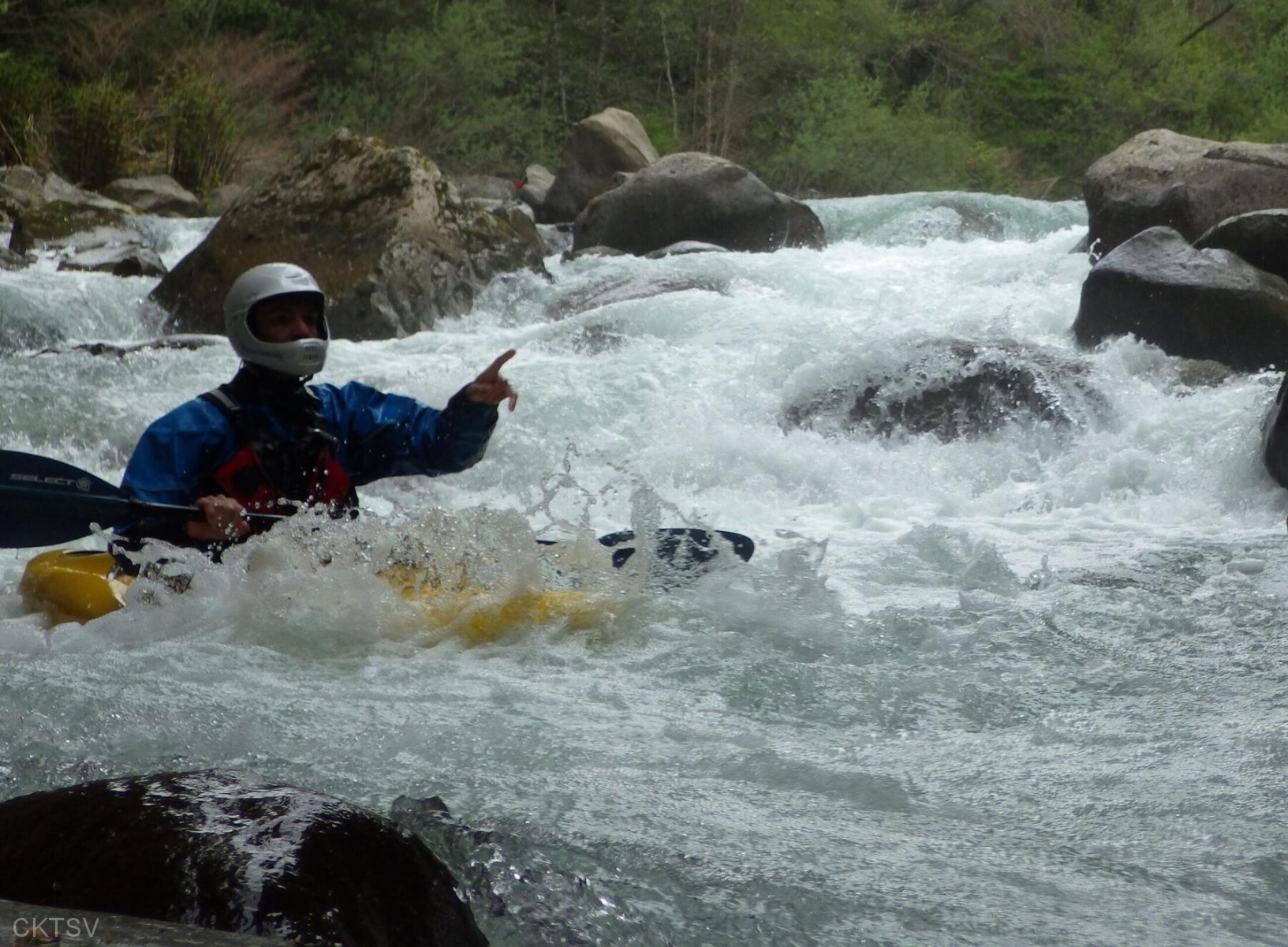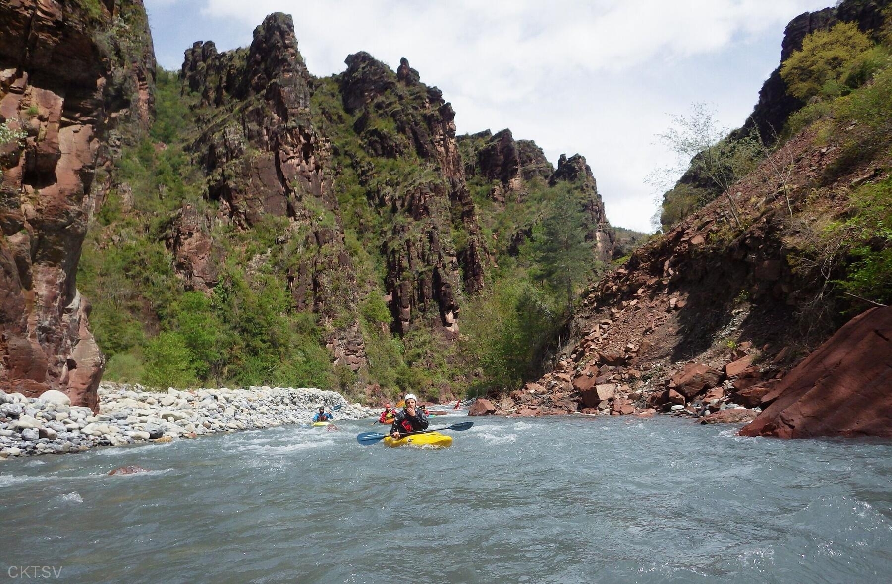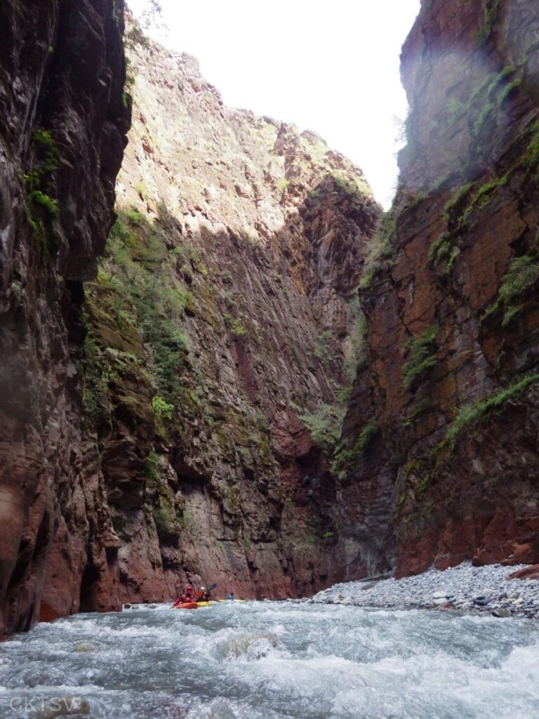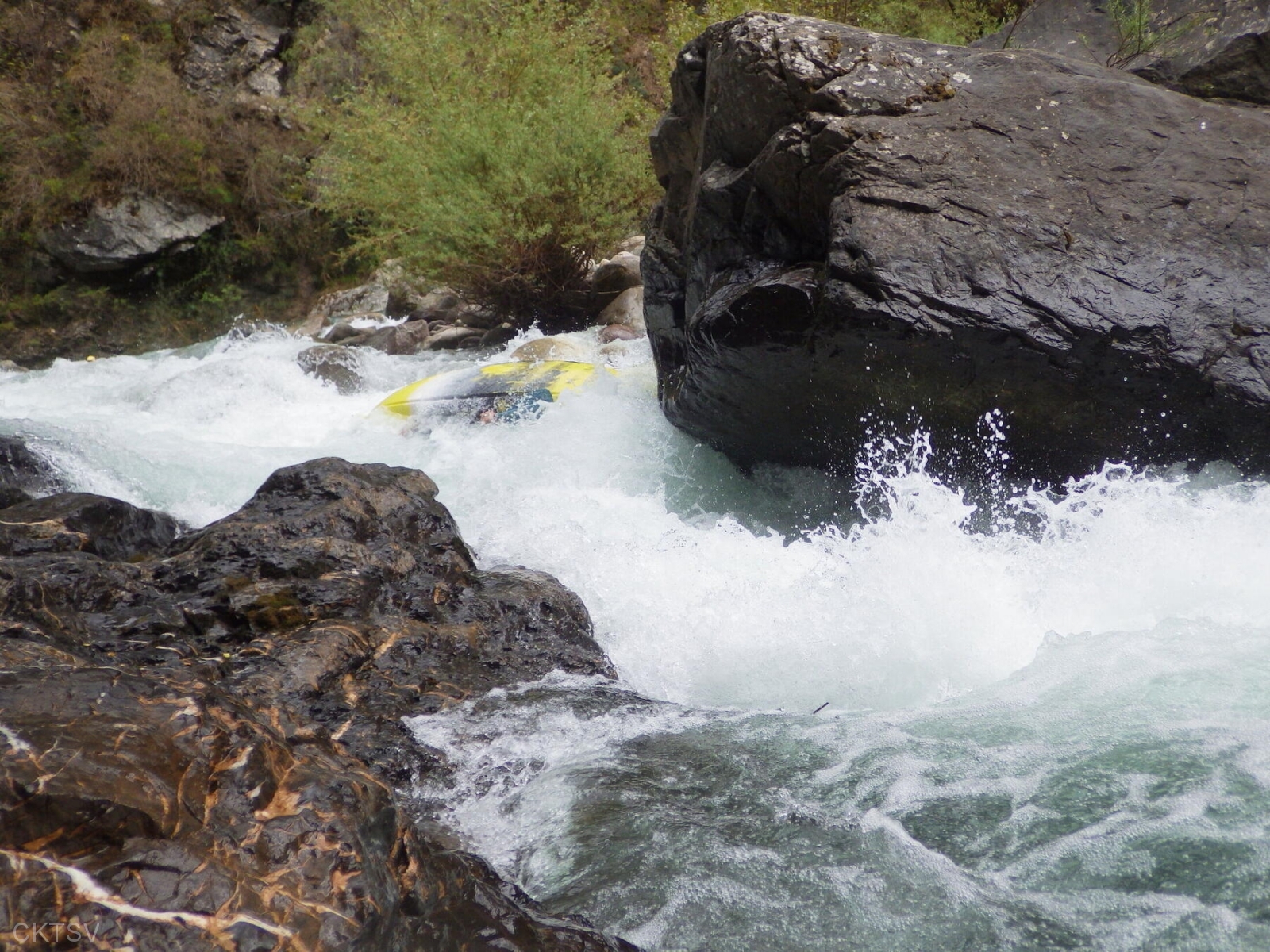 La parcours se déroule sans heurts, jusqu’au moment ou un rocher, un peu fourbe, caché dans un virage, permettra à un kayakiste distrait vraisemblablement par le paysage, de goûter intégralement à la température de l’eau.