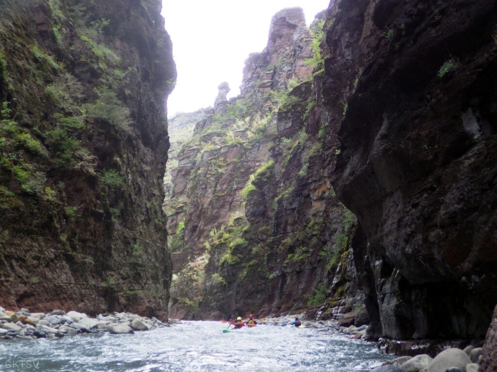 Après une nuit calme sur les bords de l’Esteron nous nous dirigeons vers les rives de la Vésubie avec l’honneur pour une voiture de la gendarmerie qui s’informe de nos occupations sur le chemin du départ, semble-t-il comme nous de passage sur cette route aux voisins vigilants. Nous nous arrêtons à Lantosque pour une reconnaissance des défilés pour faire monter la pression et reconnaitre les deux passages à l’entrée. Après une interview filmé rondement mené par Jérôme pour le camping qui nous autorise à partir de chez eux nous nous engageons à 7 sur la rivière pour réaliser la partie P2 de la rivière. Malgré un niveau moyen-bas de 80cm (fourchette entre 60 et 120) la première partie d’effectue avec de nombreux grattage de roches pour le plus grand plaisir de Nicolas et Florian qui en profitent pour faire leurs nouvelles montures. Eric sur un passage pique une petite tête avant de nous laisser continuer à l’entrée des gorges de Lantosques pour la partie P3. Après une seconde reco à pied nous nous engageons et réussissions brillamment l’entrée des gorges. Nous continuons donc les gorges à vue avec le passage de plusieurs rapides qui poussent malgré le niveau moyen-bas et mobilisent notre concentration ce qui aura pour effet que la moitié du groupe ne notera pas le passage sous le rocher suspendu au-dessus de nos têtes. Stéphane nous fera une figure digne de freestyle à la suite d’un contact avec une roche et passera « le décapiteur » sous l’eau pour une plus grande sécurité. Nous arrivons à notre point d’arrivé au pont du suquet où nous décidons de passer la nuit avec l’autorisation de l’auberge.