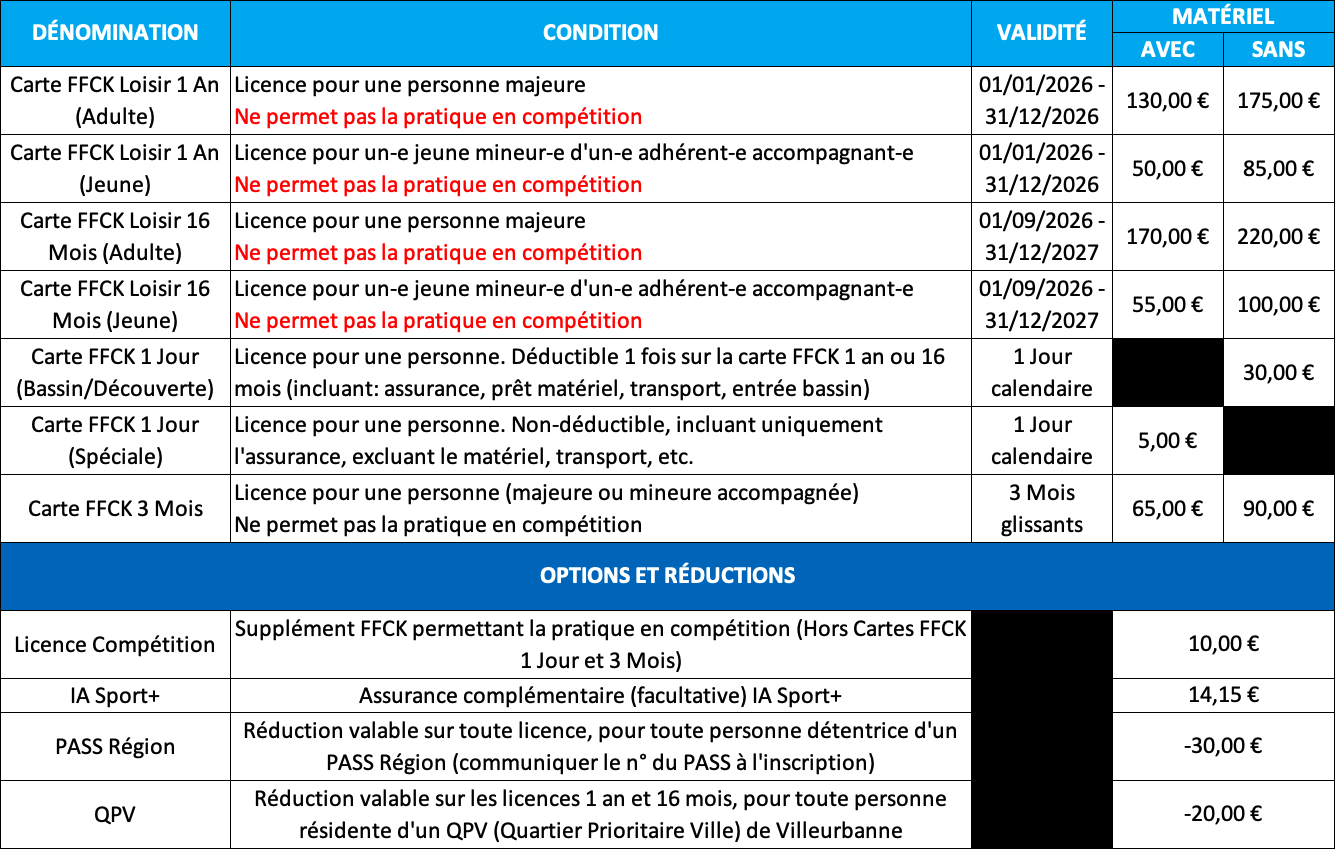 La cotisation comprend la licence FFCK avec une assurance, le prêt du matériel le cas échéant, les frais de transport pour les sorties à la journée à Saint-Pierre-de-Boeuf (rivière artificielle).