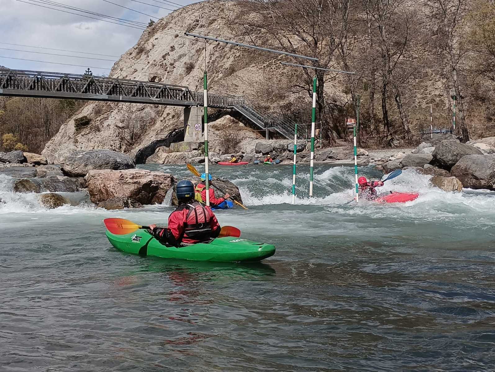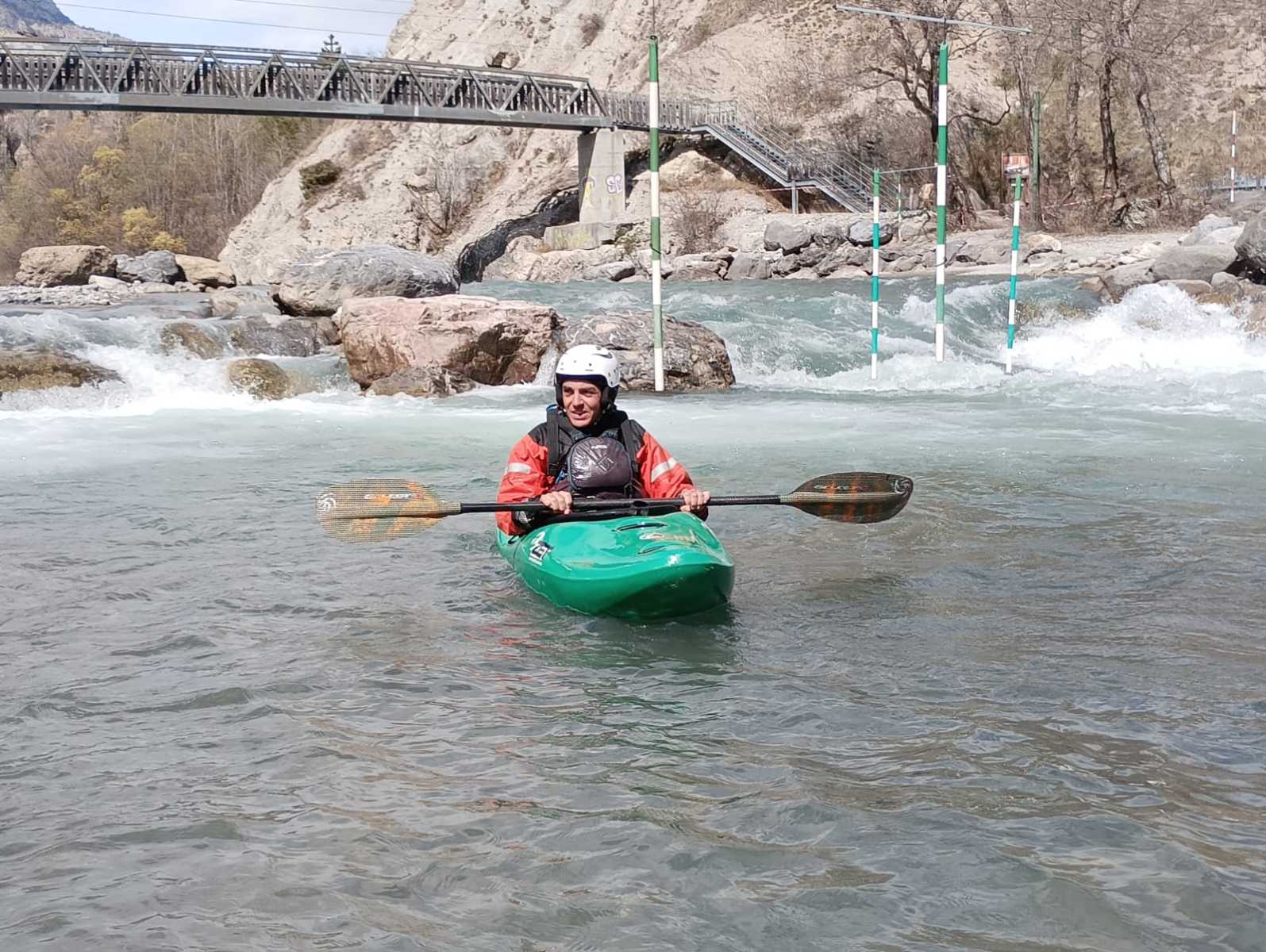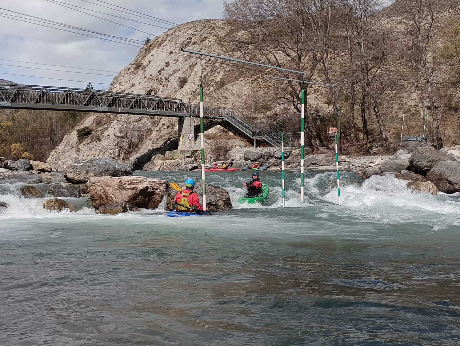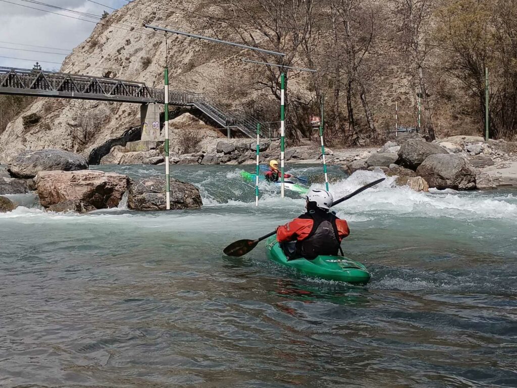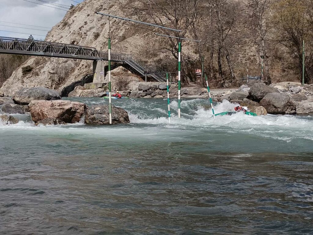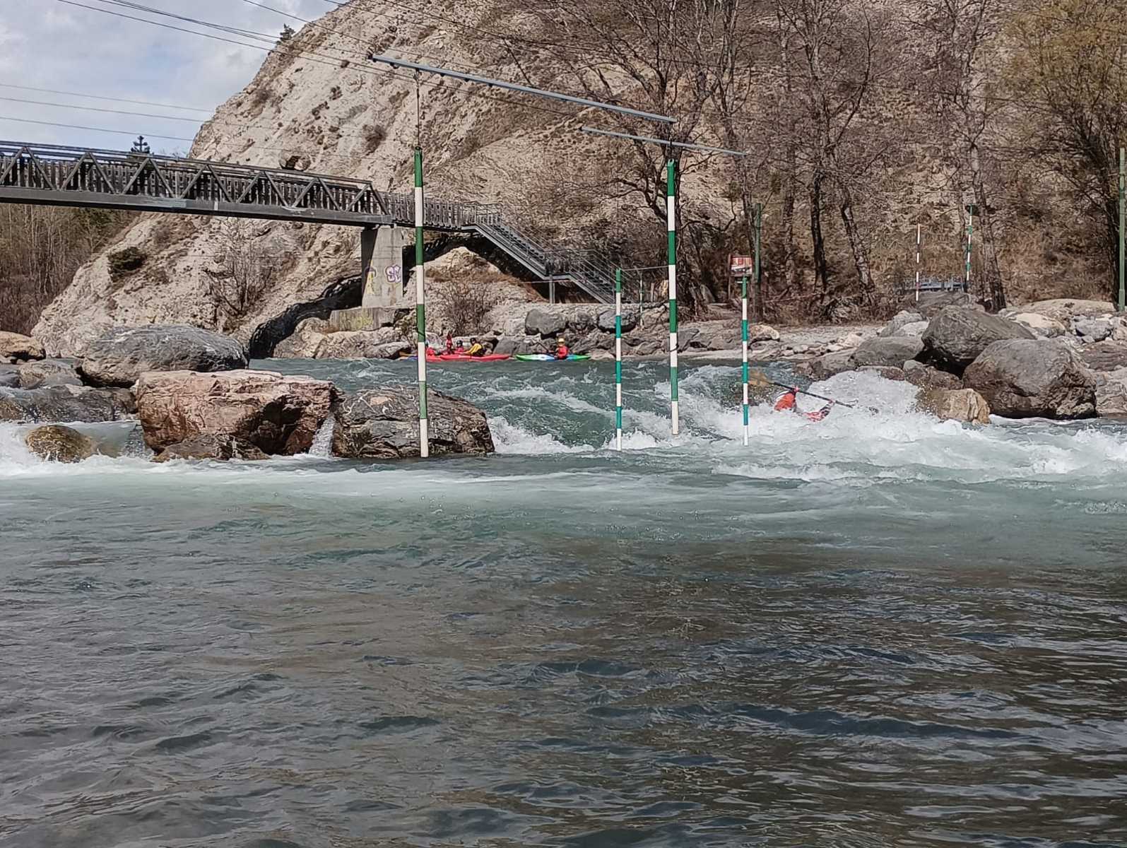 – C’est simple, ici les rochers au milieu de la rivière crééent des mouvements d’eau qui nous permettent de travailler nos « gammes » tout en restant au même endroit. Pour le transport c’est plus simple. On aurait préféré faire une rivière naturelle mais les niveaux sont encore trop juste, il fait encore trop froid . Et puis on a dormi pas loin, et surtout il y a des cafés en ville.