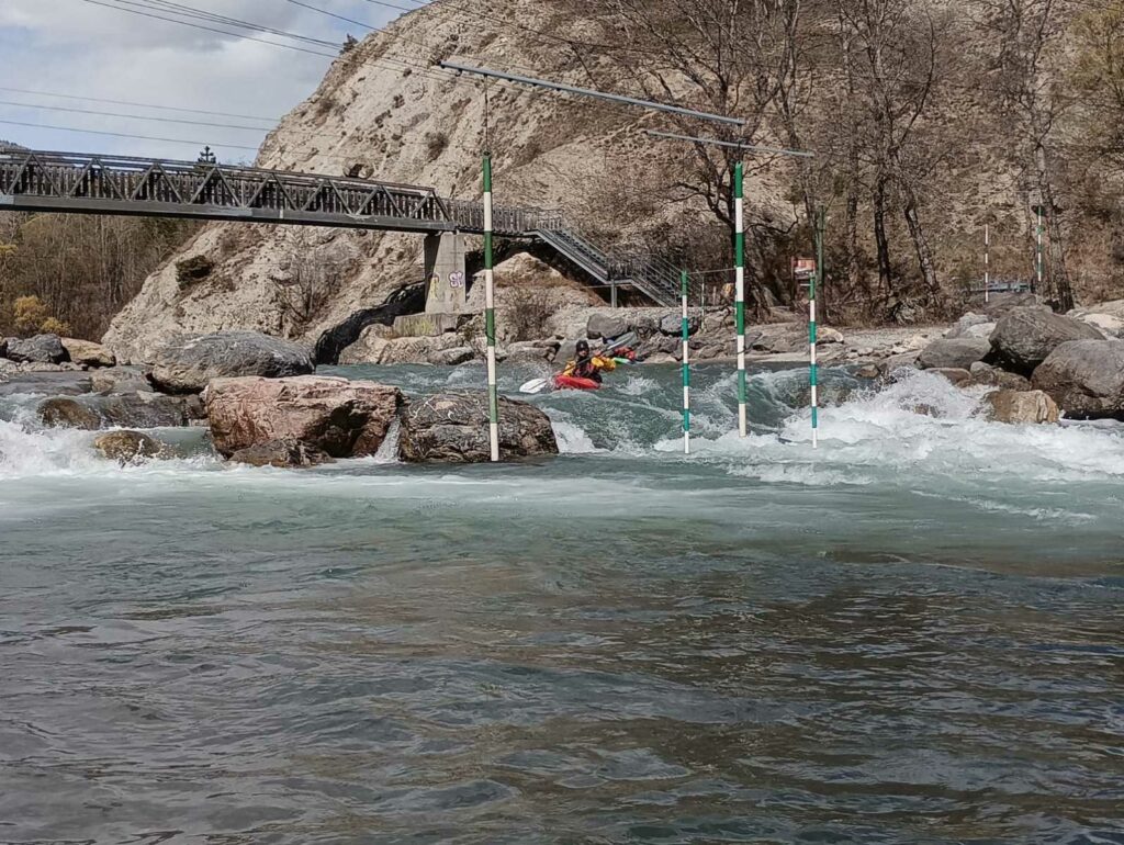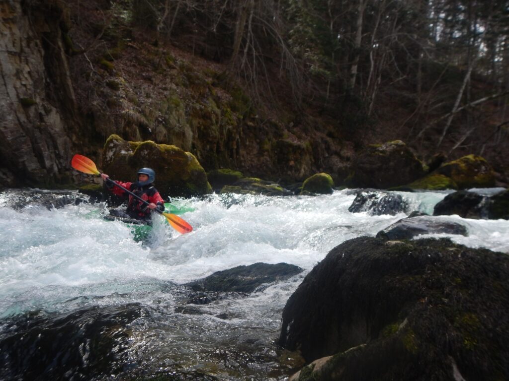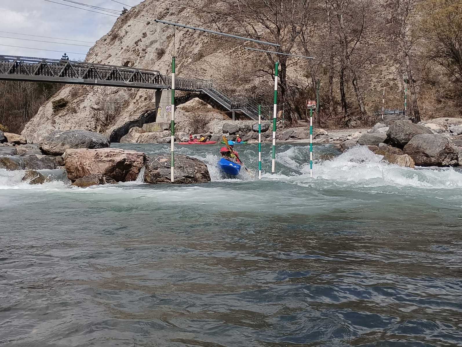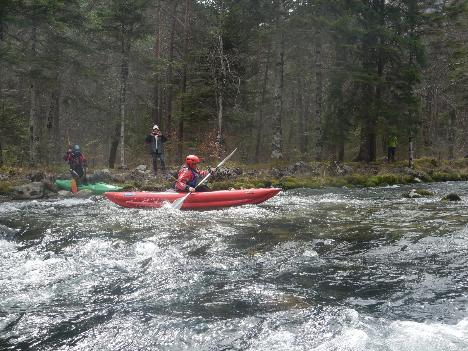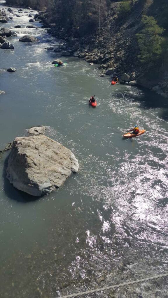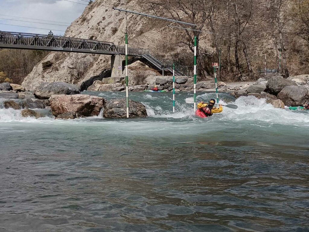 – C’est simple, ici les rochers au milieu de la rivière crééent des mouvements d’eau qui nous permettent de travailler nos « gammes » tout en restant au même endroit. Pour le transport c’est plus simple. On aurait préféré faire une rivière naturelle mais les niveaux sont encore trop juste, il fait encore trop froid . Et puis on a dormi pas loin, et surtout il y a des cafés en ville.