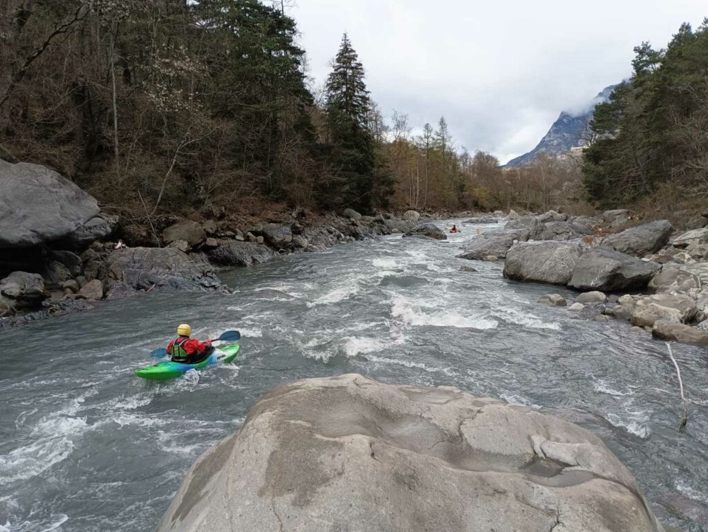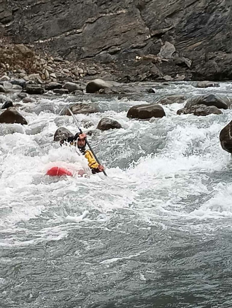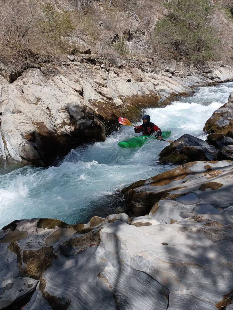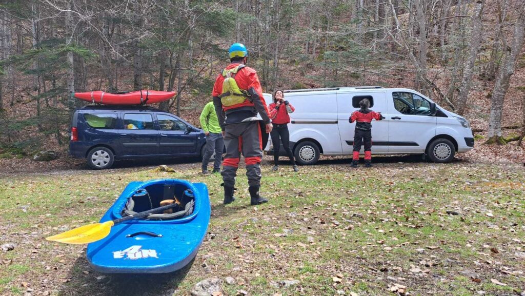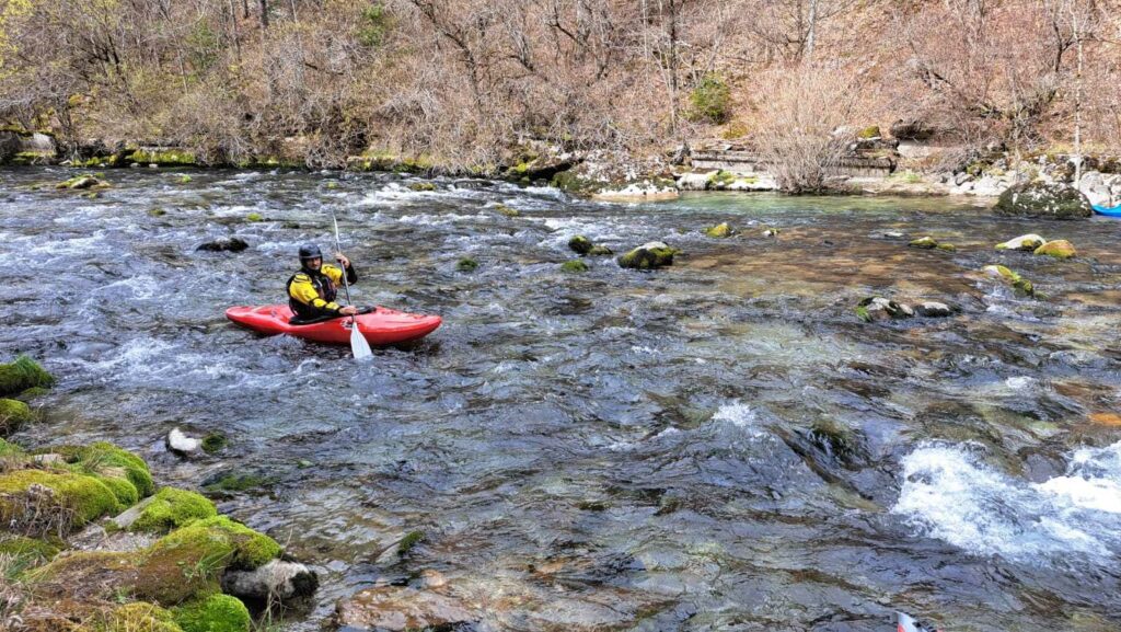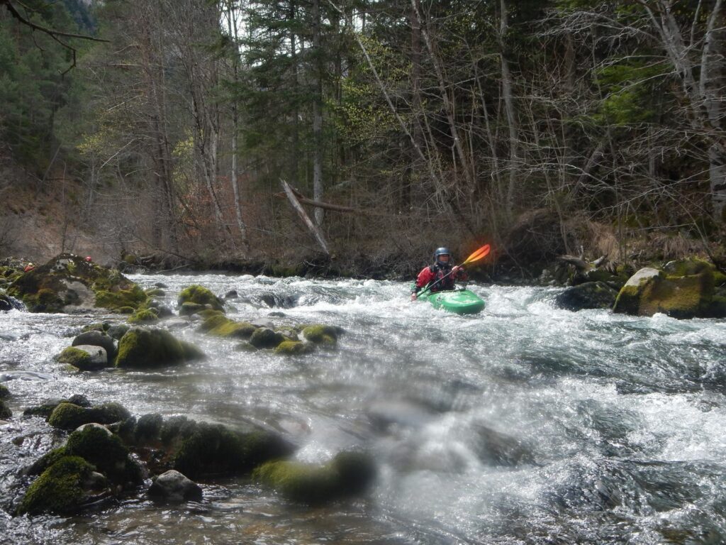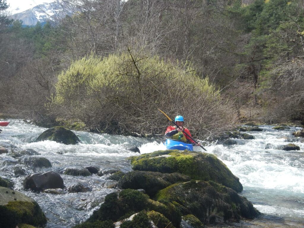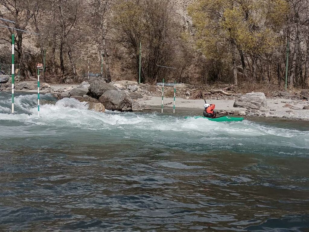– C’est simple, ici les rochers au milieu de la rivière crééent des mouvements d’eau qui nous permettent de travailler nos « gammes » tout en restant au même endroit. Pour le transport c’est plus simple. On aurait préféré faire une rivière naturelle mais les niveaux sont encore trop juste, il fait encore trop froid . Et puis on a dormi pas loin, et surtout il y a des cafés en ville.