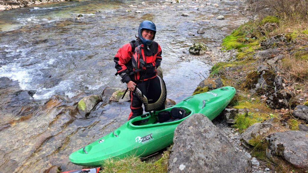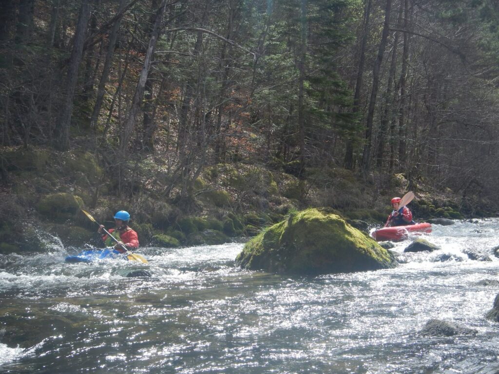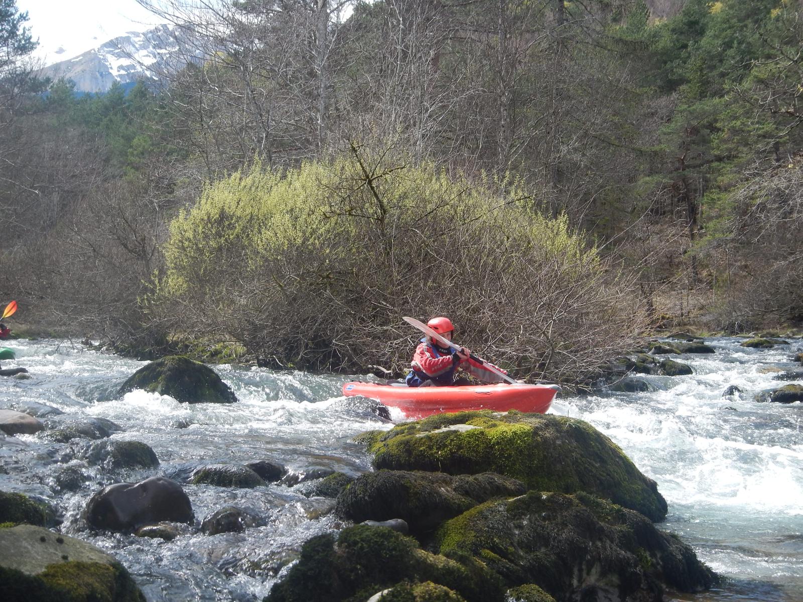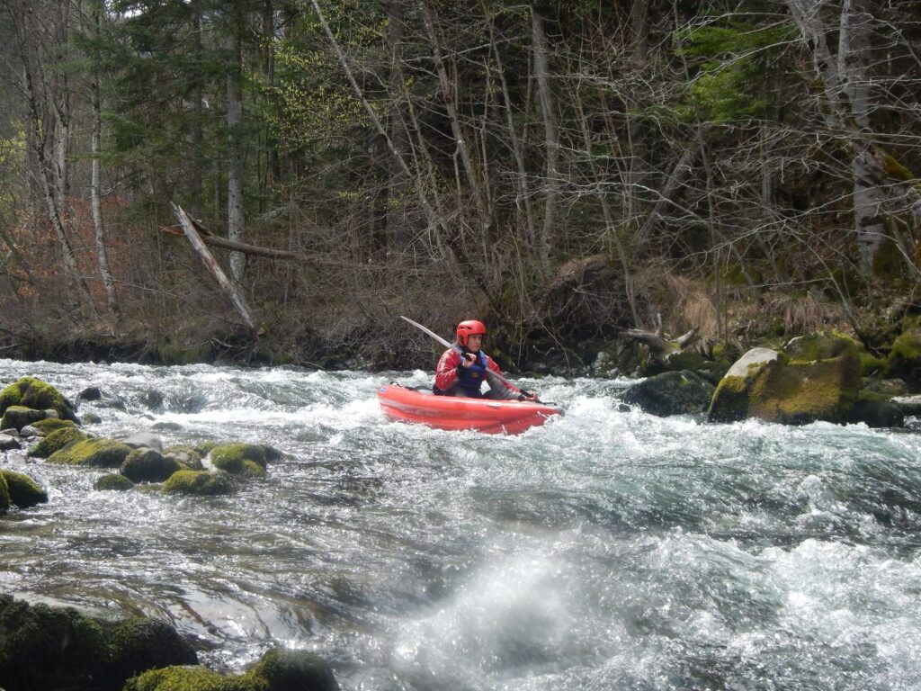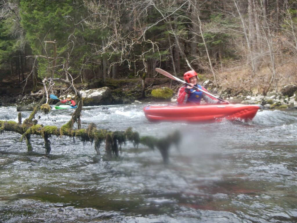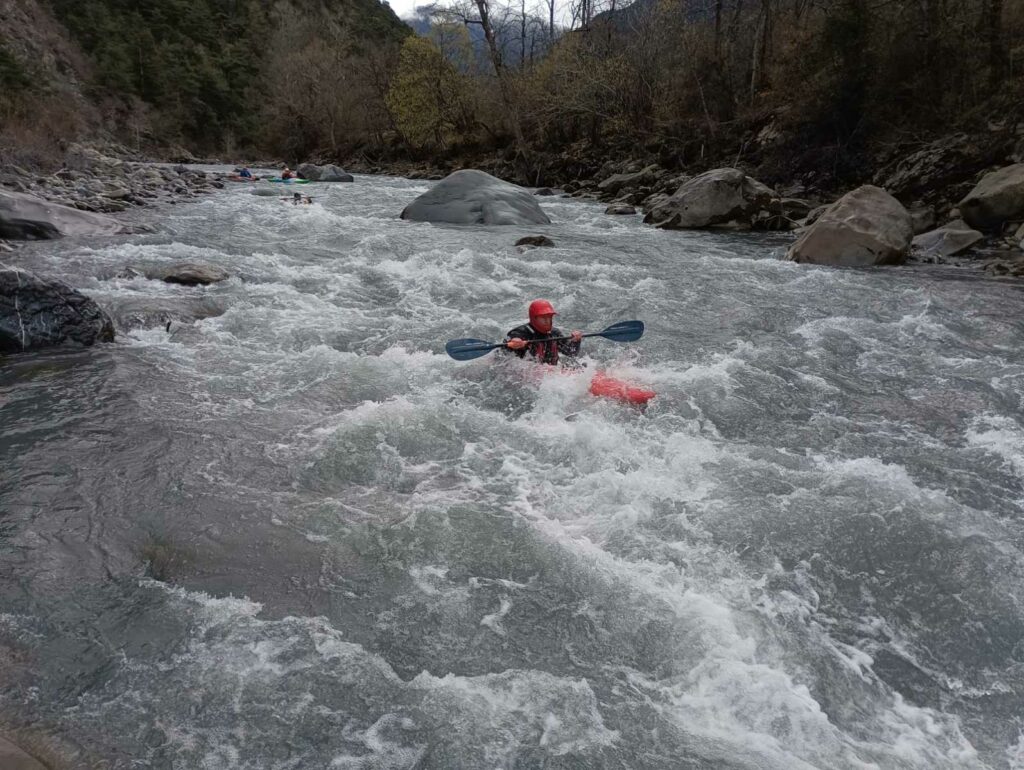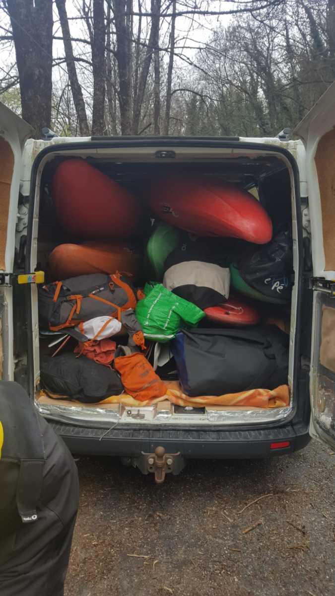 – C’est simple, ici les rochers au milieu de la rivière crééent des mouvements d’eau qui nous permettent de travailler nos « gammes » tout en restant au même endroit. Pour le transport c’est plus simple. On aurait préféré faire une rivière naturelle mais les niveaux sont encore trop juste, il fait encore trop froid . Et puis on a dormi pas loin, et surtout il y a des cafés en ville.