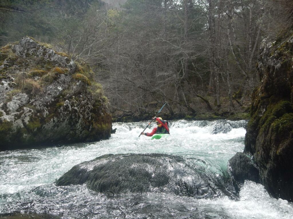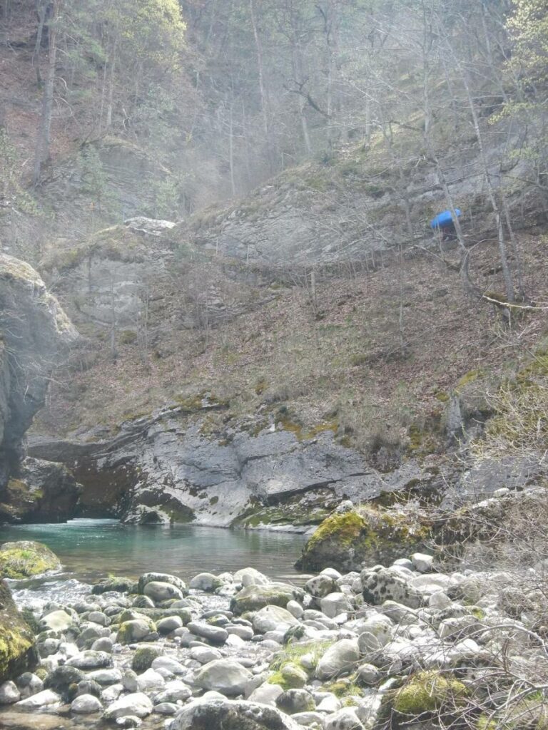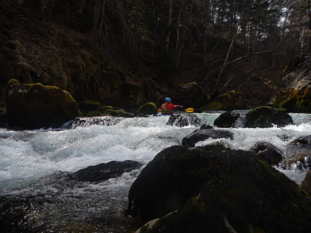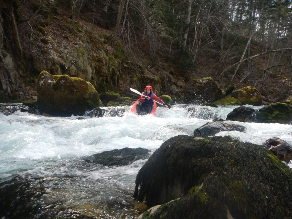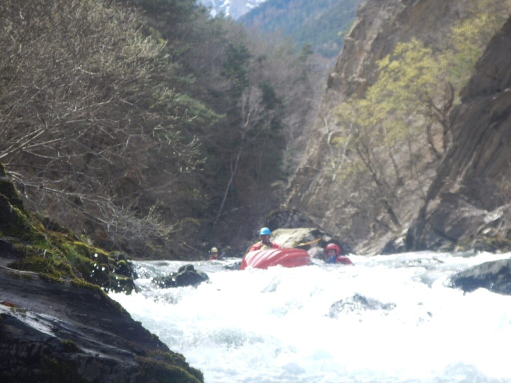 1ere étape du séjour, La Bonne. Une rivière indiquée comme « classique » par les pratiquants de ce sport. Mais cependant, le C K T S V, ce club de la banlieue lyonnaise n’a pas navigué dessus depuis fort longtemps, à vrai dire depuis qu’un portage à la réputation compliquée est apparu sur la rivière suite à un éboulement. Mais quelques participants l’ont tout de même navigué, ici il y a 1 an, ici il y a 2 semaines. 42 cm, c’est le niveau qu’indique l’échelle. Niveau qui plus est, idéal pour le groupe car certains découvre la rivière, d’autres reprennent le kayak. Les 6 kayaks, et le gonflable. Car, oui, il y a un gonflable et l’inauguration de celui-ci sera une belle réussite. Et le portage, bien que notable aura pu être contourné en remontant la loupe de glissement et en passant dans les prés. A l’arrivée, une question se pose, il y a t’il des motivés pour rajouter 30mn de navigation et 30 mn de remontée à pied ? Il s’agit ici de poursuivre sur la section basse en utilisant un passage que nous garderons secret, mais au combien impressionnant. Tout s’est bien passé, voilà qui aurait dû mettre la puce à l’oreille de ces personnes accros aux sensations et aux turpitudes de la vie. A leur retour de navette, les conducteurs se rendent compte que l’une des voiture a été fracturée et des affaires volées. Mais ce n’est pas ici l’objet de cette émission, nous y reviendrons, si vous le voulez bien, une prochaine fois. Le soir refuge sera trouvé sur les bord de la Souloise.