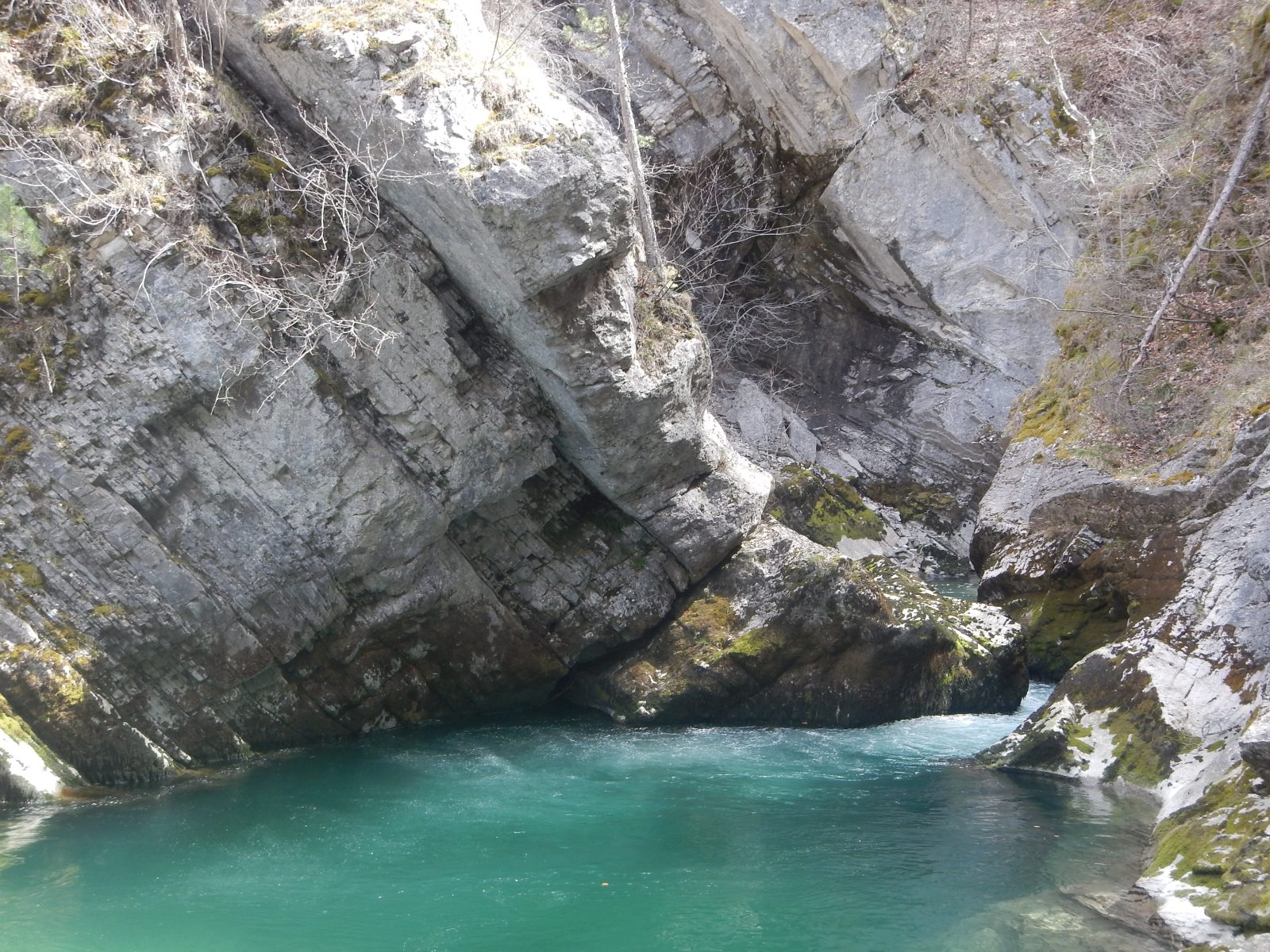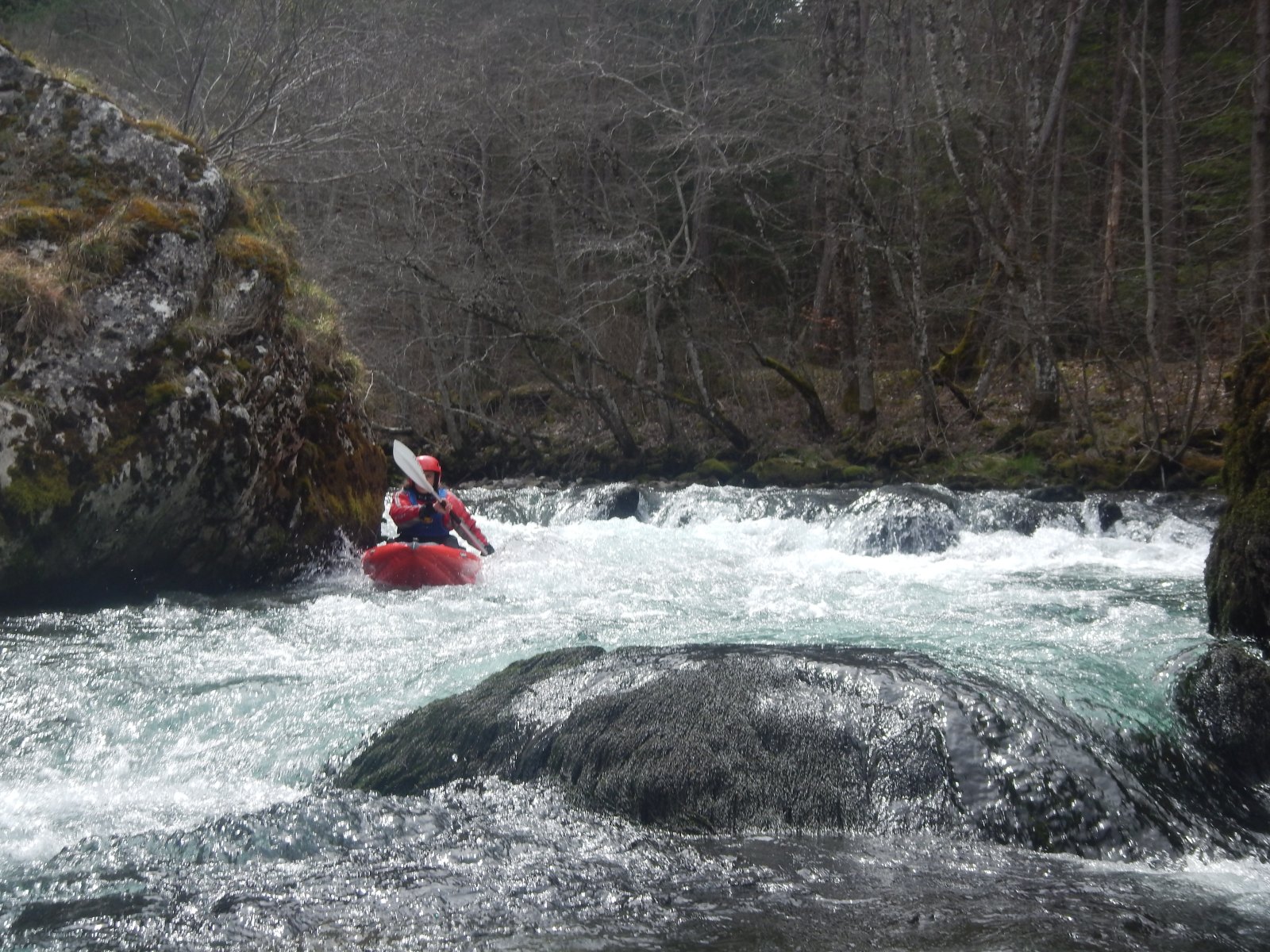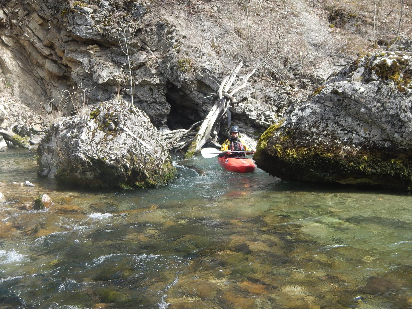 1ere étape du séjour, La Bonne. Une rivière indiquée comme « classique » par les pratiquants de ce sport. Mais cependant, le C K T S V, ce club de la banlieue lyonnaise n’a pas navigué dessus depuis fort longtemps, à vrai dire depuis qu’un portage à la réputation compliquée est apparu sur la rivière suite à un éboulement. Mais quelques participants l’ont tout de même navigué, ici il y a 1 an, ici il y a 2 semaines. 42 cm, c’est le niveau qu’indique l’échelle. Niveau qui plus est, idéal pour le groupe car certains découvre la rivière, d’autres reprennent le kayak. Les 6 kayaks, et le gonflable. Car, oui, il y a un gonflable et l’inauguration de celui-ci sera une belle réussite. Et le portage, bien que notable aura pu être contourné en remontant la loupe de glissement et en passant dans les prés. A l’arrivée, une question se pose, il y a t’il des motivés pour rajouter 30mn de navigation et 30 mn de remontée à pied ? Il s’agit ici de poursuivre sur la section basse en utilisant un passage que nous garderons secret, mais au combien impressionnant. Tout s’est bien passé, voilà qui aurait dû mettre la puce à l’oreille de ces personnes accros aux sensations et aux turpitudes de la vie. A leur retour de navette, les conducteurs se rendent compte que l’une des voiture a été fracturée et des affaires volées. Mais ce n’est pas ici l’objet de cette émission, nous y reviendrons, si vous le voulez bien, une prochaine fois. Le soir refuge sera trouvé sur les bord de la Souloise.