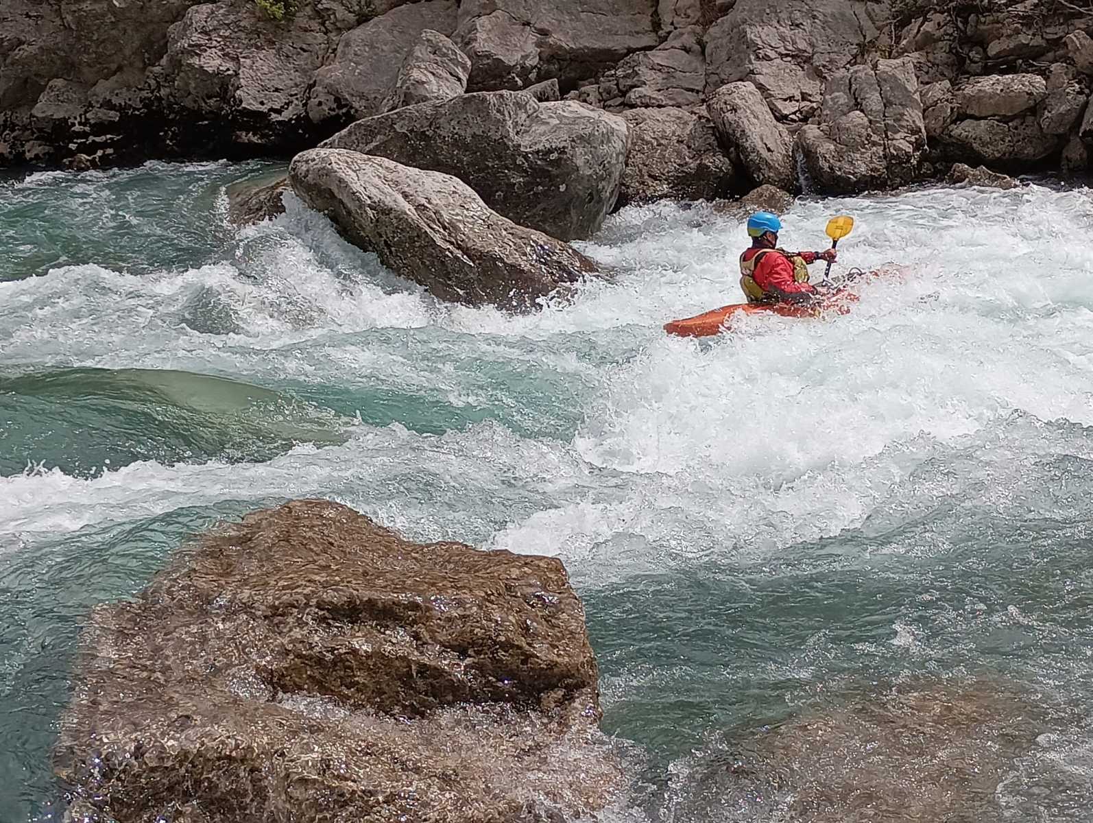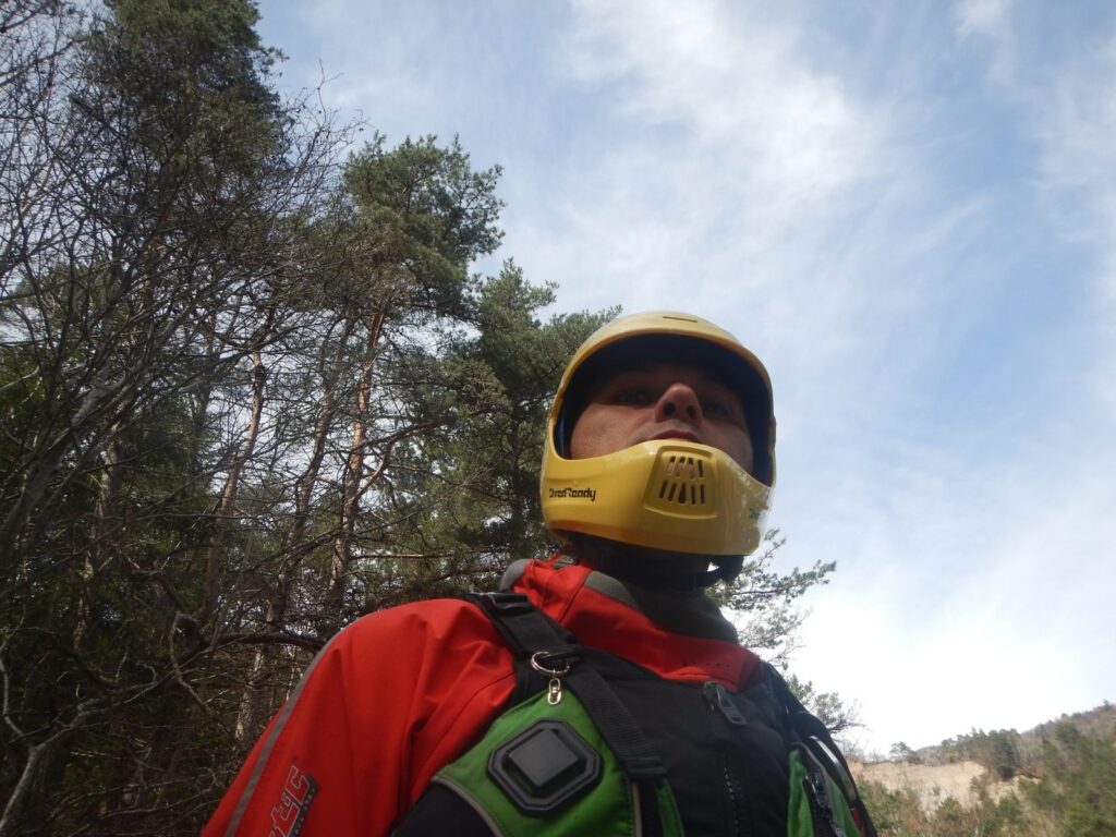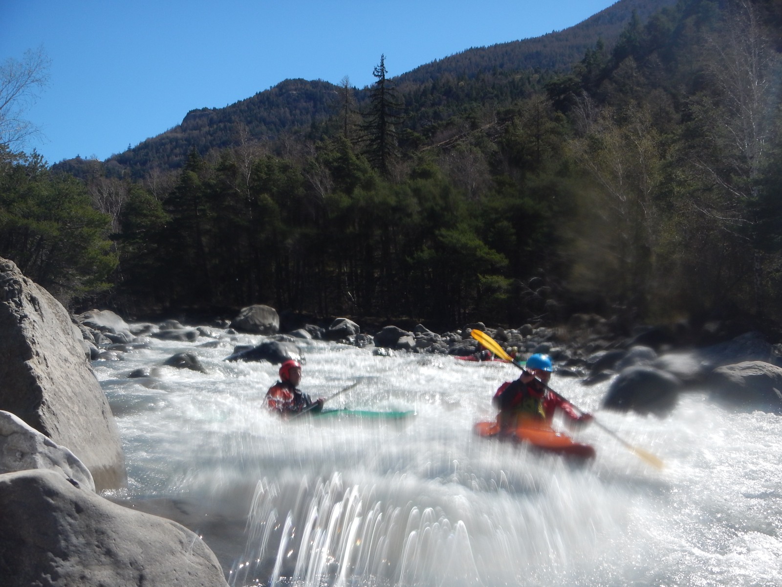 – Jérome qui s’arrête dans un micro stop fuyant en pleine grille et Laurie qui veut suivre à l’identique qui marque aussi ce stop, j’ai beau être une rivière avec des années de partage avec les kayakistes, je reste impresionnée. Mais aussi la présence surprise de Pierre-Yves et Raphael bien heureux qu’un allemand lui prête un casque (à pointe?).