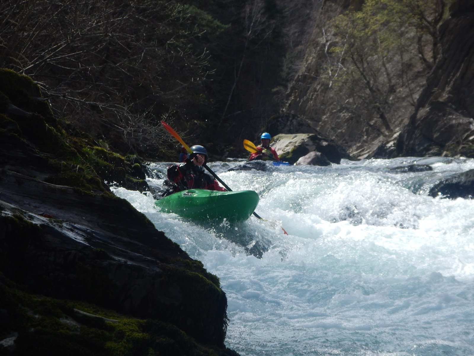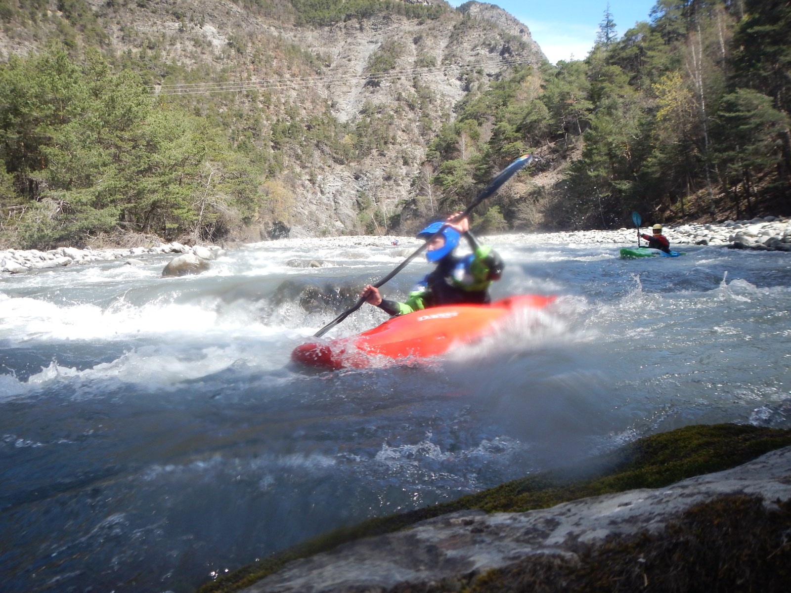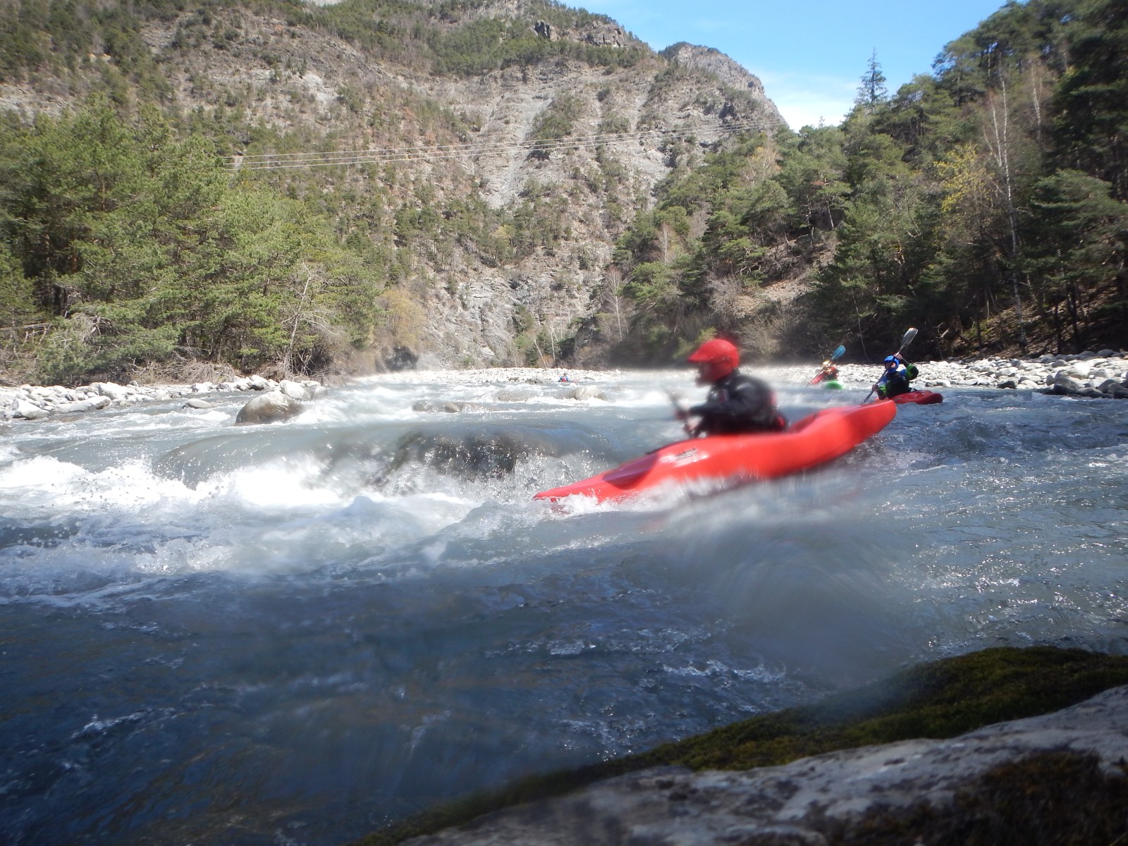 – Jérome qui s’arrête dans un micro stop fuyant en pleine grille et Laurie qui veut suivre à l’identique qui marque aussi ce stop, j’ai beau être une rivière avec des années de partage avec les kayakistes, je reste impresionnée. Mais aussi la présence surprise de Pierre-Yves et Raphael bien heureux qu’un allemand lui prête un casque (à pointe?).