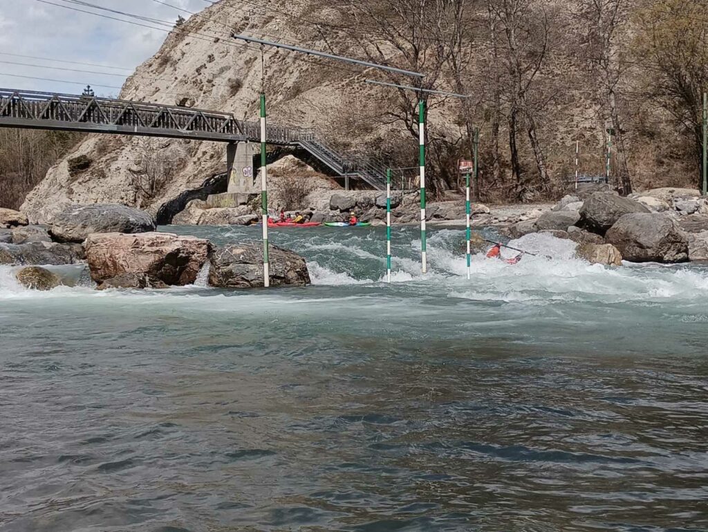 Aujourd’hui je me trouve à l’Argentière et je me balade le long du bassin de slalom, c’est une portion de la rivière où les canoé kayak s’entraînent à passer entre des bâtons suspendus au dessus de l’eau et à remonter le courant. Il n’y a pas beaucoup de monde mais j’ai pû discuter avec un petit groupe de kayakistes lyonnais.