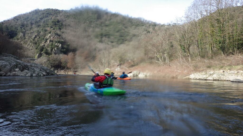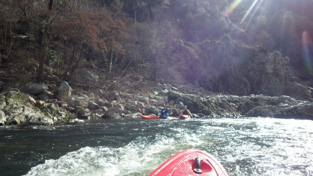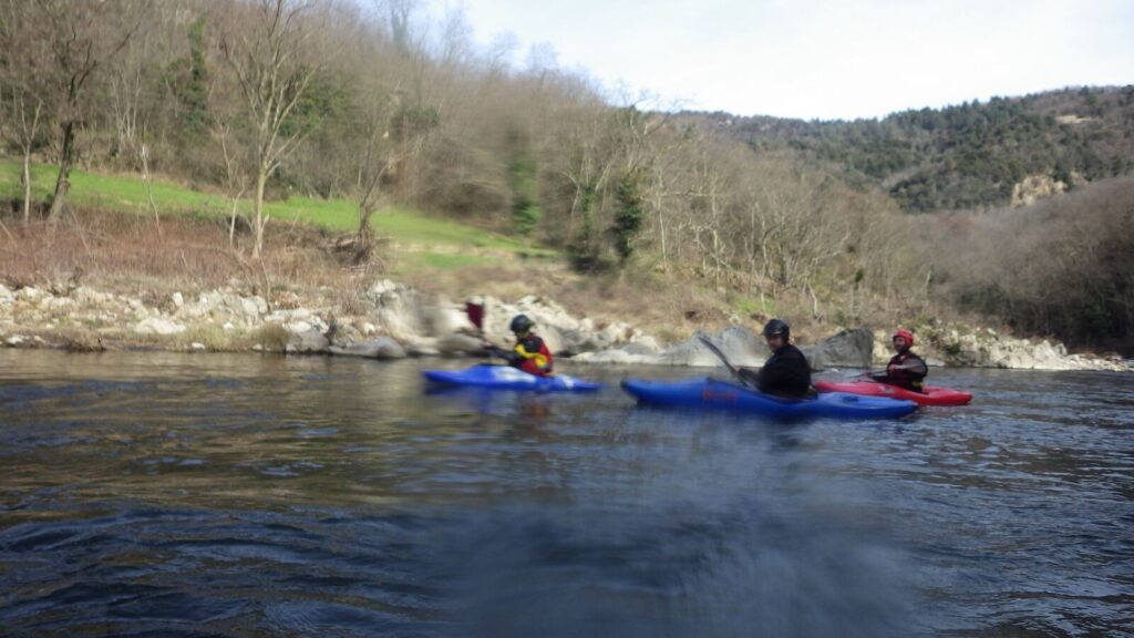 Kiki réussi un esquimau mais se prend finalement un bain un peu plus loin. Clément s’enfile 2 premiers petits bains dont un où il fera le sandwich entre un rocher et le kayak de Raph qui passait tranquillement par là. Puis un 3ème un peu plus costaud sur le rapide de l’usine, malgré un briefing de Raph : « Ça passe au milieu, légèrement à gauche, et vous vous arrêtez dans le contre à gauche si vous pouvez, pour voir la suite du rapide ». Clément n’est pas allé jusque-là… mais il est bien resté au milieu, la tête légèrement enfoncée sous l’eau.
